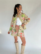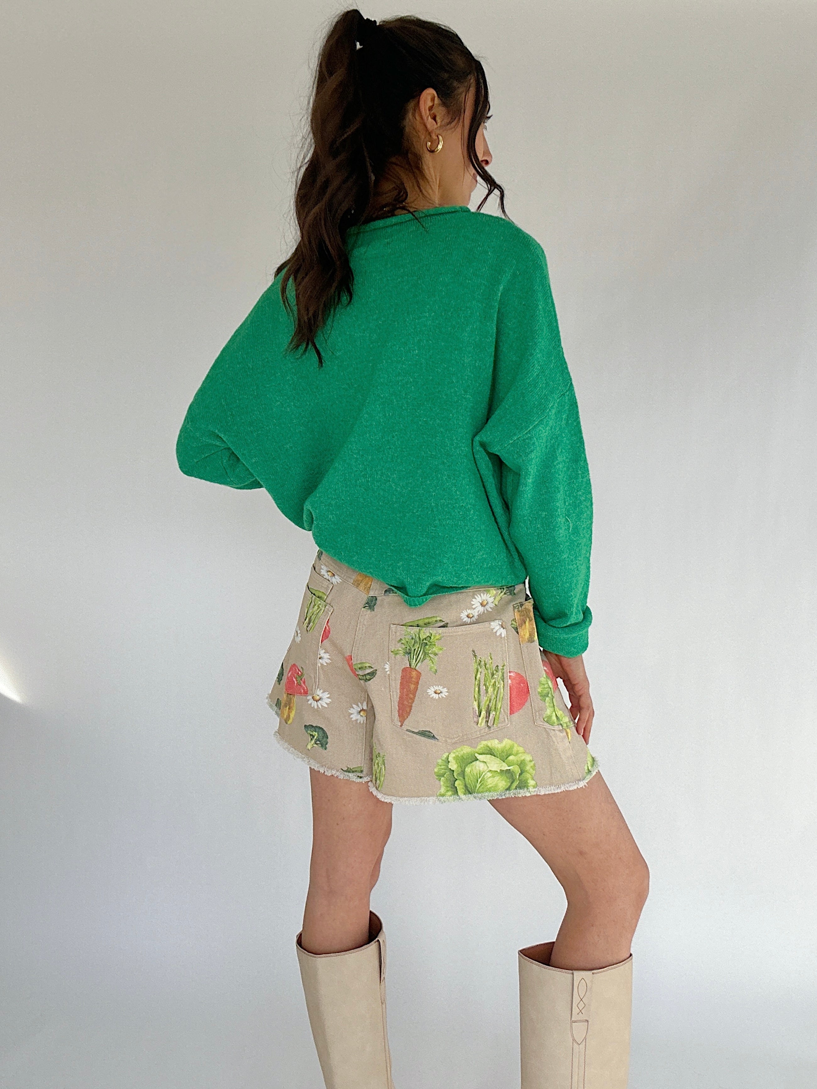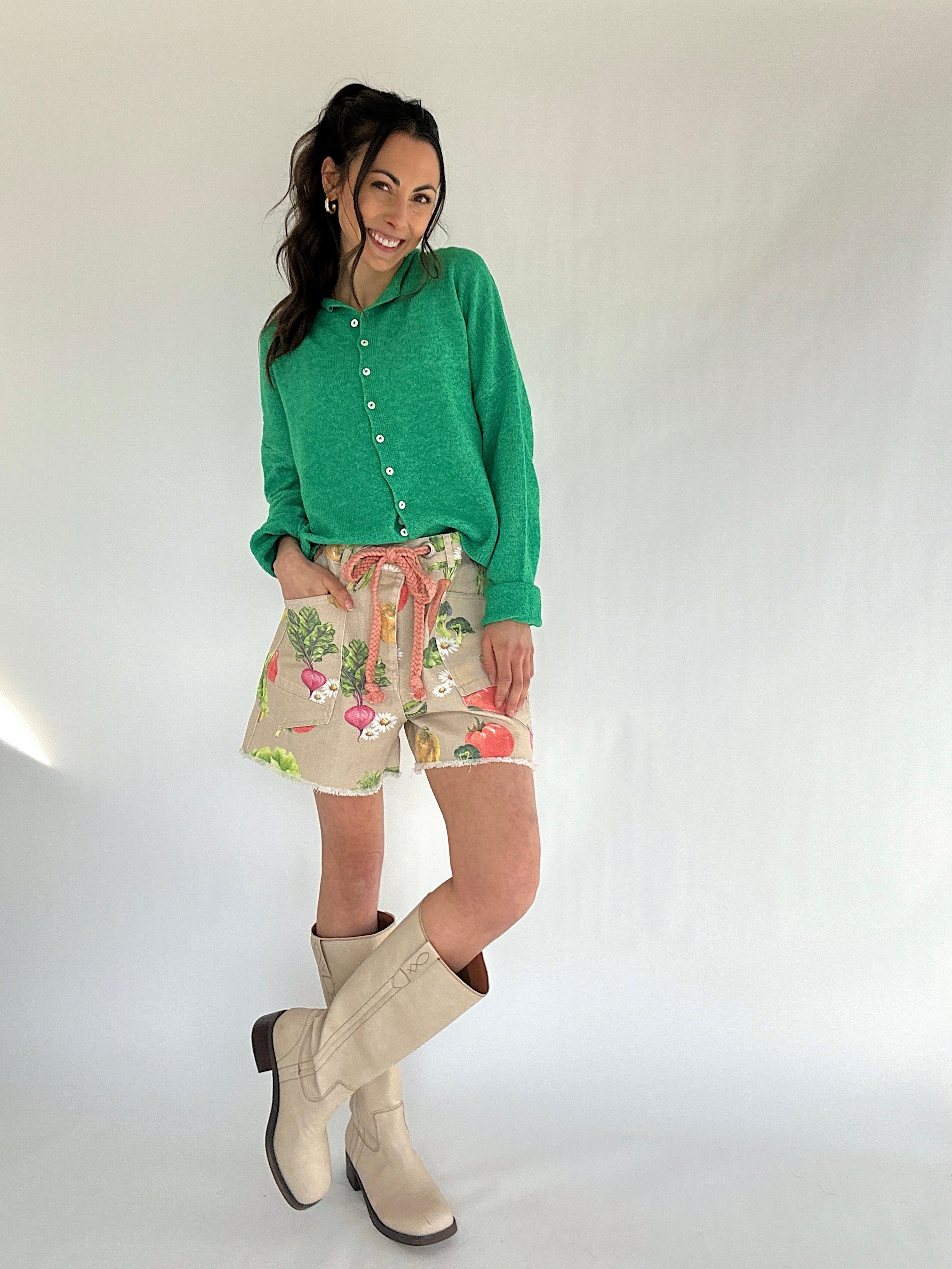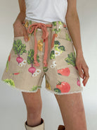 Farmers market mornings, weekend coffee runs, and warm days that call for something a little more playful—these veggie-print shorts bring the fun. The colorful garden pattern makes them a standout, especially when paired with the matching jacket.