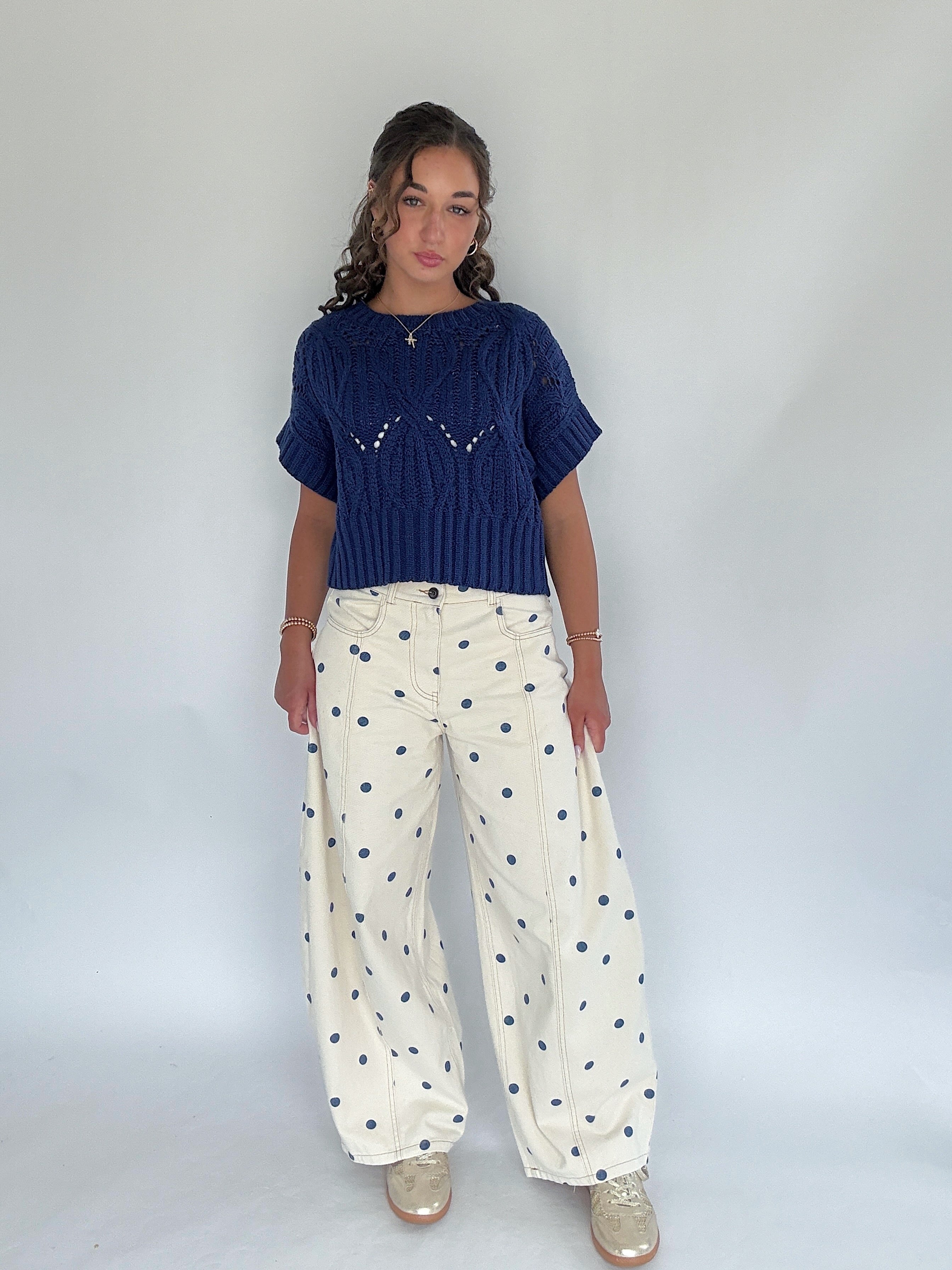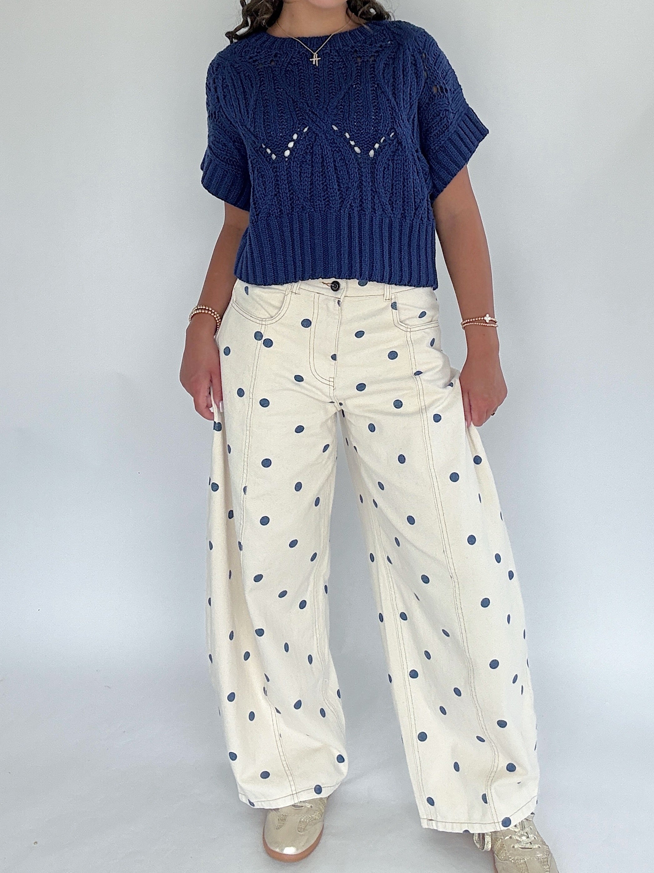 For game day, casual Fridays, or just adding a little fun to your closet—these wide leg polka dot pants strike the perfect balance between playful and polished. With a flattering barrel silhouette and classic cream-and-navy combo, they’re easy to dress up or down depending on your mood.
