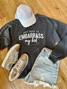 "Just here to embarrass my kid" graphic on heather navy unisex crewneck.