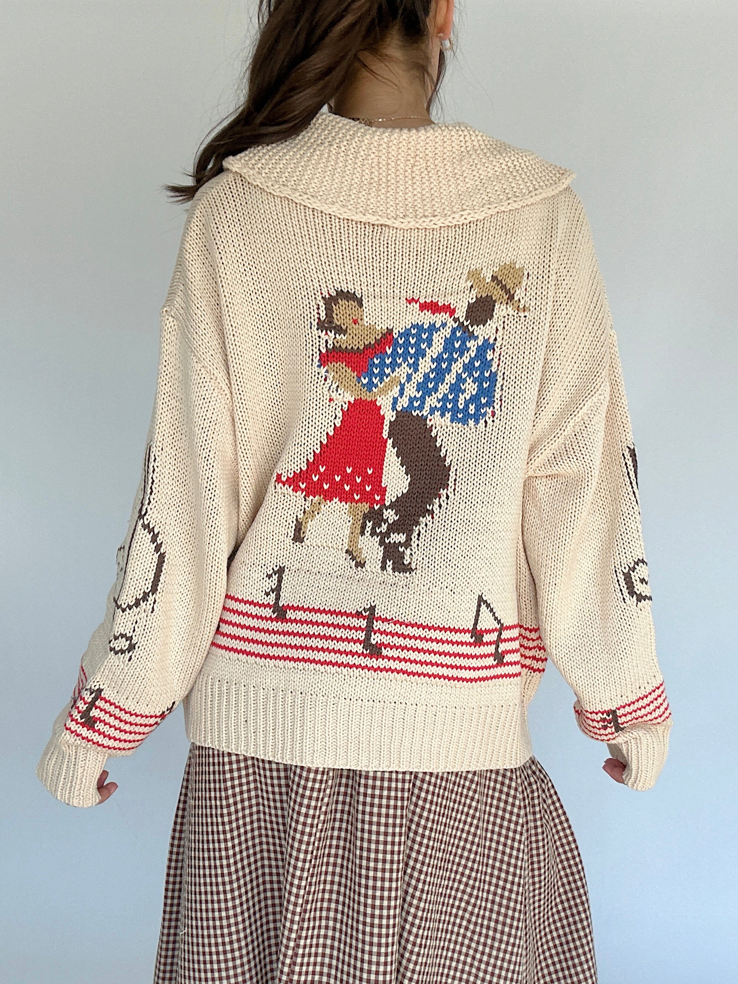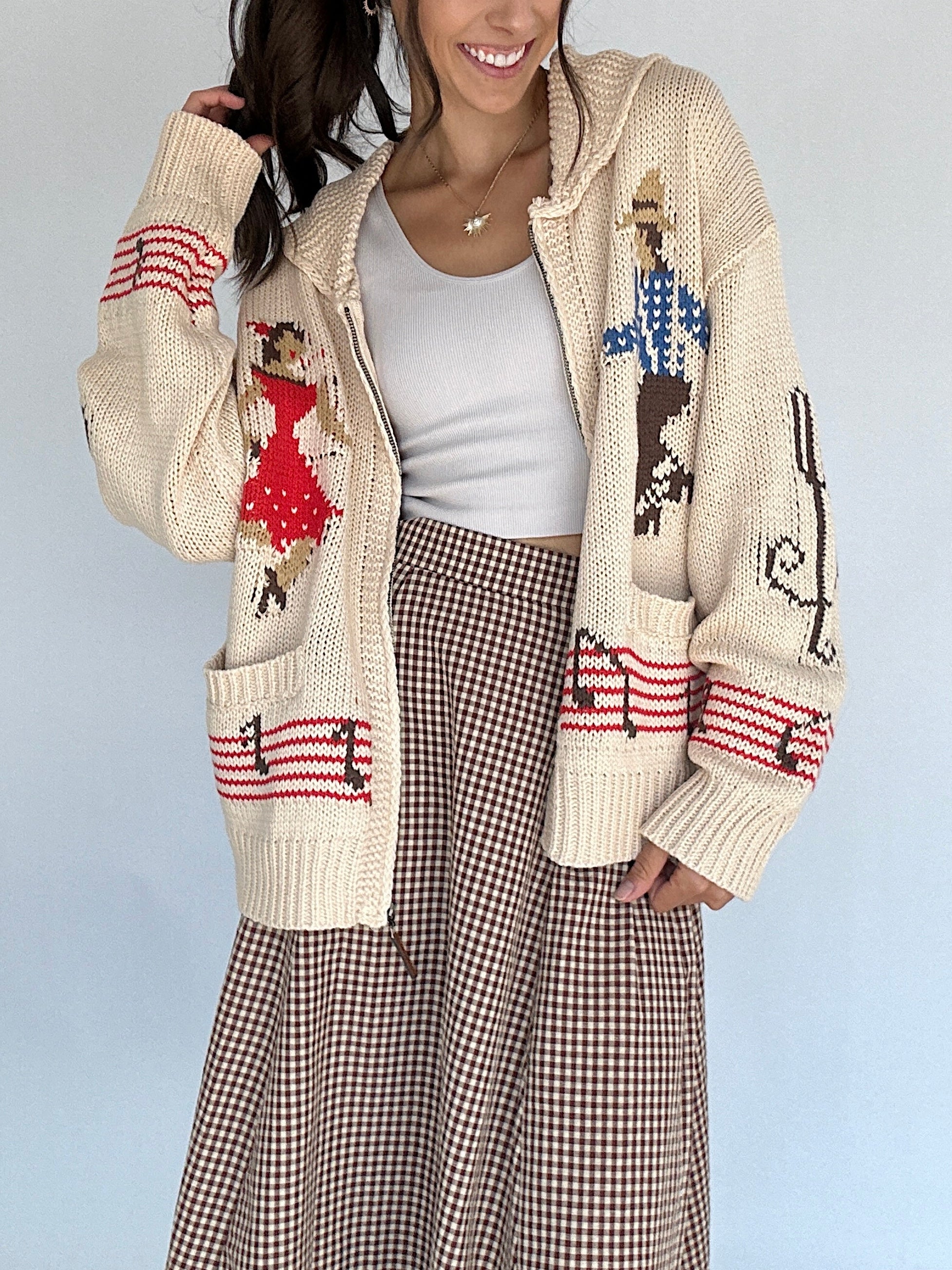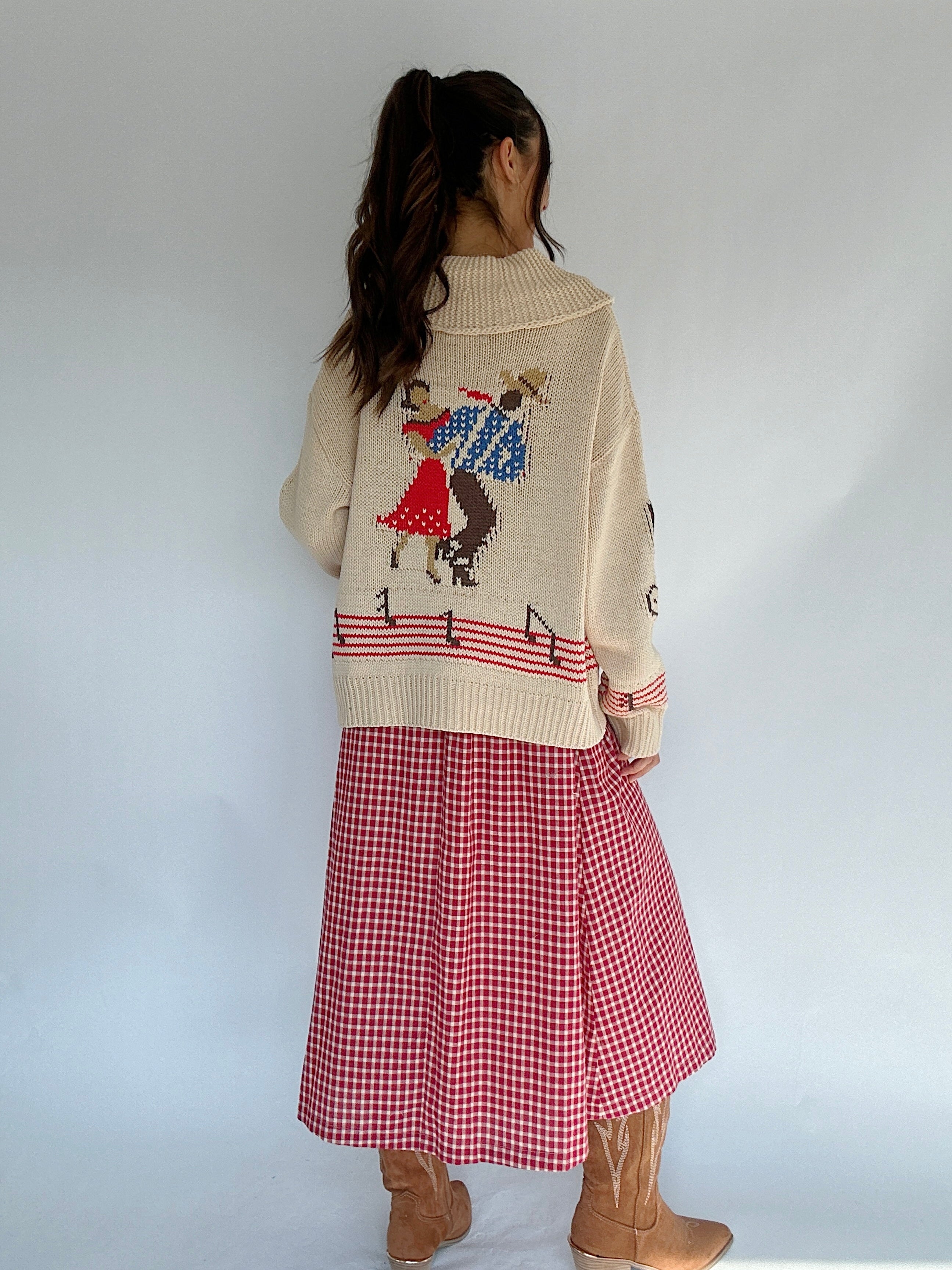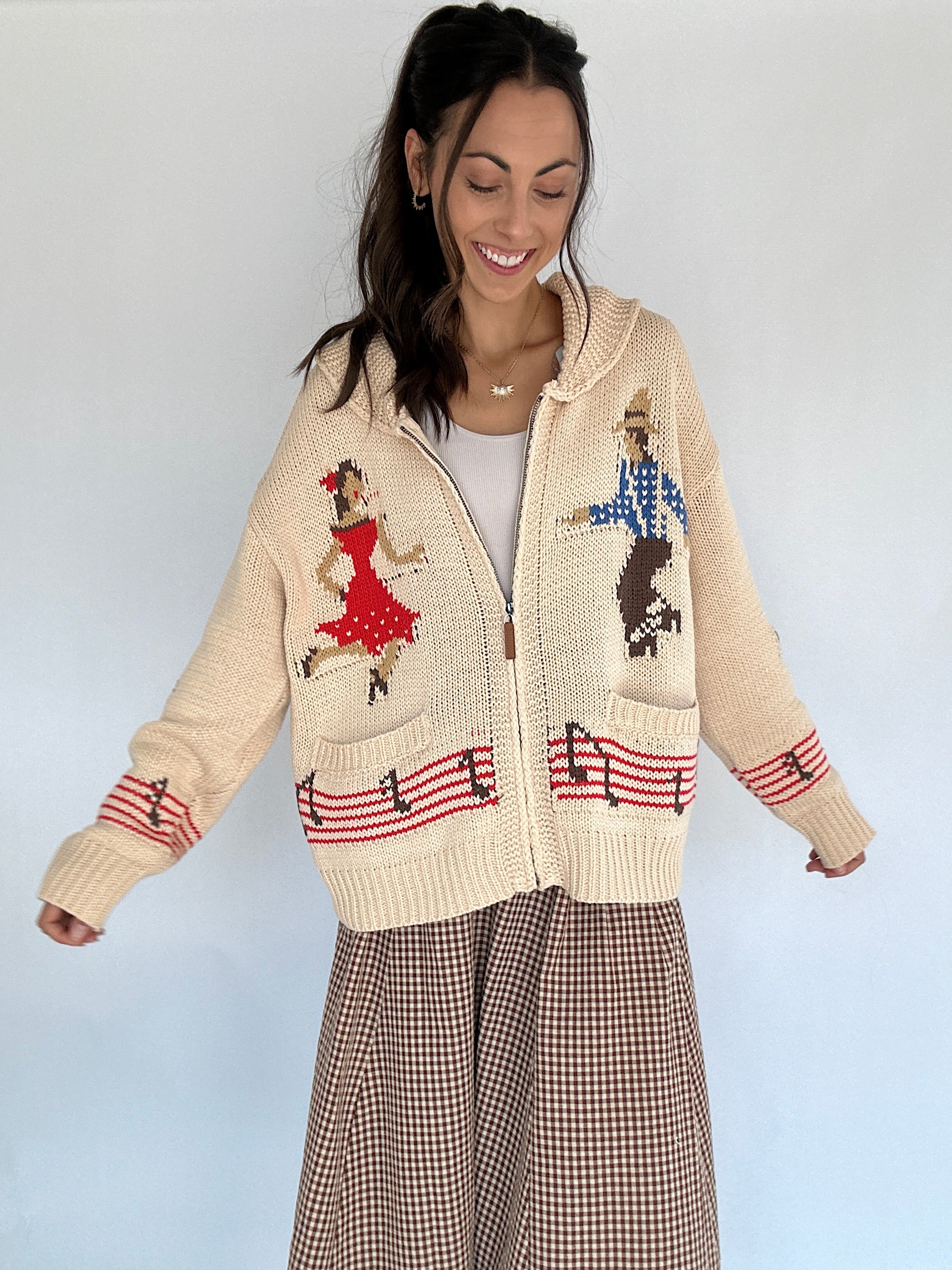Two-step your way into the cutest outfit with the Square Dance Zip Up Sweater. In cream knit, this standout piece brings a vintage western vibe with square dancers twirling across the front and back. Music note elbow patches and sheet-music lines along the hem add the perfect playful finishing touch. With its collared neckline, zip-up front, and classic fit, this one’s equal parts cozy and eye-catching!
