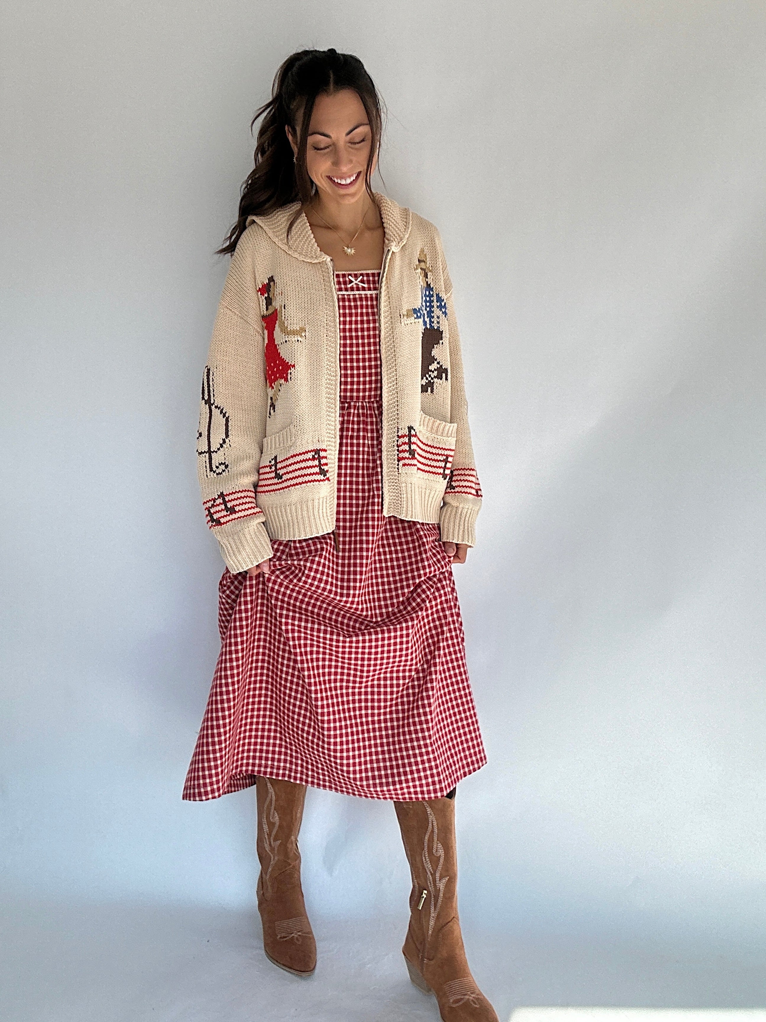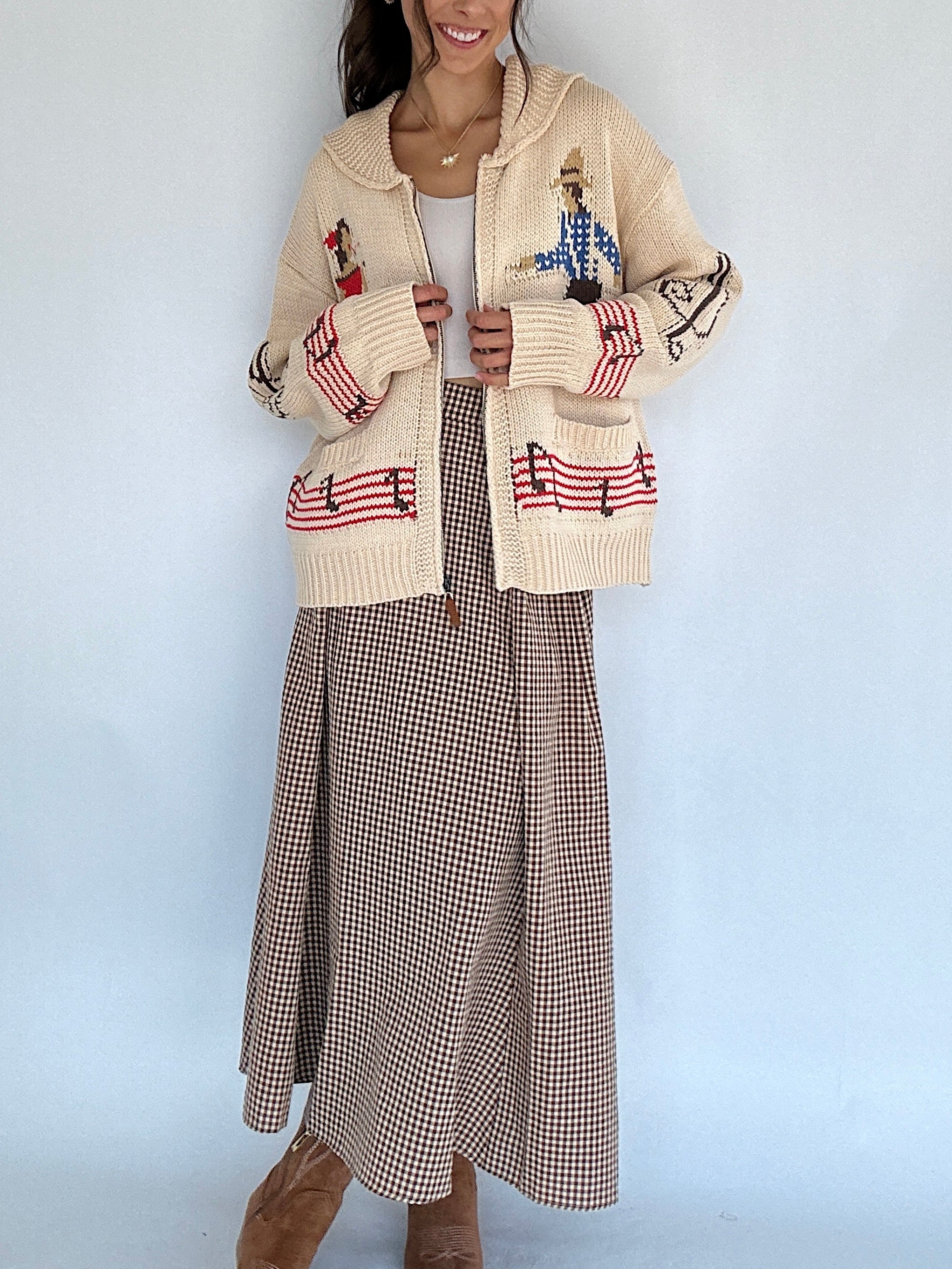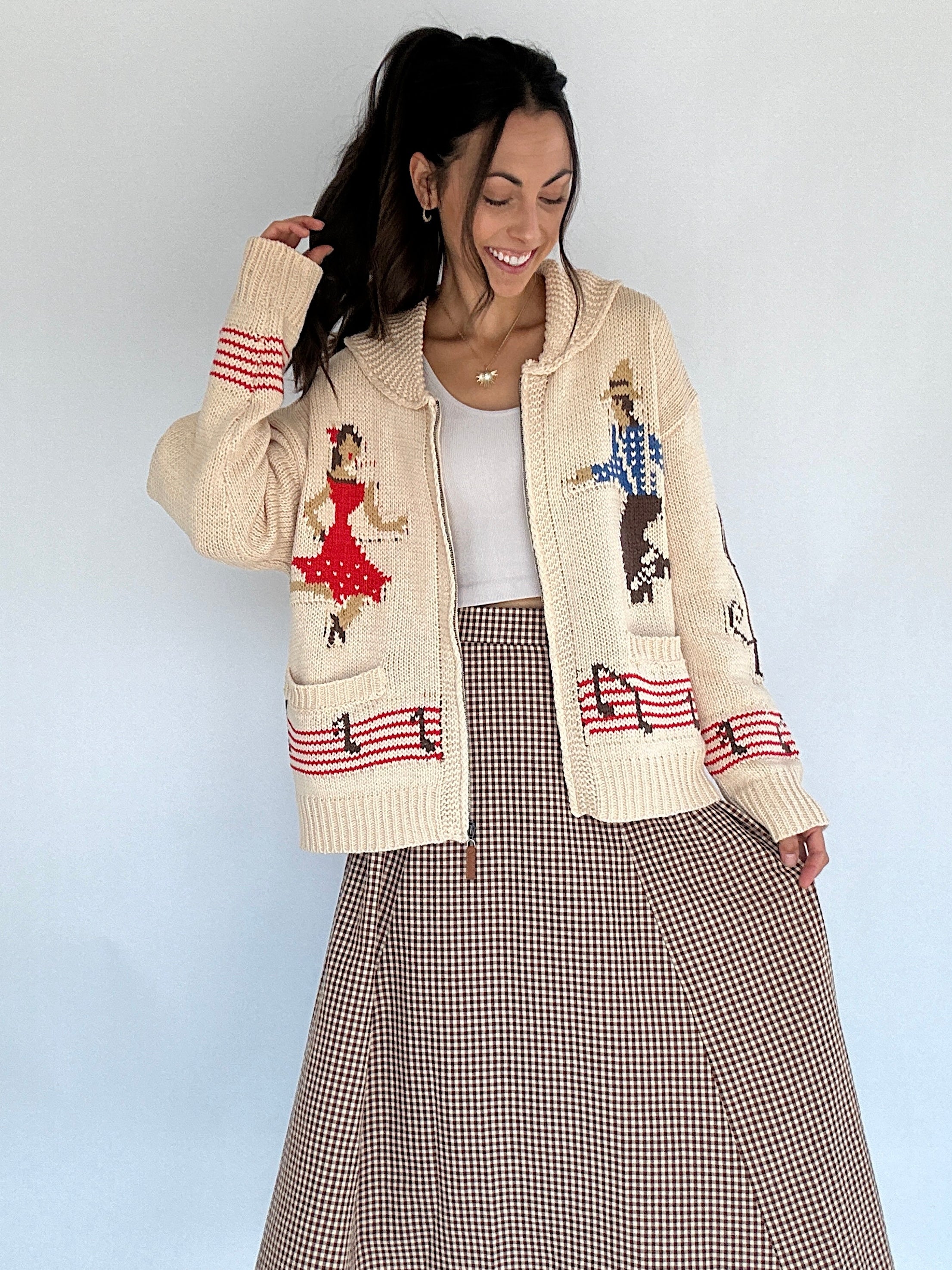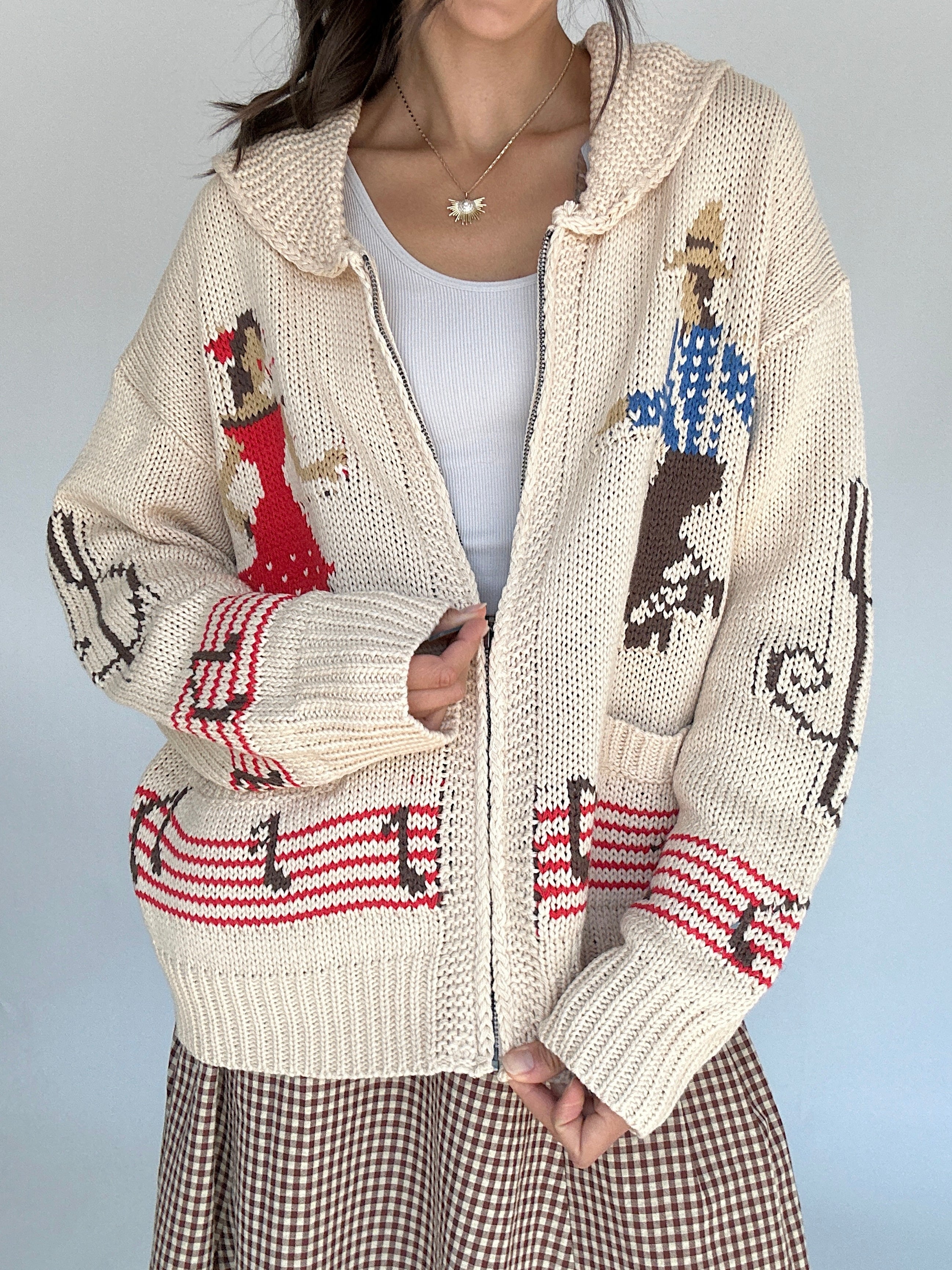 Two-step your way into the cutest outfit with the Square Dance Zip Up Sweater. In cream knit, this standout piece brings a vintage western vibe with square dancers twirling across the front and back. Music note elbow patches and sheet-music lines along the hem add the perfect playful finishing touch. With its collared neckline, zip-up front, and classic fit, this one’s equal parts cozy and eye-catching!
