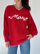 The Merry Stitched Sweater is your go-to for cozy holiday style with a playful touch! Made in a soft red knit, it features white embroidered “merry” lettering, festive pom pom detail, and contrast stitching along the v-neckline and hems. Its relaxed fit makes it perfect for pairing with the matching Merry Stitched Boxer Shorts for lounging or styled with jeans or a holiday skirt for festive days!