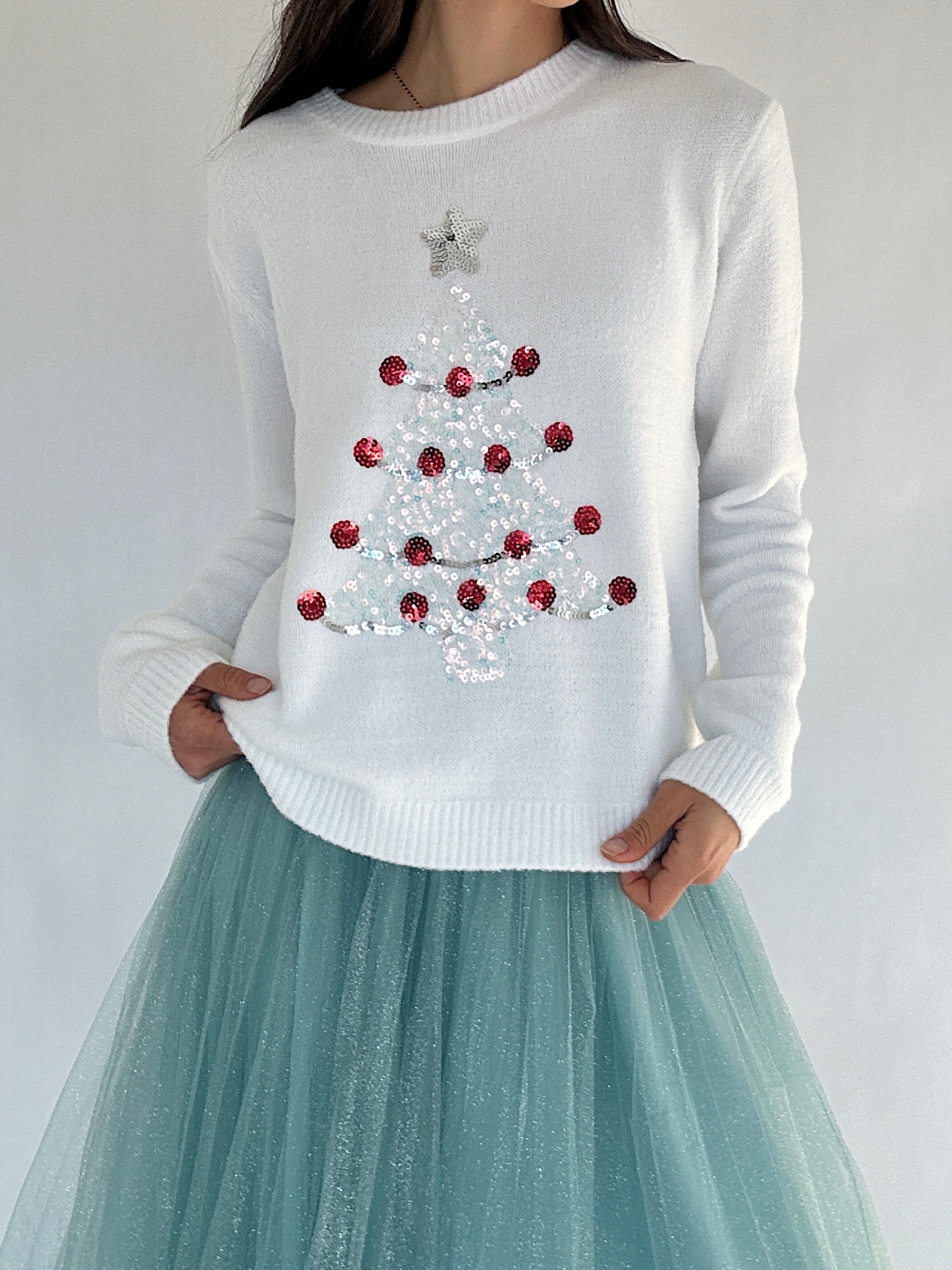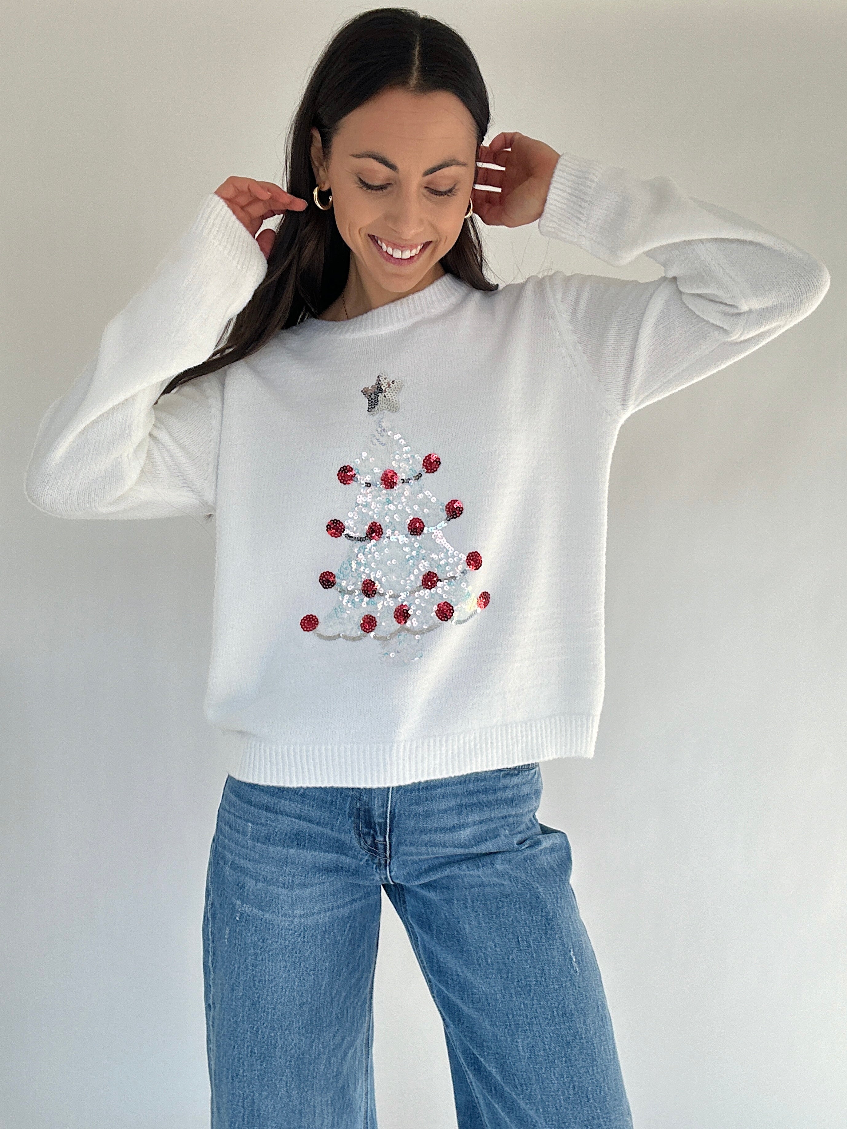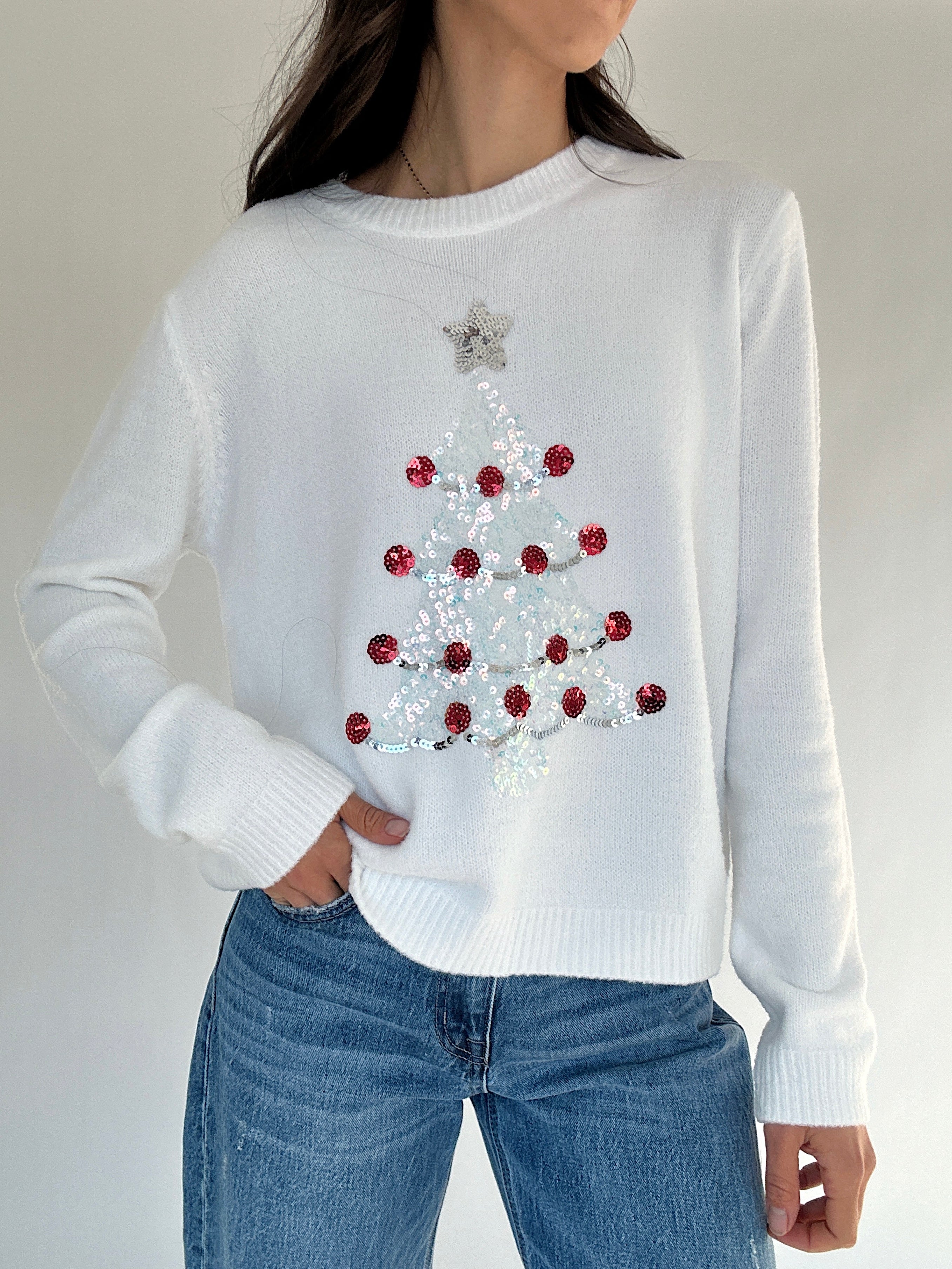Glittering Tree Sweater – Bring a little sparkle to the season with this cozy knit that perfectly captures the magic of the holidays. Featuring a beautifully detailed sequin Christmas tree, this soft round-neck sweater adds a festive touch to any winter day—perfect for cookie swaps, holiday parties, or twinkling nights by the fire. FINAL SALE ITEM
