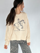 For the days you want to keep it cozy but still feel a little iconic. The Cowboy Rides Away Embroidered Sweater is soft and relaxed with an embroidered line art cowboy on horseback—simple, cool, and just western enough to turn heads. It’s the kind of piece that works for a chilly mountain morning or a coffee run downtown.