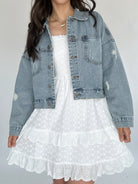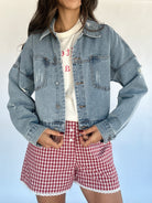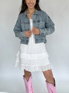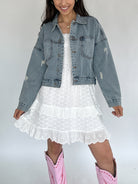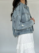 This denim jacket is about to be your new favorite outfit accessory! It has light distressing and the perfect relaxed and slightly cropped fit.