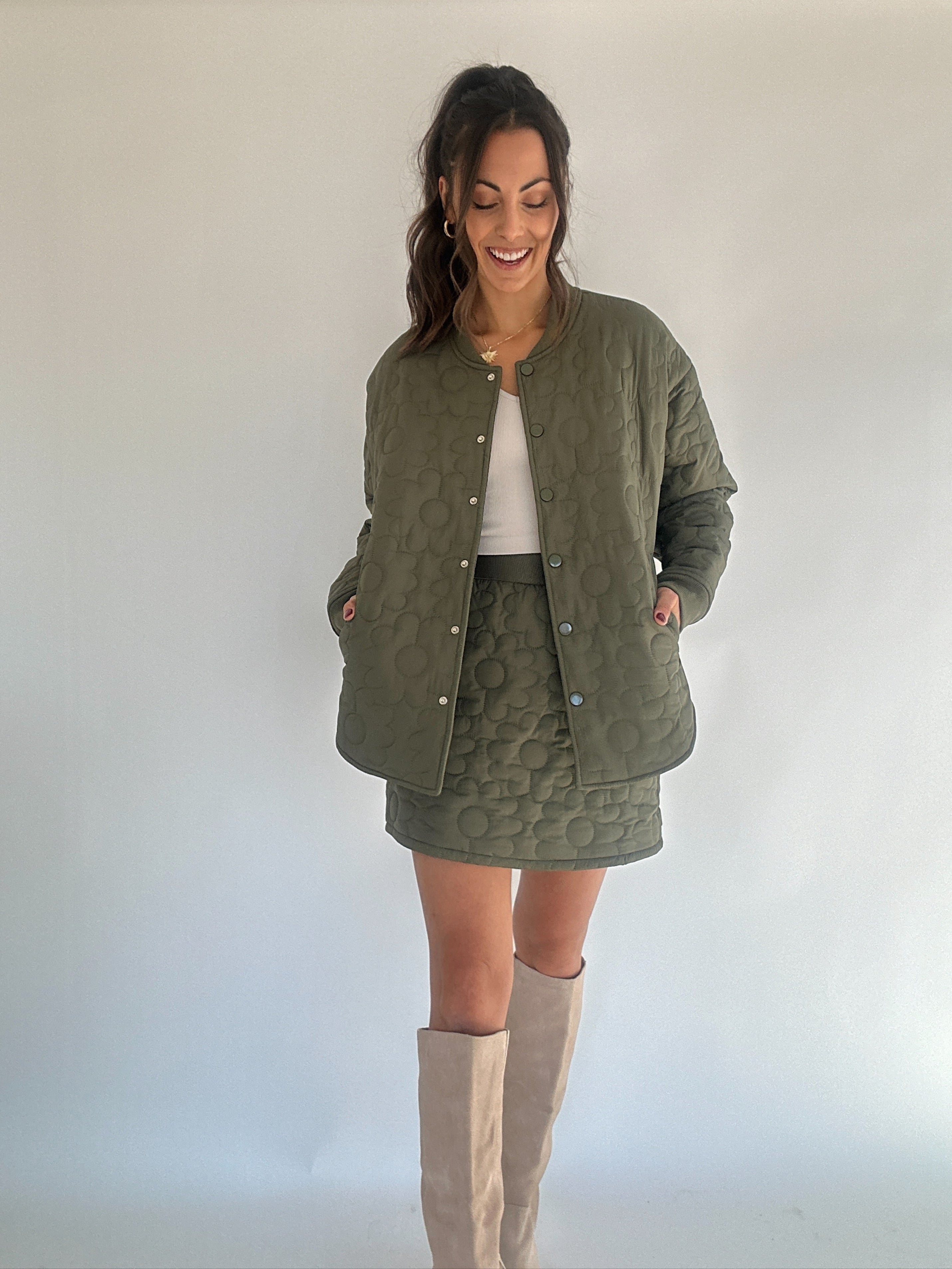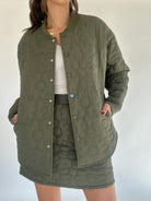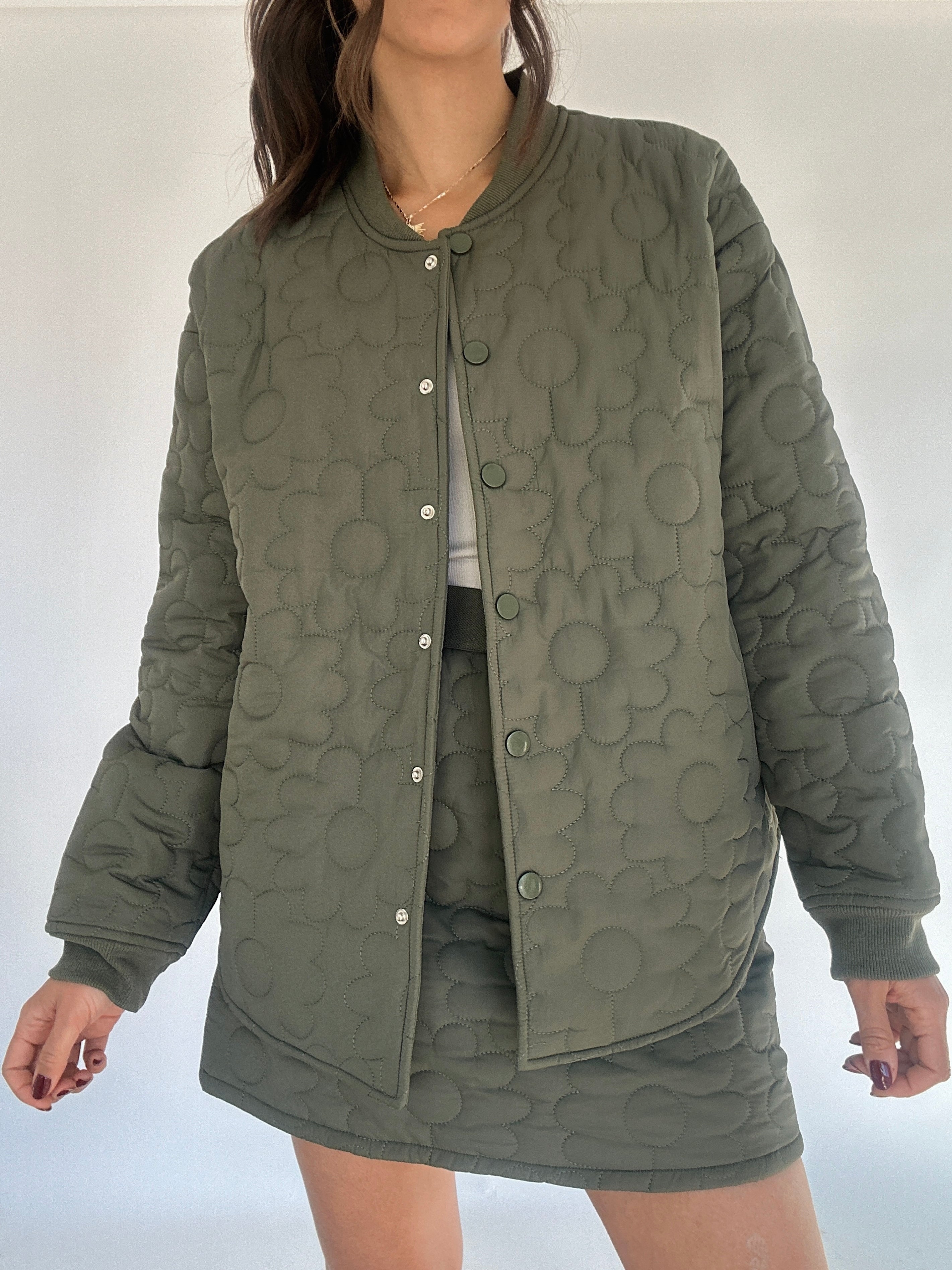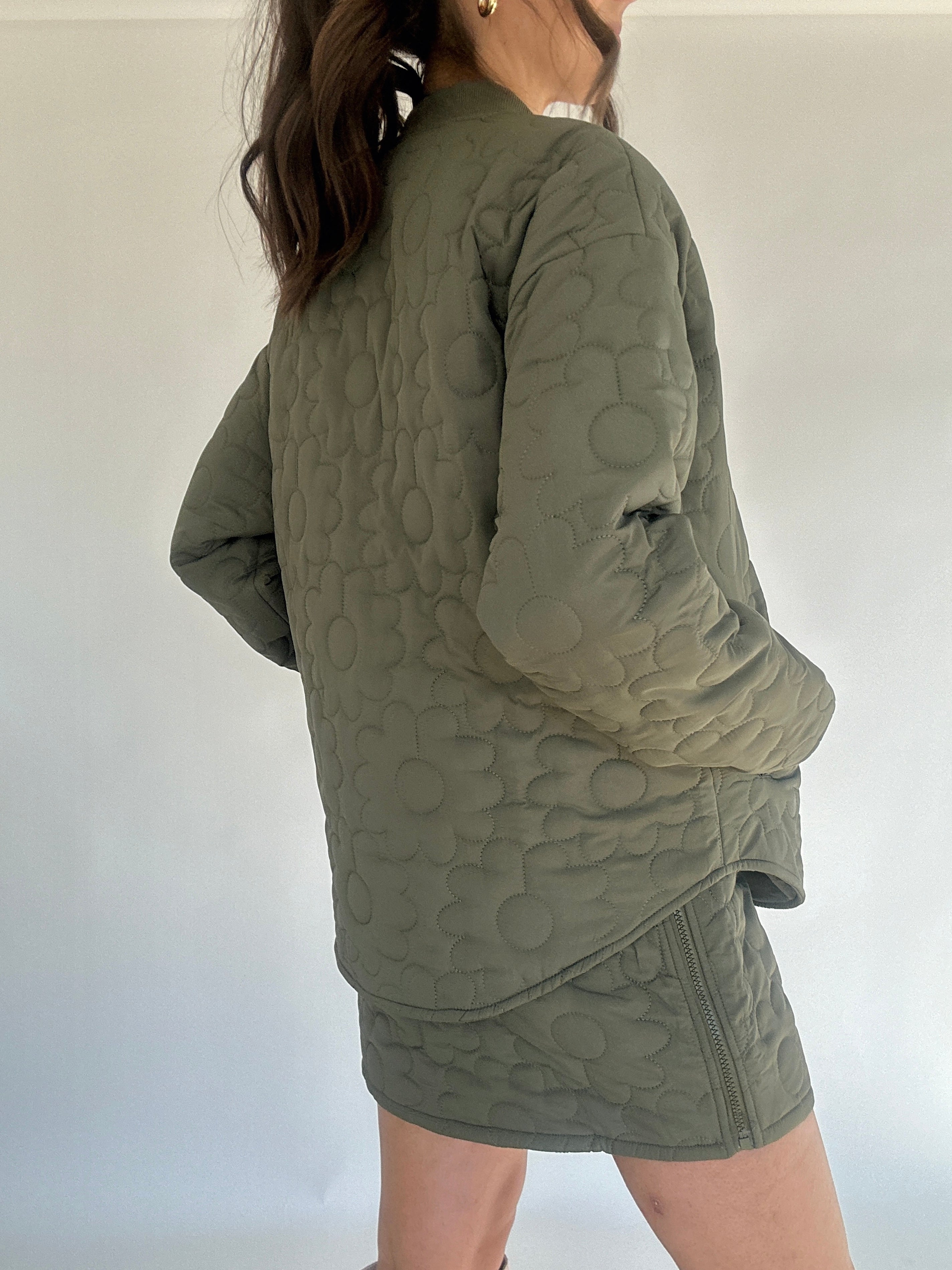 This muted green bomber jacket is quilted with a floral detail and has a snap button front, curved hem and side pockets. So great as a go-to light weight jacket for changing seasons!
