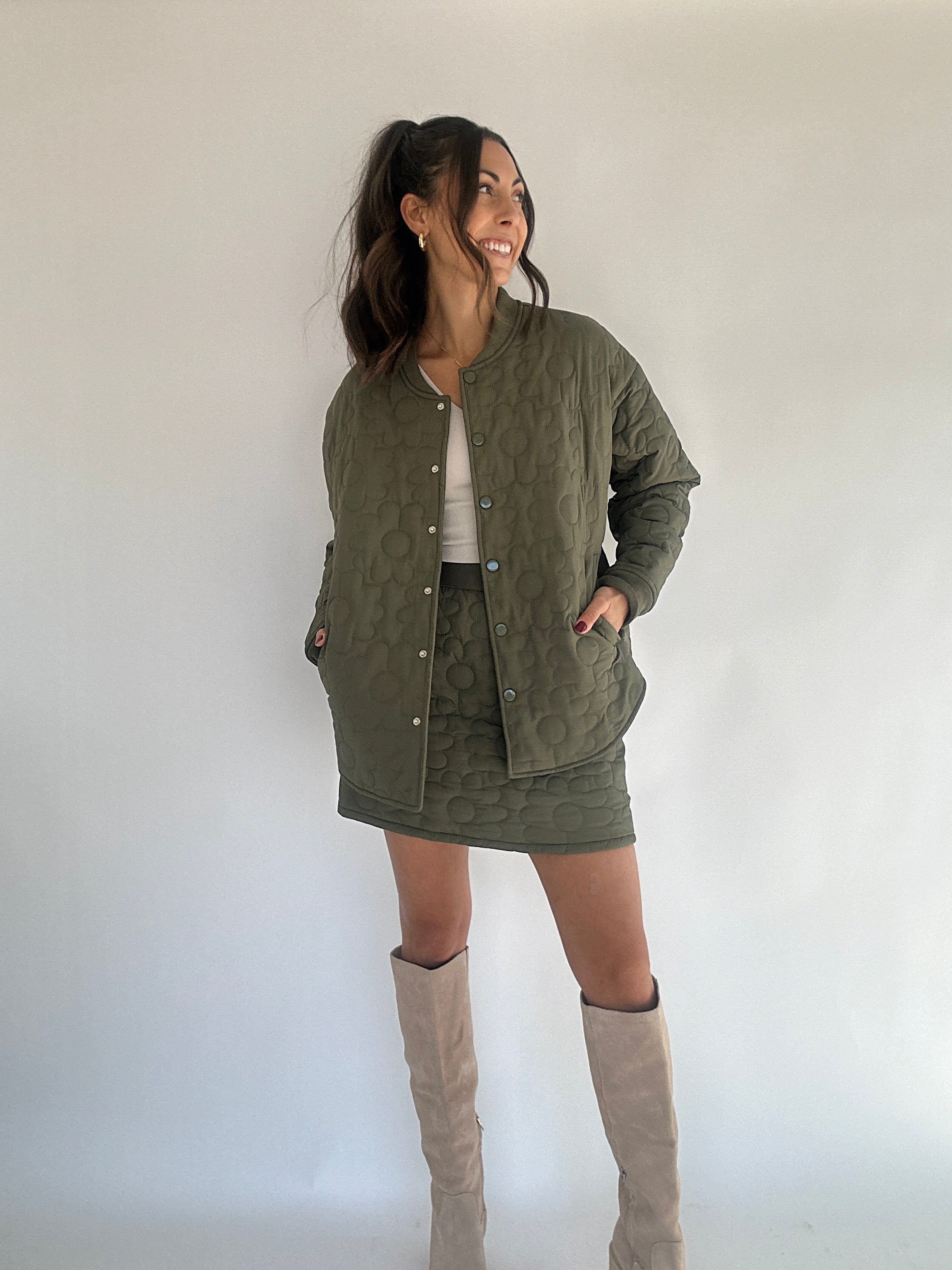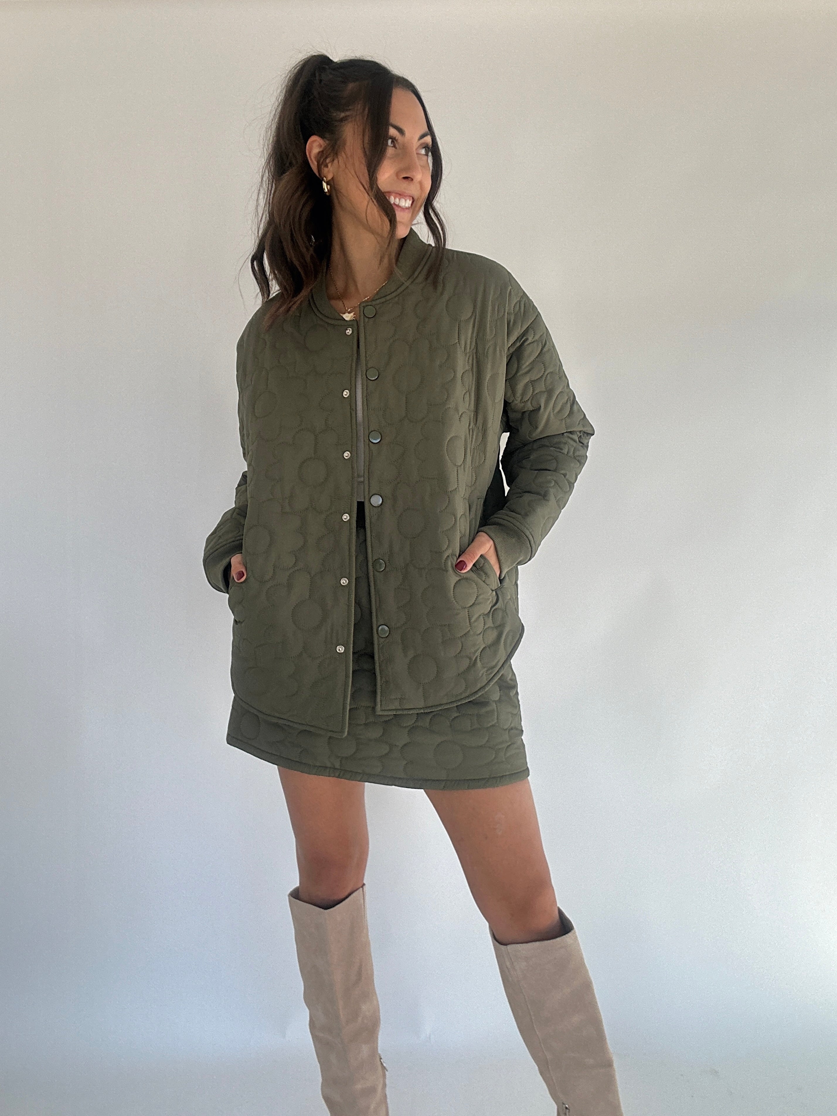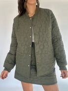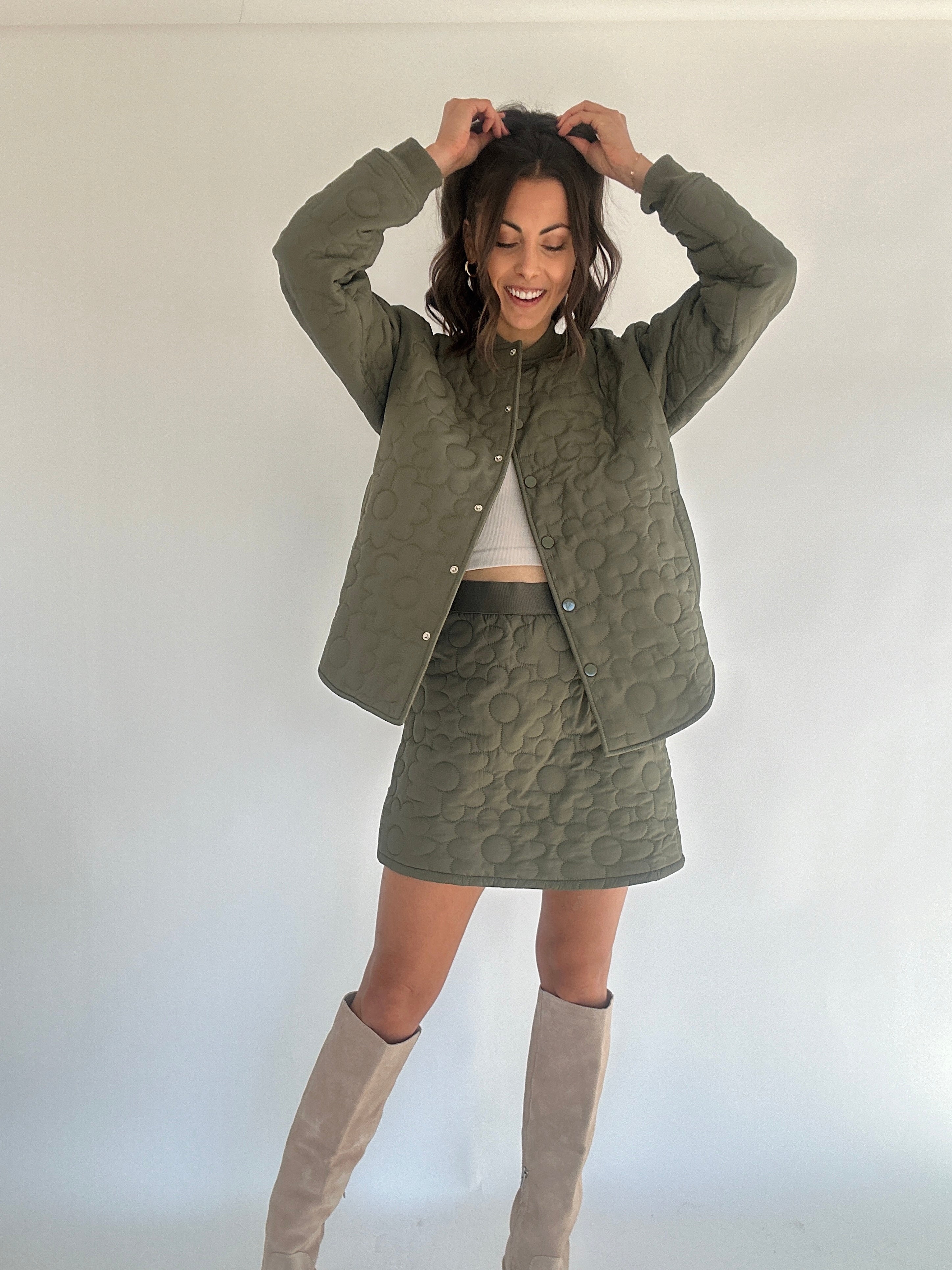 This muted green bomber jacket is quilted with a floral detail and has a snap button front, curved hem and side pockets. So great as a go-to light weight jacket for changing seasons!