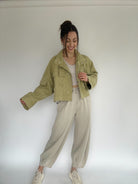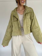 This light olive jacket has a cargo style look with oversized pockets and a boxy, slightly cropped fit. It also features a zipper and snap button front.
