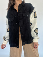 We are in love with this black corduroy jacket and its floral printed sweater sleeves! It has a button front and dropped shoulders that give it the perfect relaxed fit.