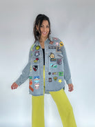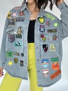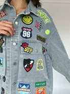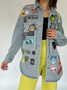 This denim jacket is like none other! It's covered in an assortment of patches, has cargo pockets and an oversized fit.