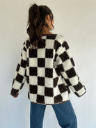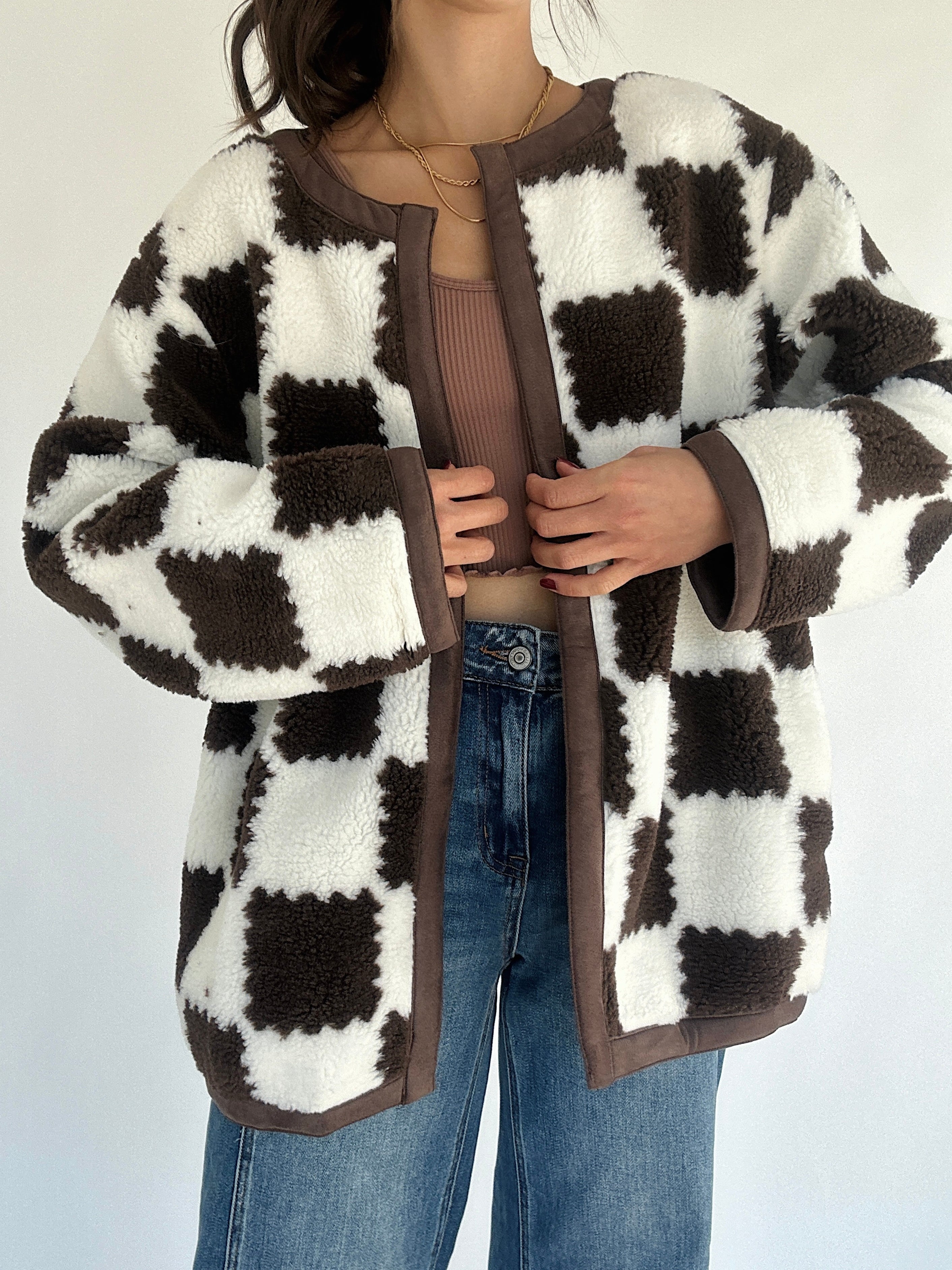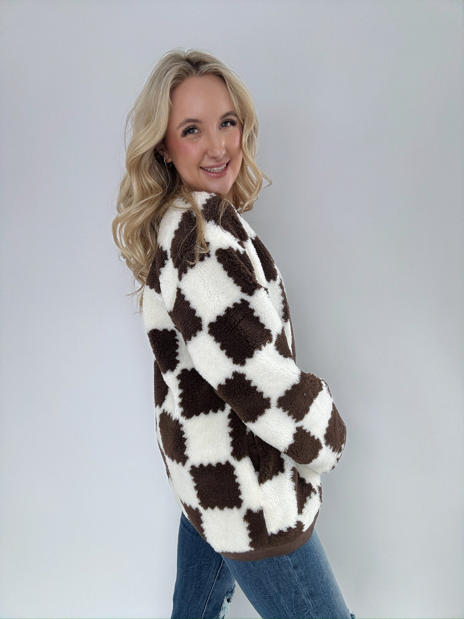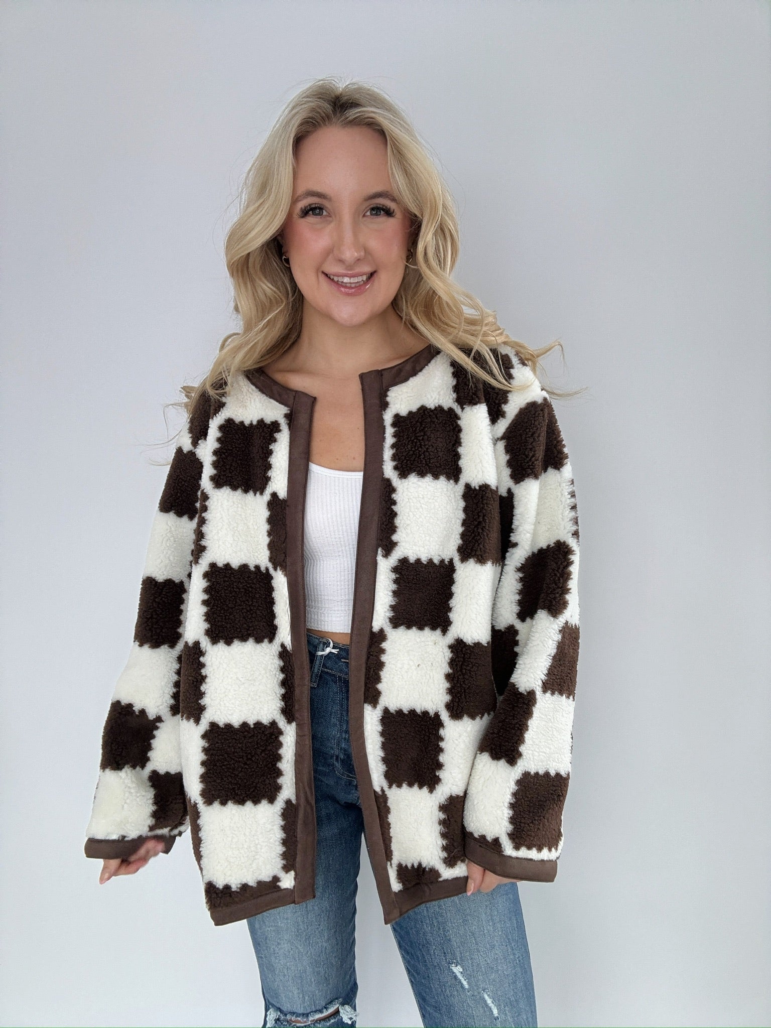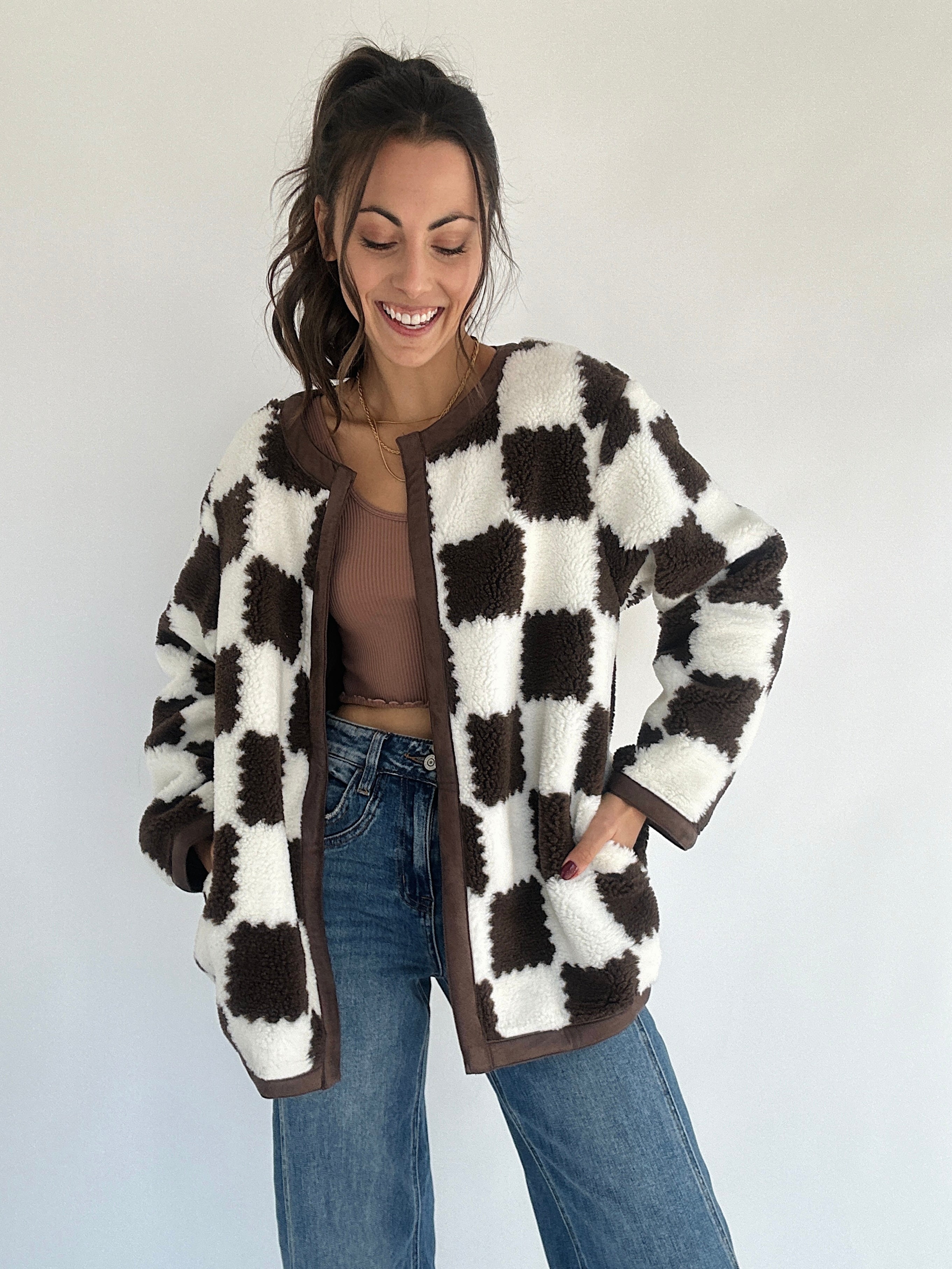 Is it the cozy sherpa or the ivory and cocoa checkered gingham pattern that we fell in love with? It's both! This jacket has suede binding on the hem, placket and rounded neckline. Plus it has pockets!