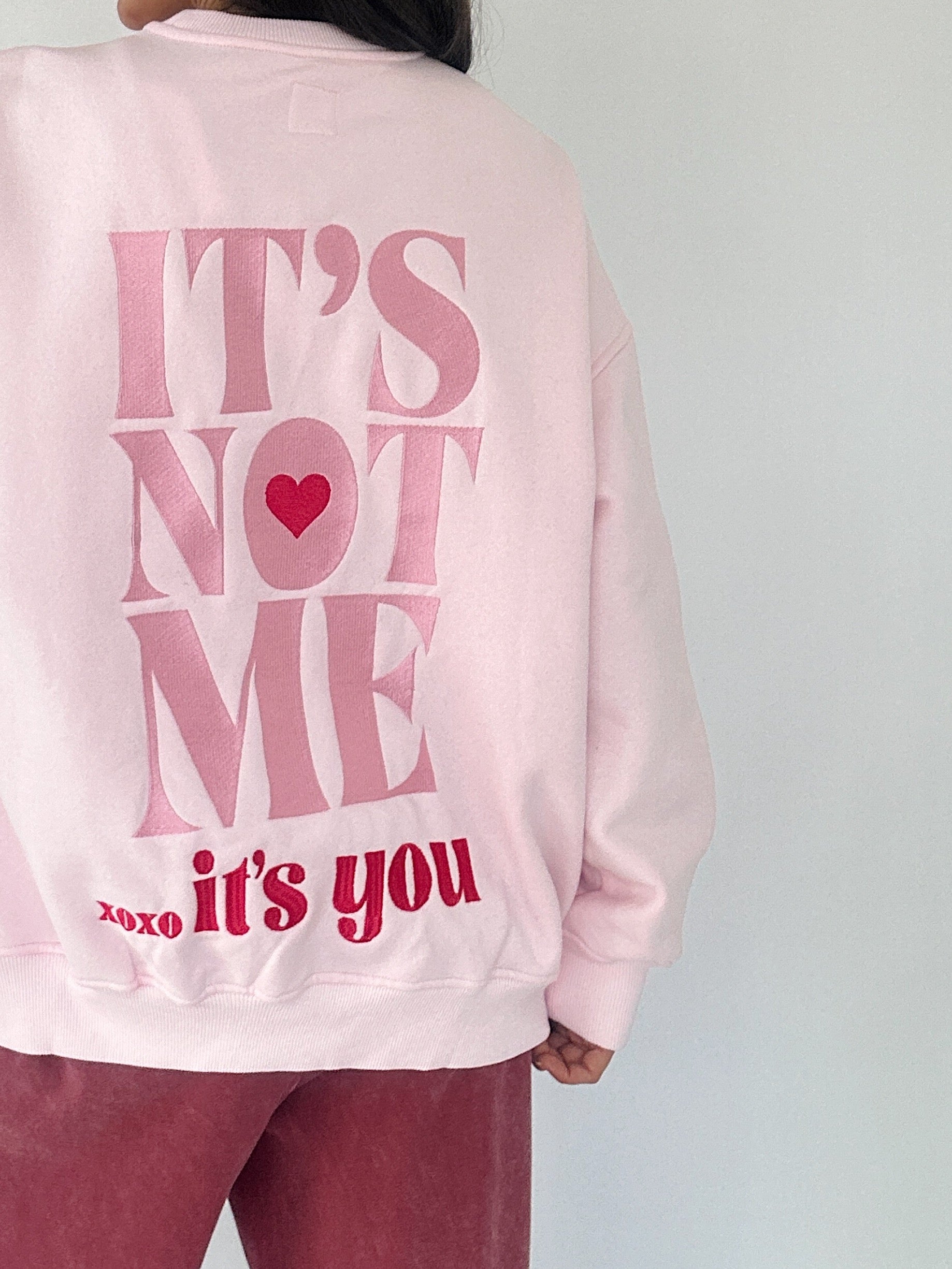 Perfect for cozy date nights, Galentine’s plans, or laid-back Valentine’s vibes, this light pink crewneck sweatshirt adds just the right mix of sweet and sassy. Finished with red embroidered “It’s not me… it’s you” lettering, it’s soft, comfortable, and made for love-season lounging (or low-key attitude).