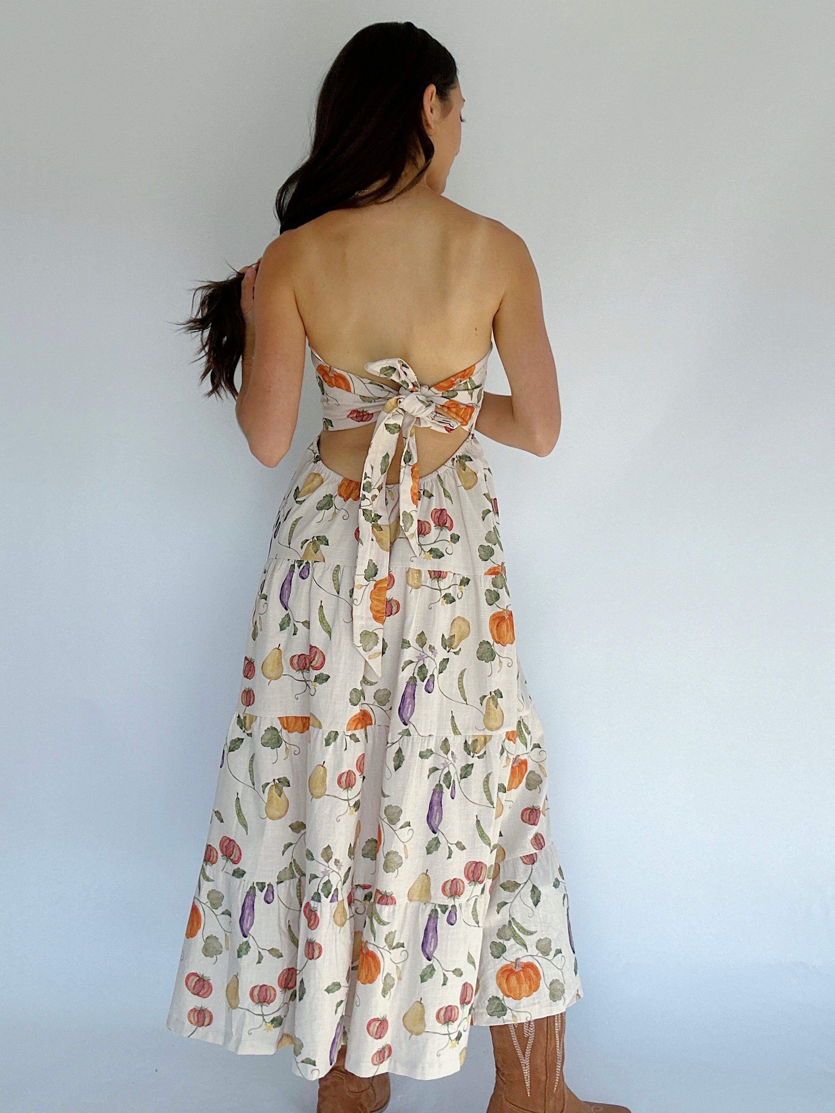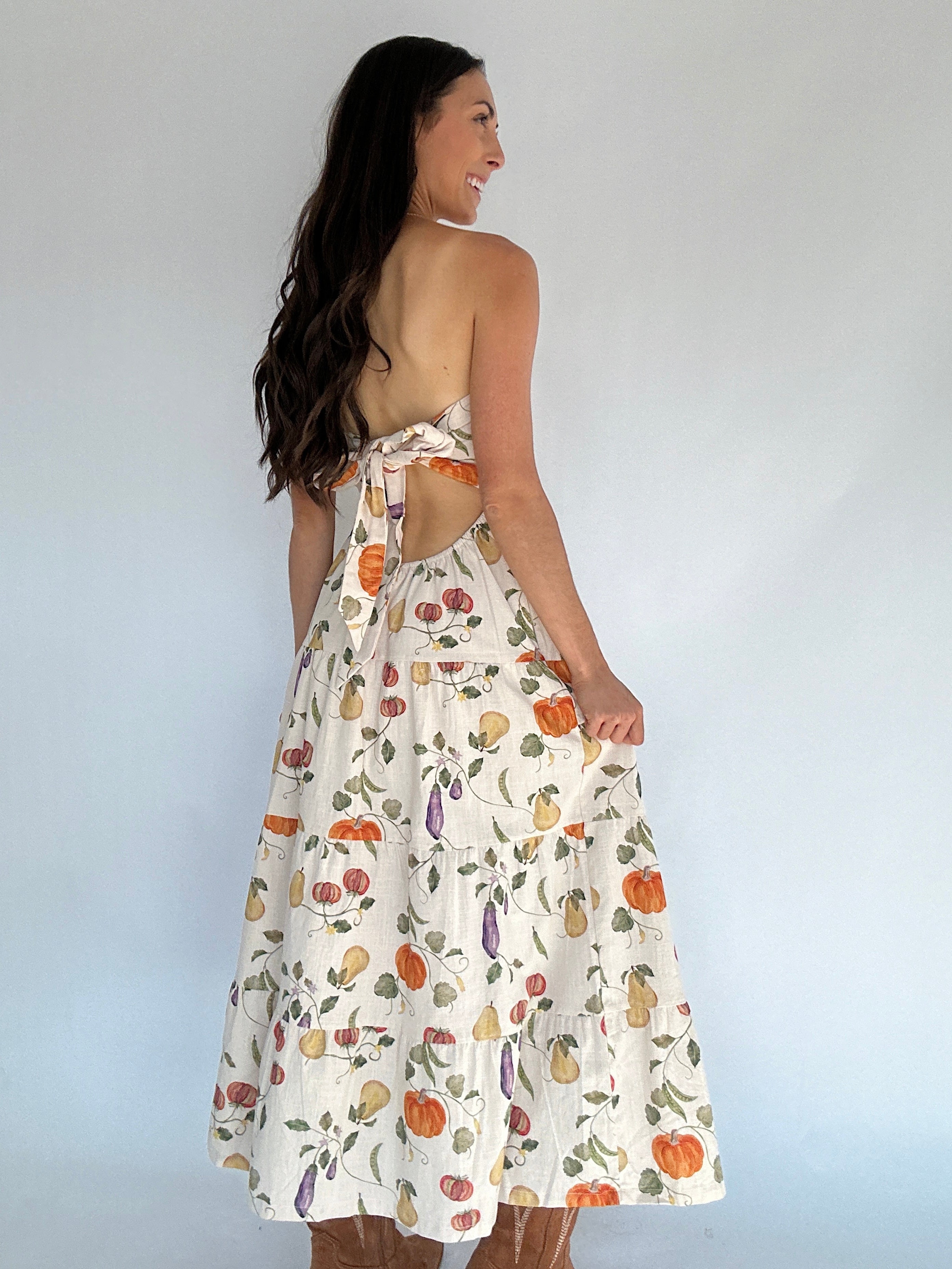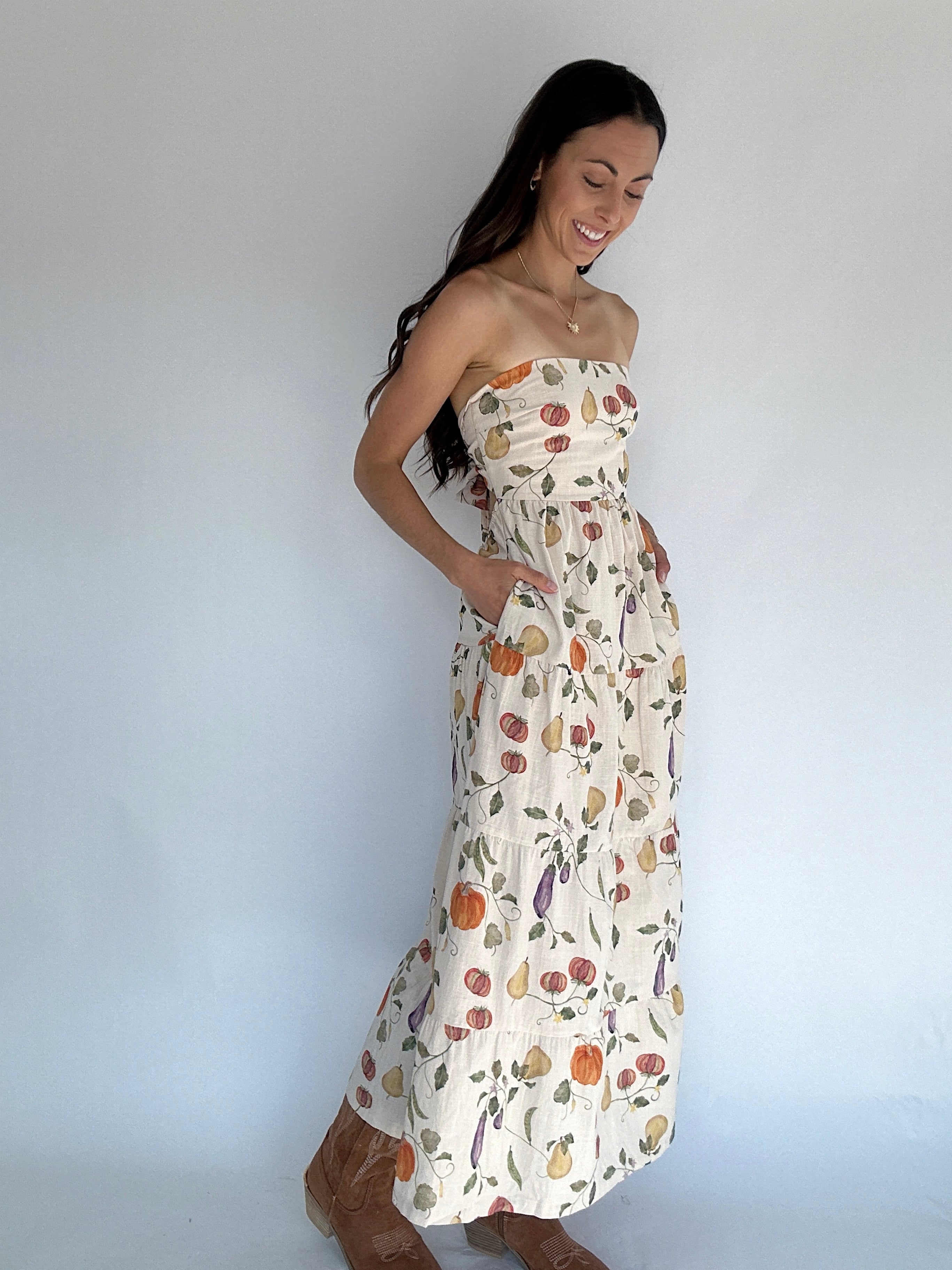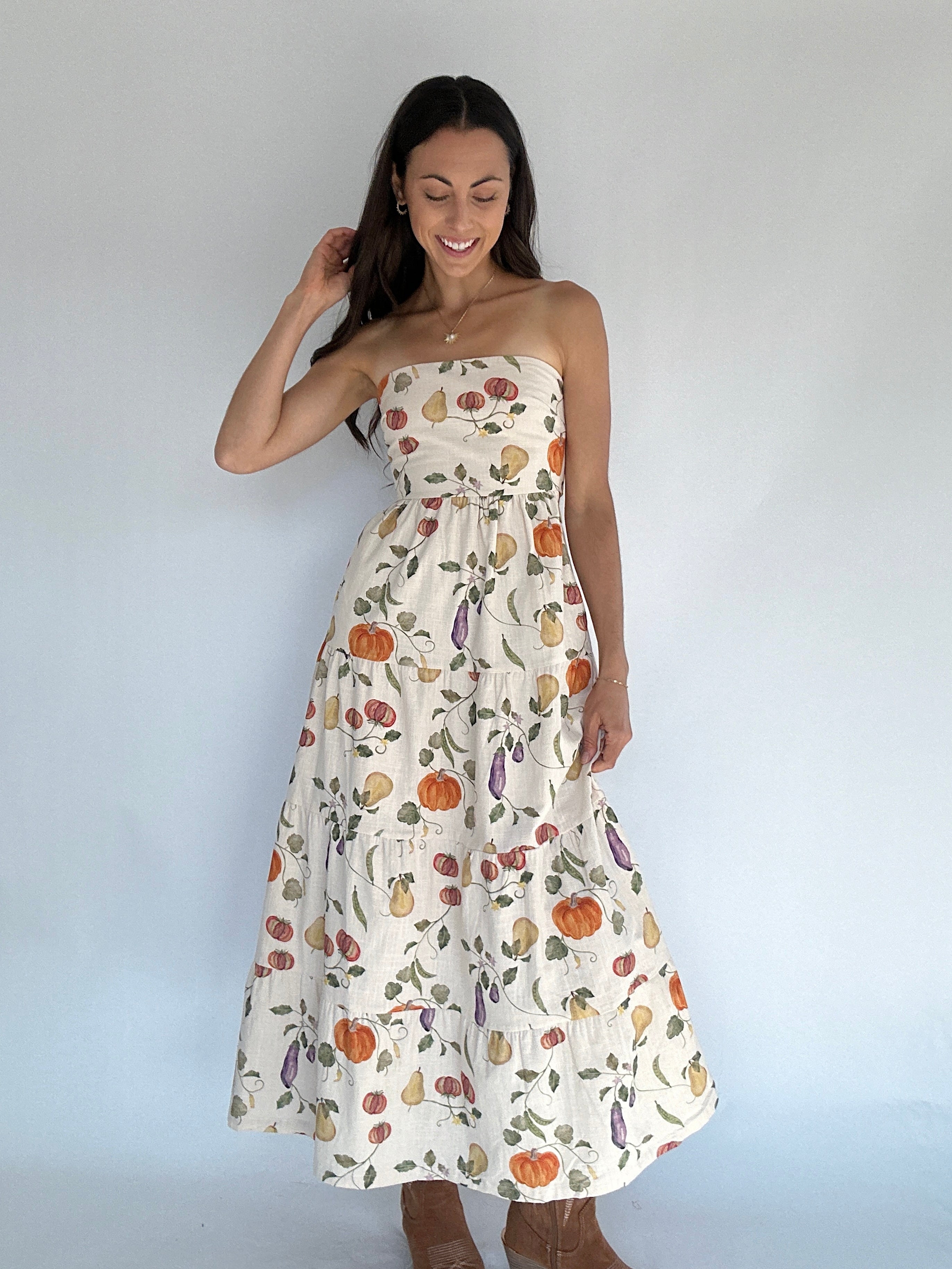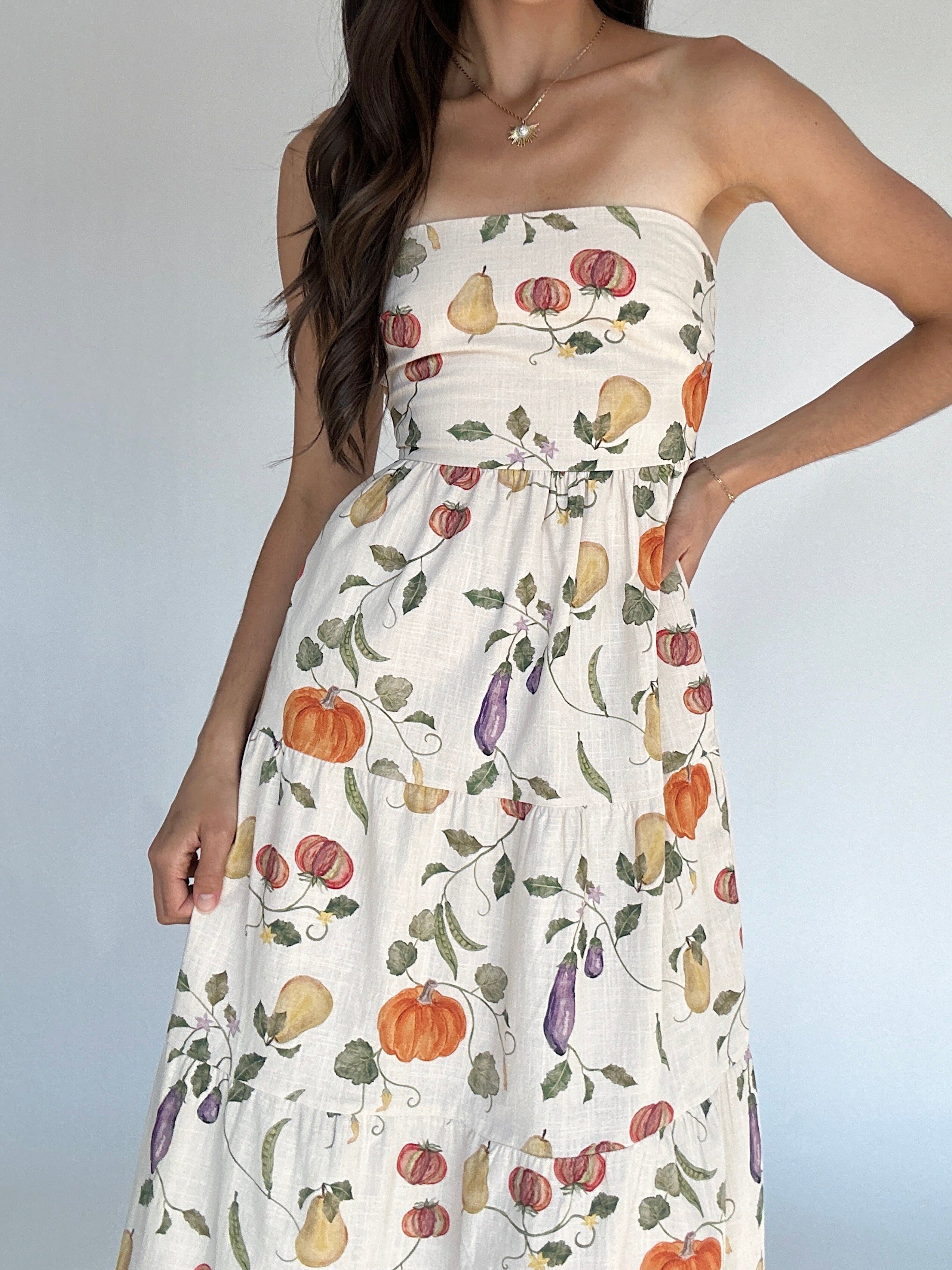 Fresh-picked and oh so flattering — the Veggie Garden Maxi Dress is a fall favorite waiting to happen. Featuring a charming fall veggie print, this strapless dress keeps things breezy and fun while the open scoop back adds the perfect touch of romance. An elastic band and adjustable self-tie make it an easy, comfortable fit, while the full-length cotton silhouette gives it effortless flow. So cute for a fall market, family photos or with a sweater and boots for an adorable Thanksgiving outfit!