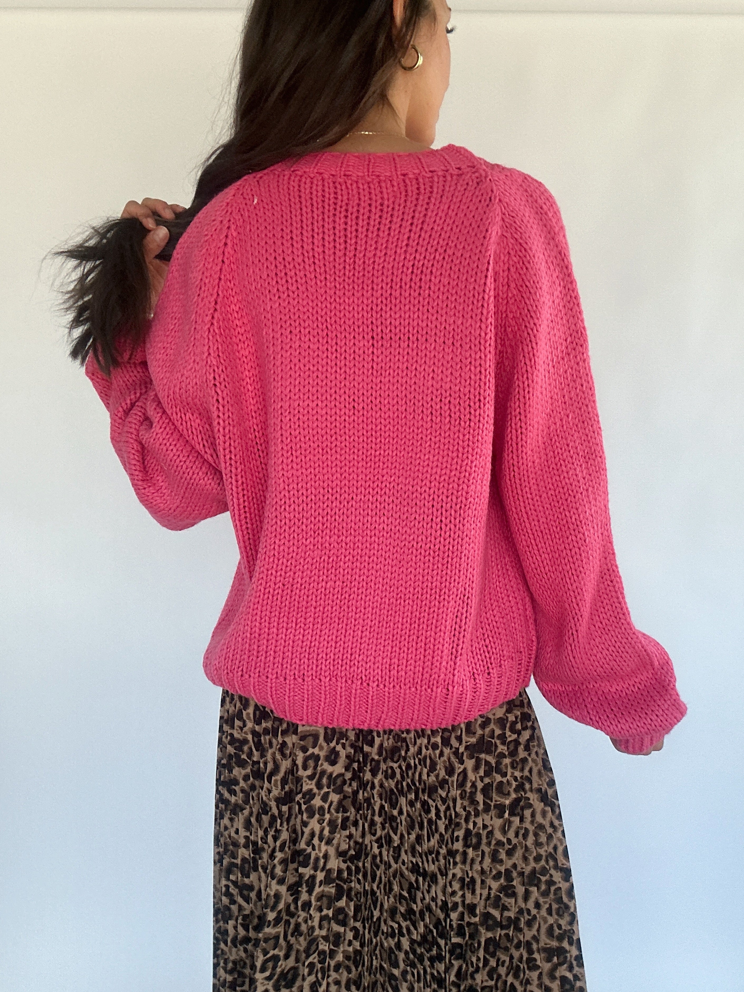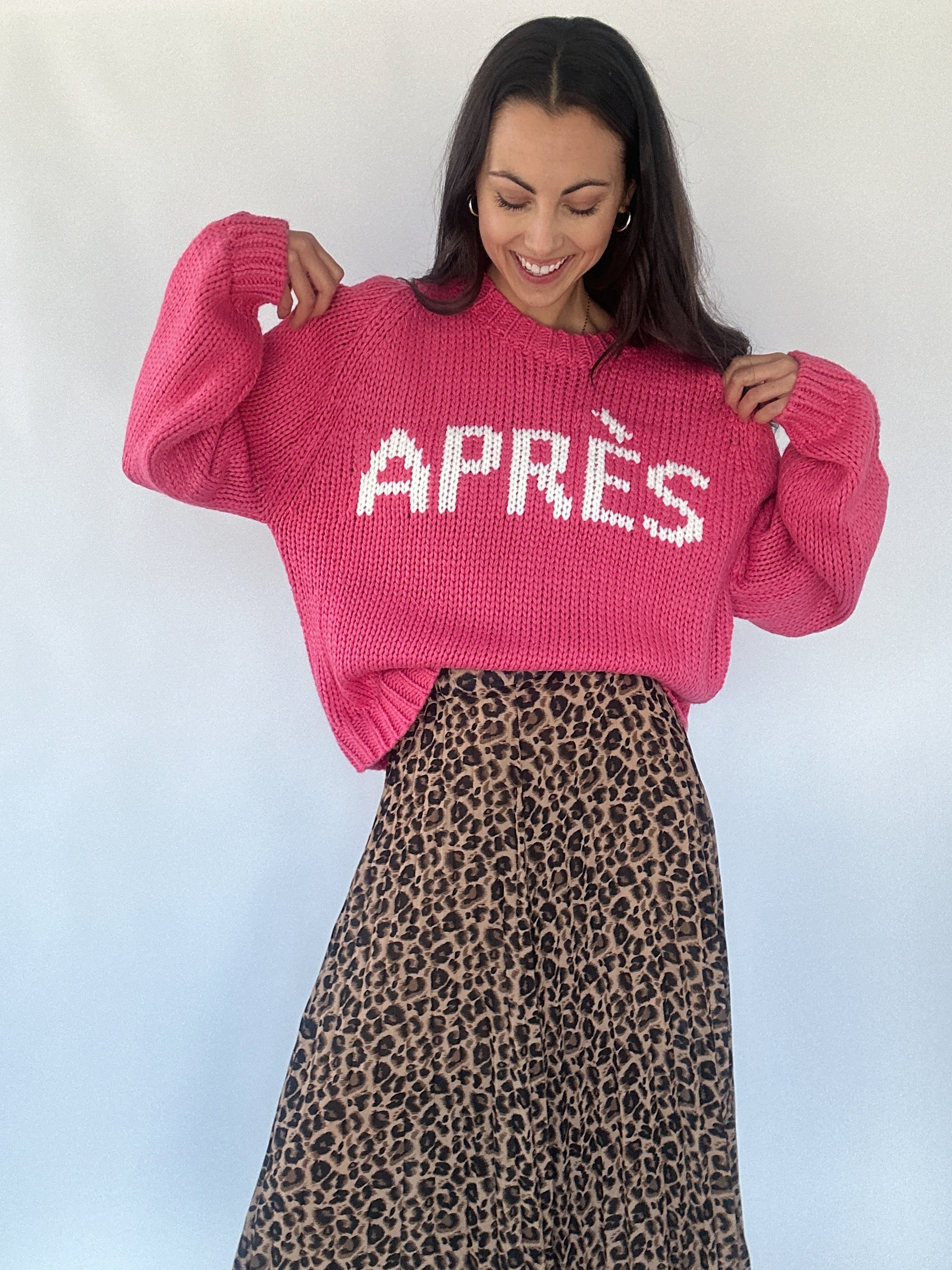 This pink knit sweater with ivory "APRES" has a relaxed fit with round neckline and long balloon sleeves. Perfect for the winter season with your favorite denim or maxi skirt!