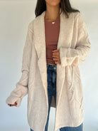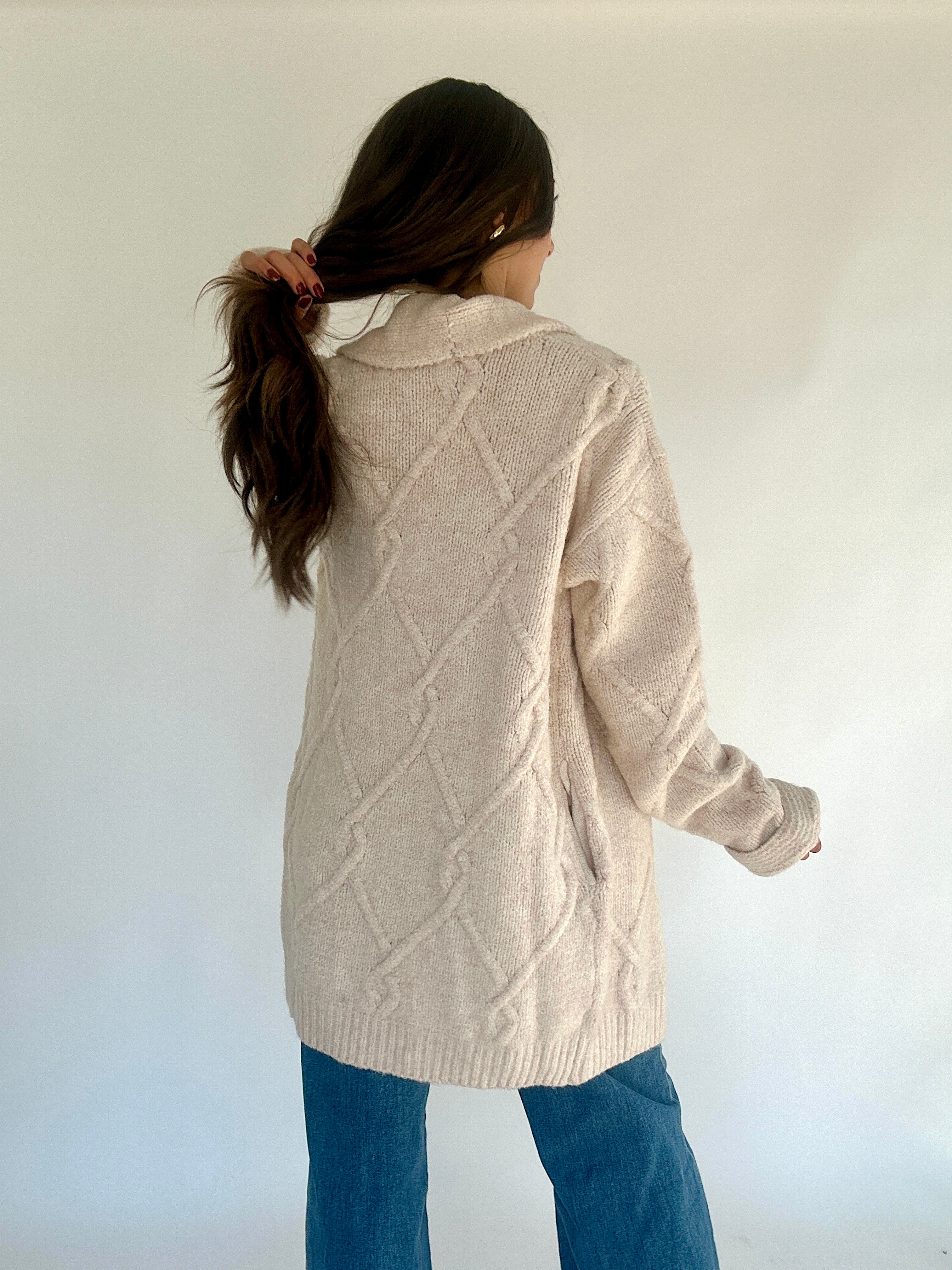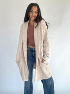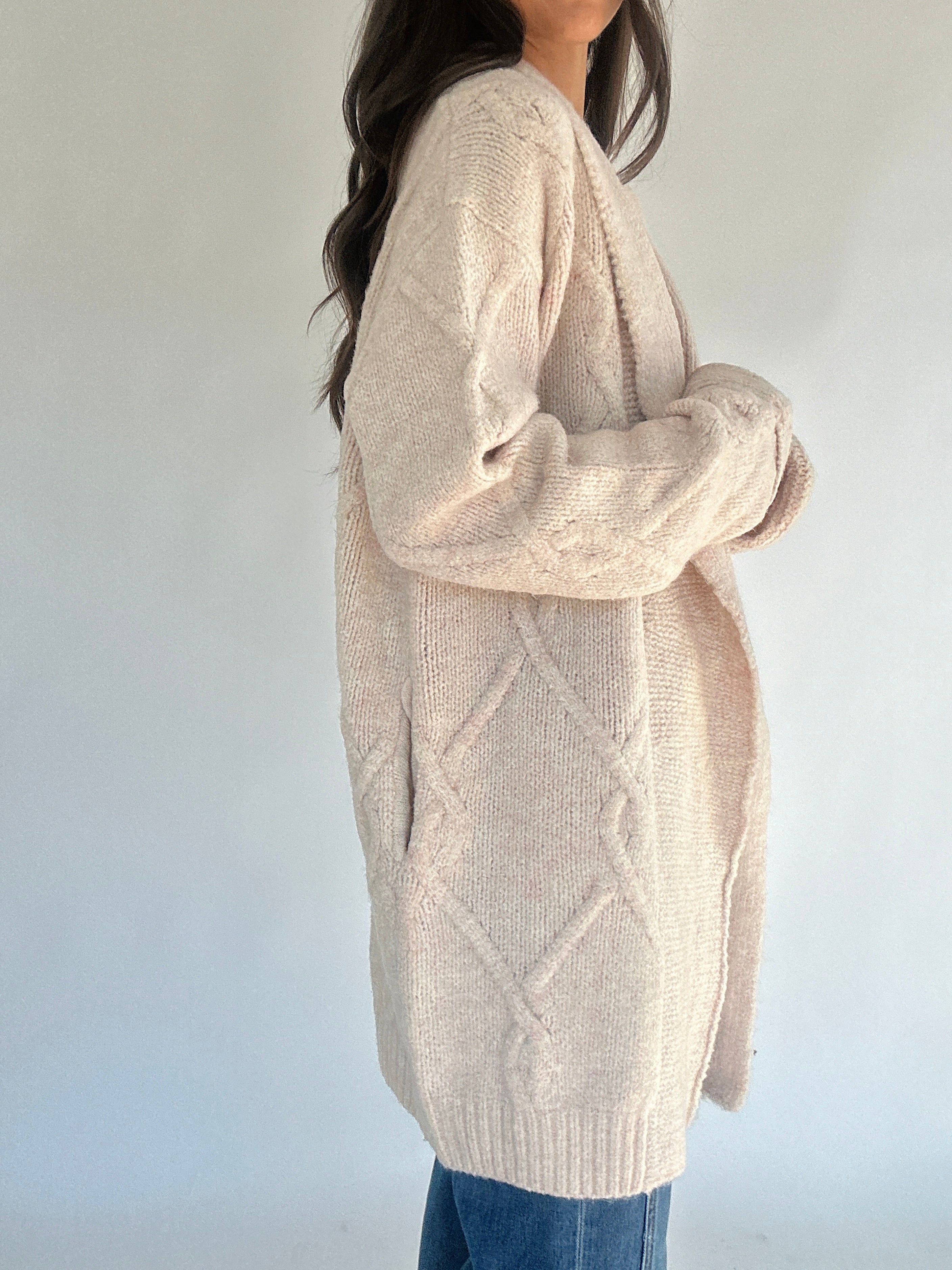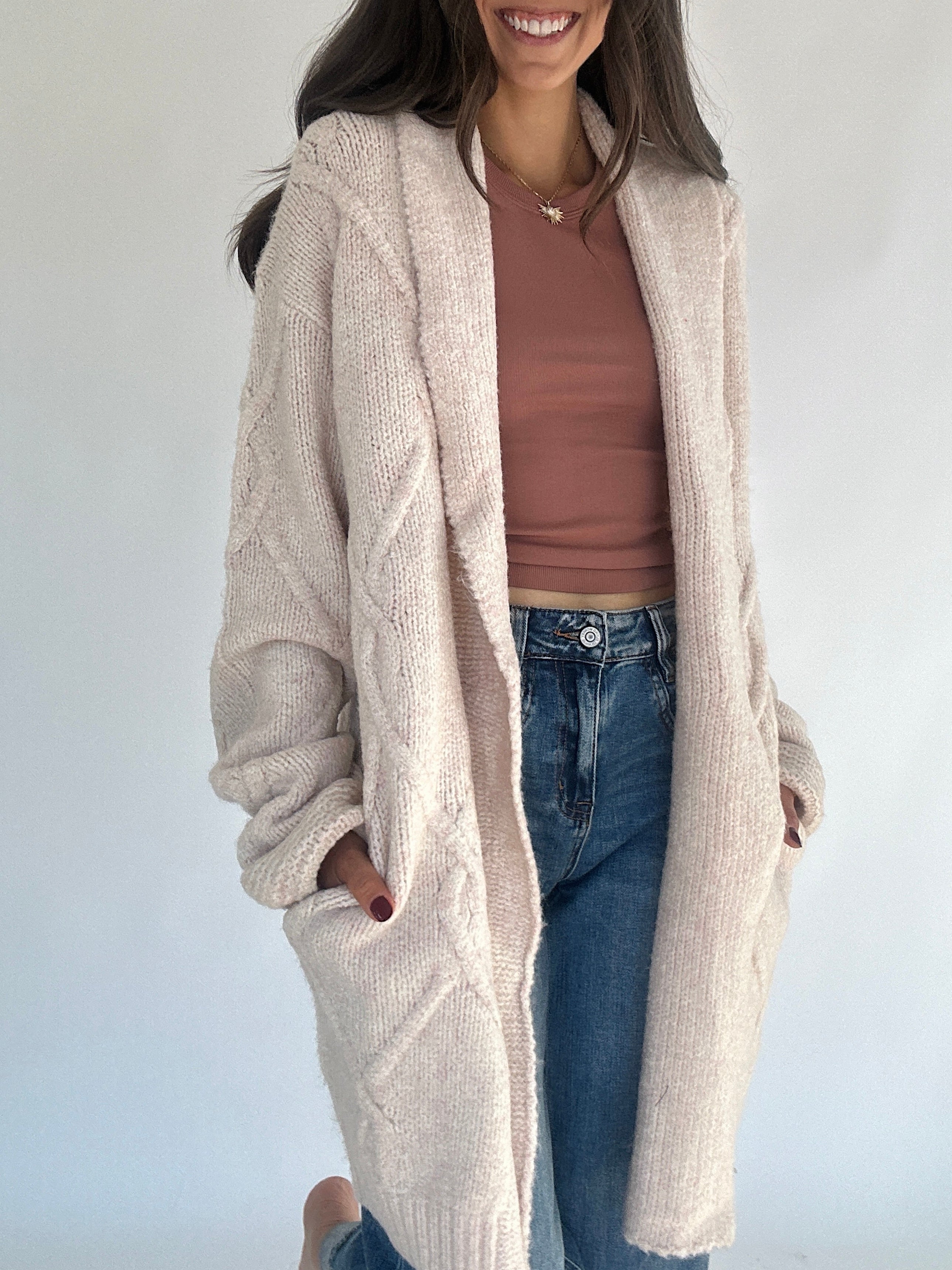 This blush pink cable knit cardigan is cute and so cozy! It has an open front with ribbed hems, rolled cuffs and slightly dropped shoulders that give it a relaxed, comfy fit!
