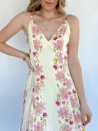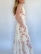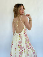 This ivory midi dress has beautiful pink floral pattern throughout. The adjustable spaghetti straps meet to tie together creating an open back with buttons underneath. It also has side pockets! Wear with sandals or sneakers and layer with a cute cardigan or denim jacket!