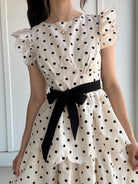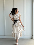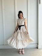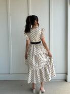 This cream and black polkadot midi dress is feminine, flirts and perfect for photos or your next event! It has a high neckline with ruffled capped sleeves, a tiered bottom with scalloped edges and a black waist sash.