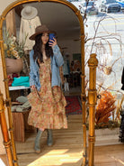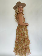 This warm leaves printed midi dress is giving the sweetest vibes. It has a v-neckline with a ruched bust, empire waist, ruffled hem and self tie ribbon straps. Pair it with heels for your next event or wear it with a cardigan and sneakers for brunch with the girls!