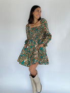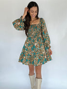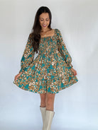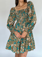 This teal and brown floral printed mini dress is perfect for fall with your favorite boots! It has a square neckline with a smocked top and back, 3/4 bubble sleeves and side pockets.