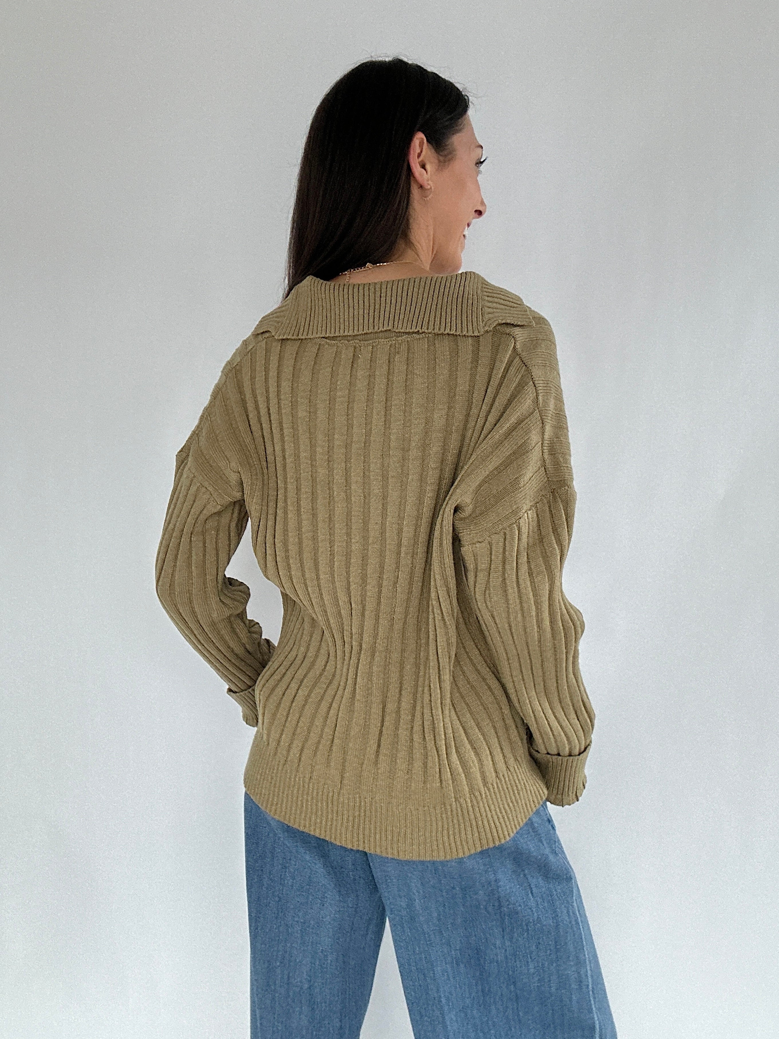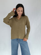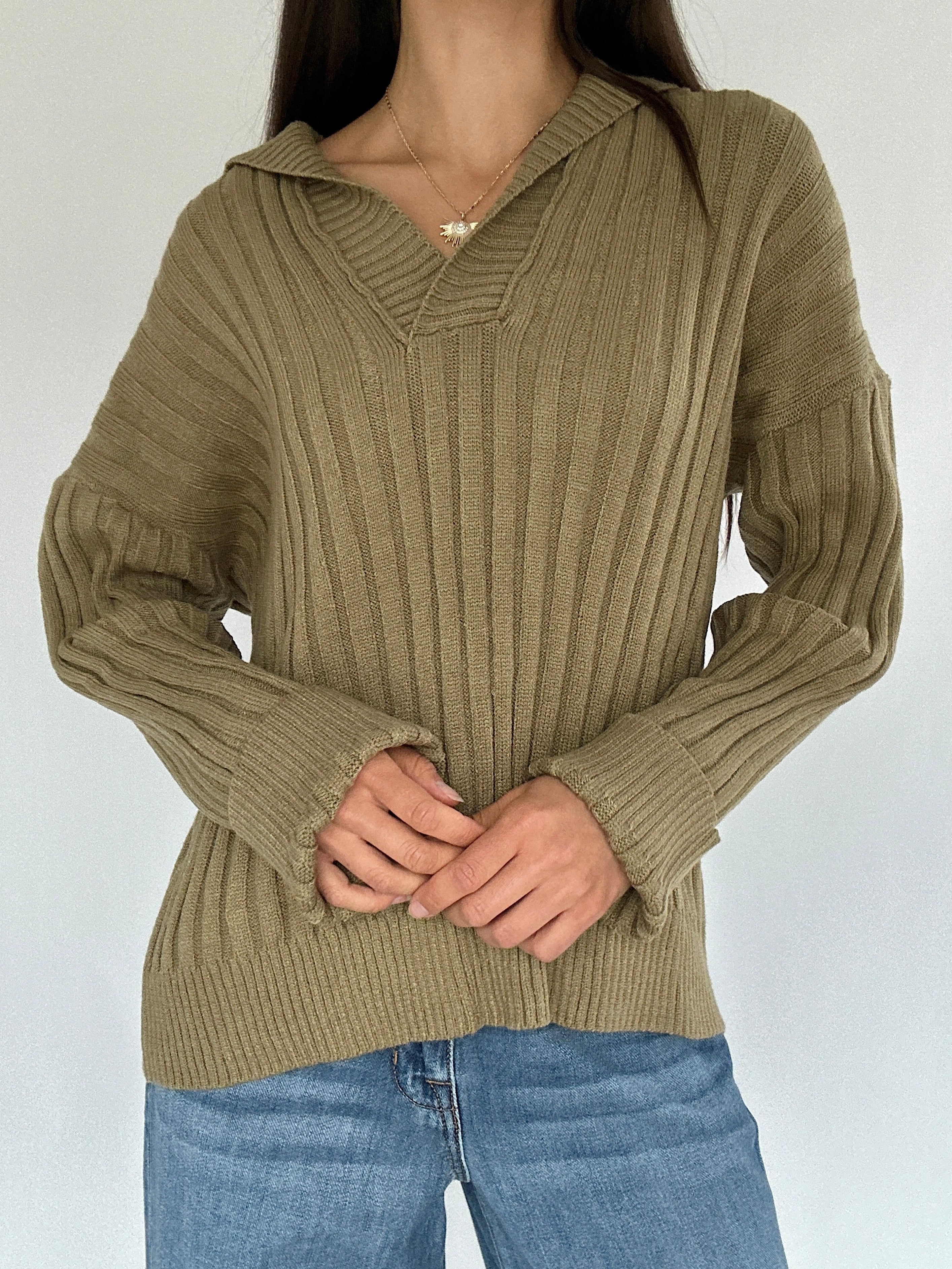 This avocado green ribbed sweater has a v-neckline with collar and dropped shoulders that give it a comfy fit! Pair with denim for an easy outfit to transition you into the next season!