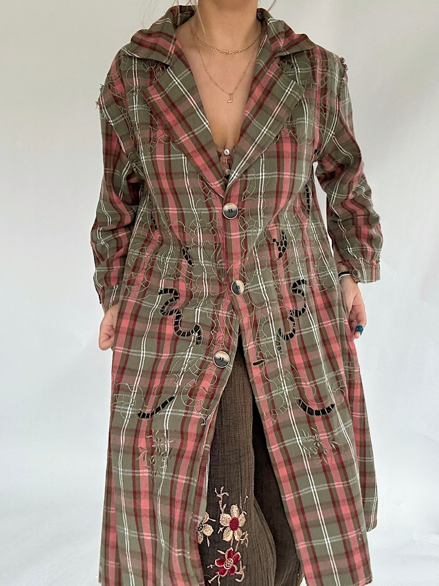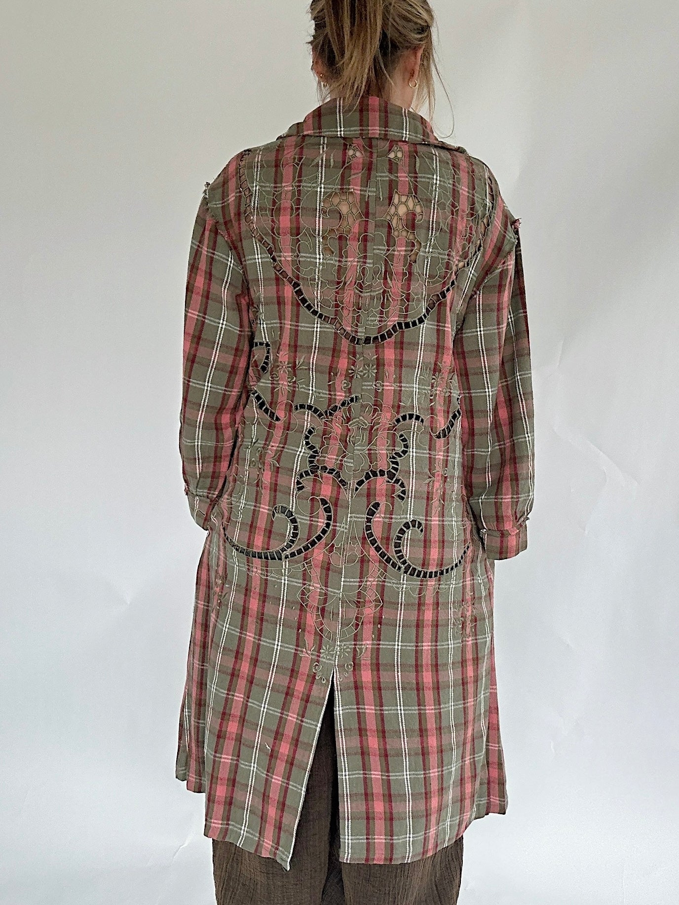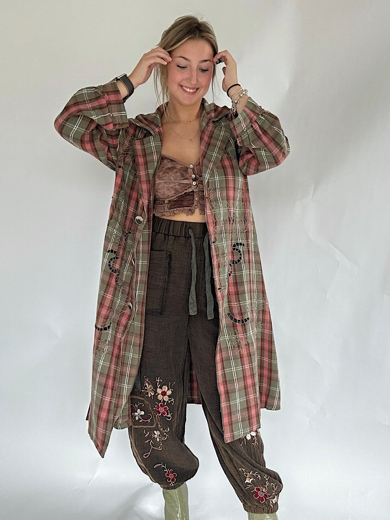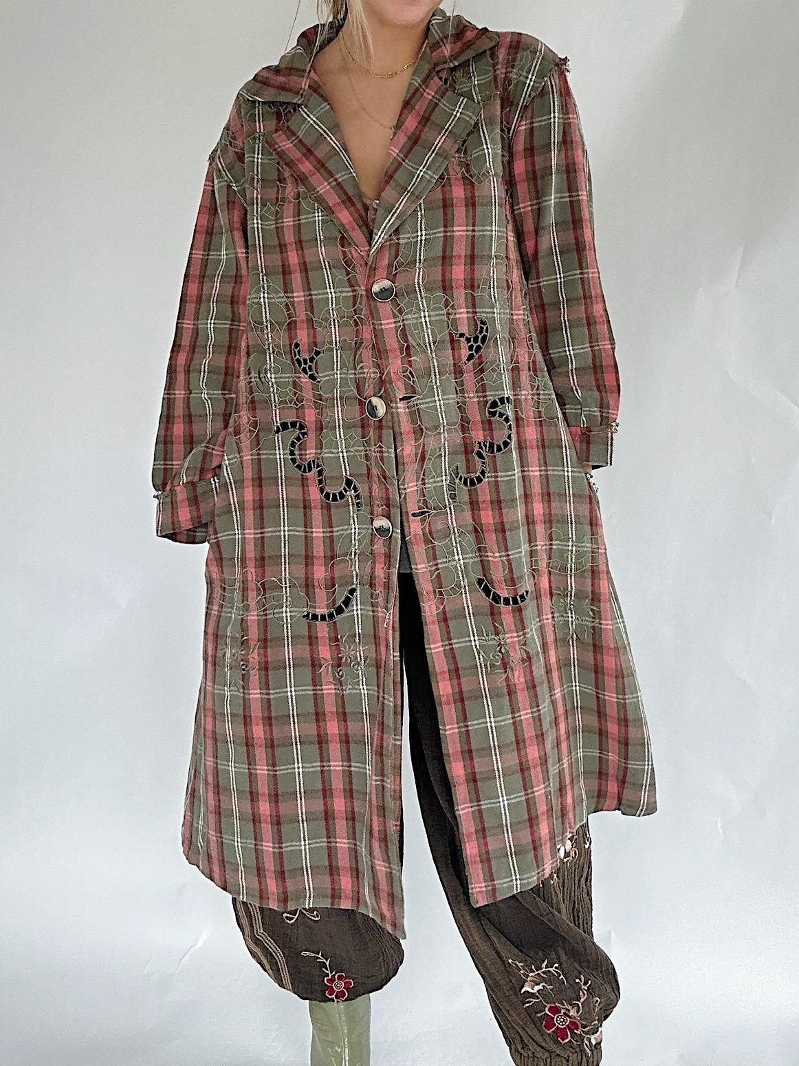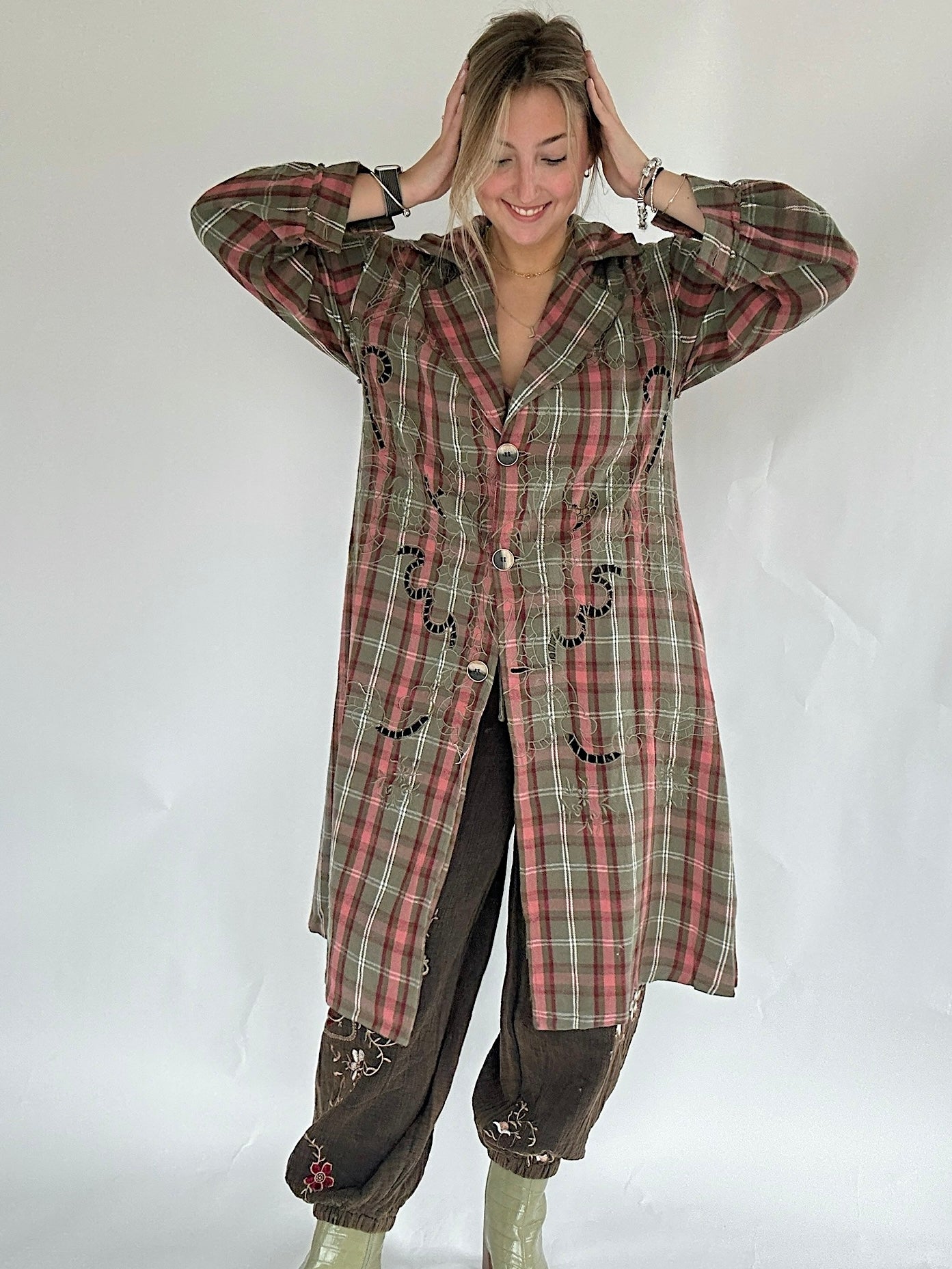 Perfect for weekend outings, chilly coffee runs, or layering over your favorite knits, the By Chance Plaid Jacket is a statement piece with a cozy oversized feel. Designed in an olive and pink plaid, this longline jacket features contrast stitch details, embroidered cut-out patterns throughout, and a lapel collar for that classic touch. A split at the back hem keeps the fit relaxed and easy to wear, while the oversized silhouette makes it perfect for layering.