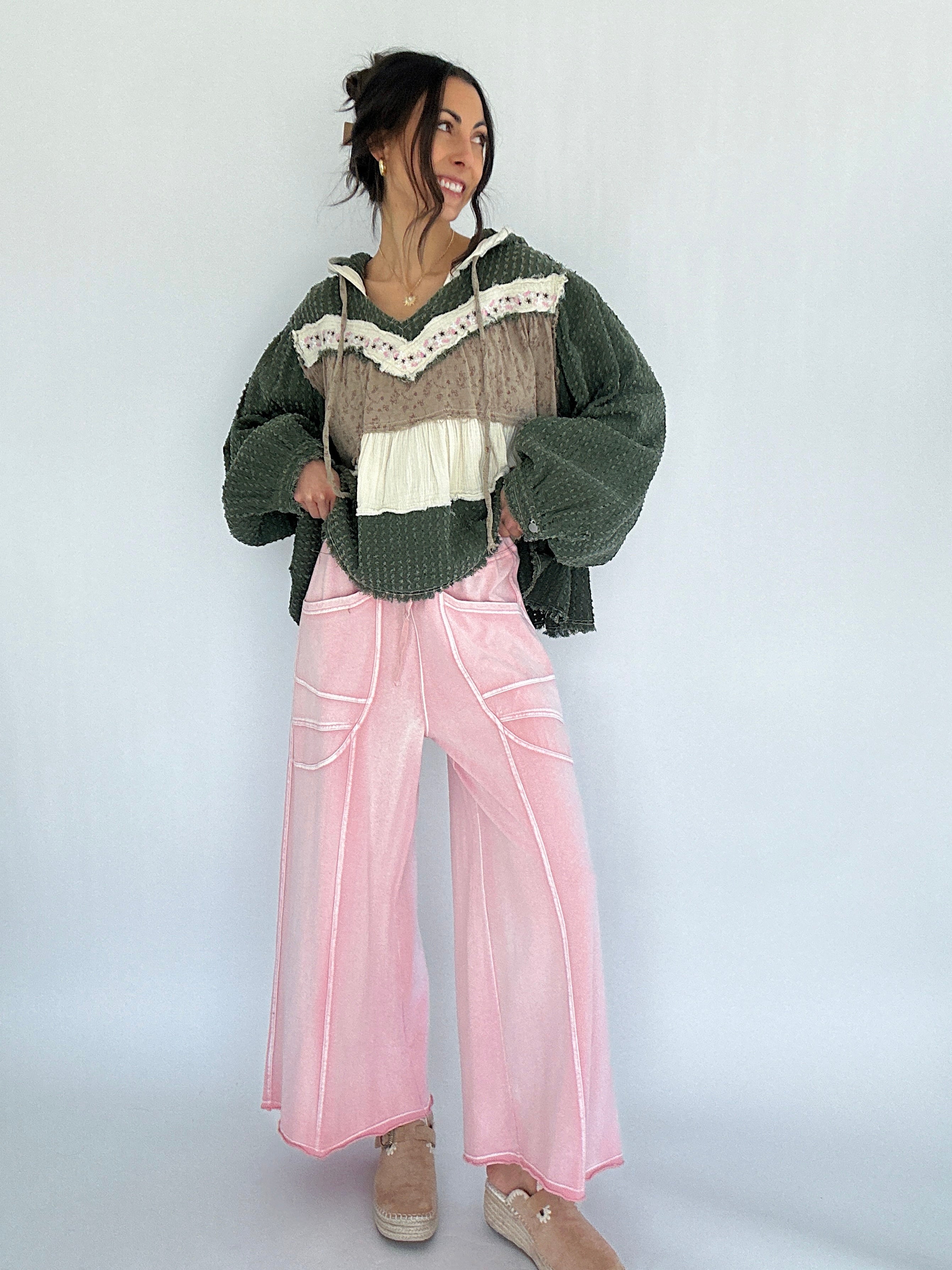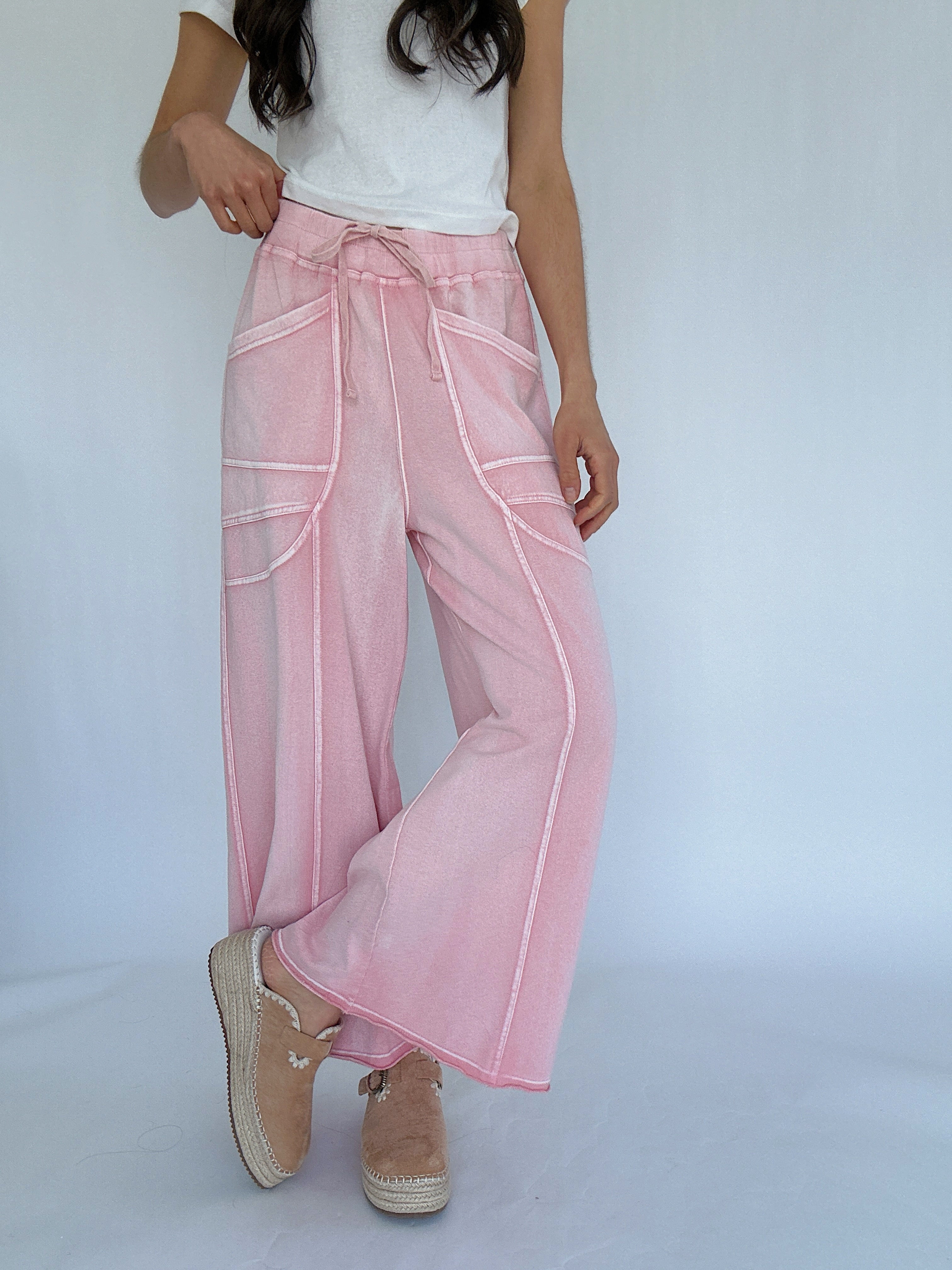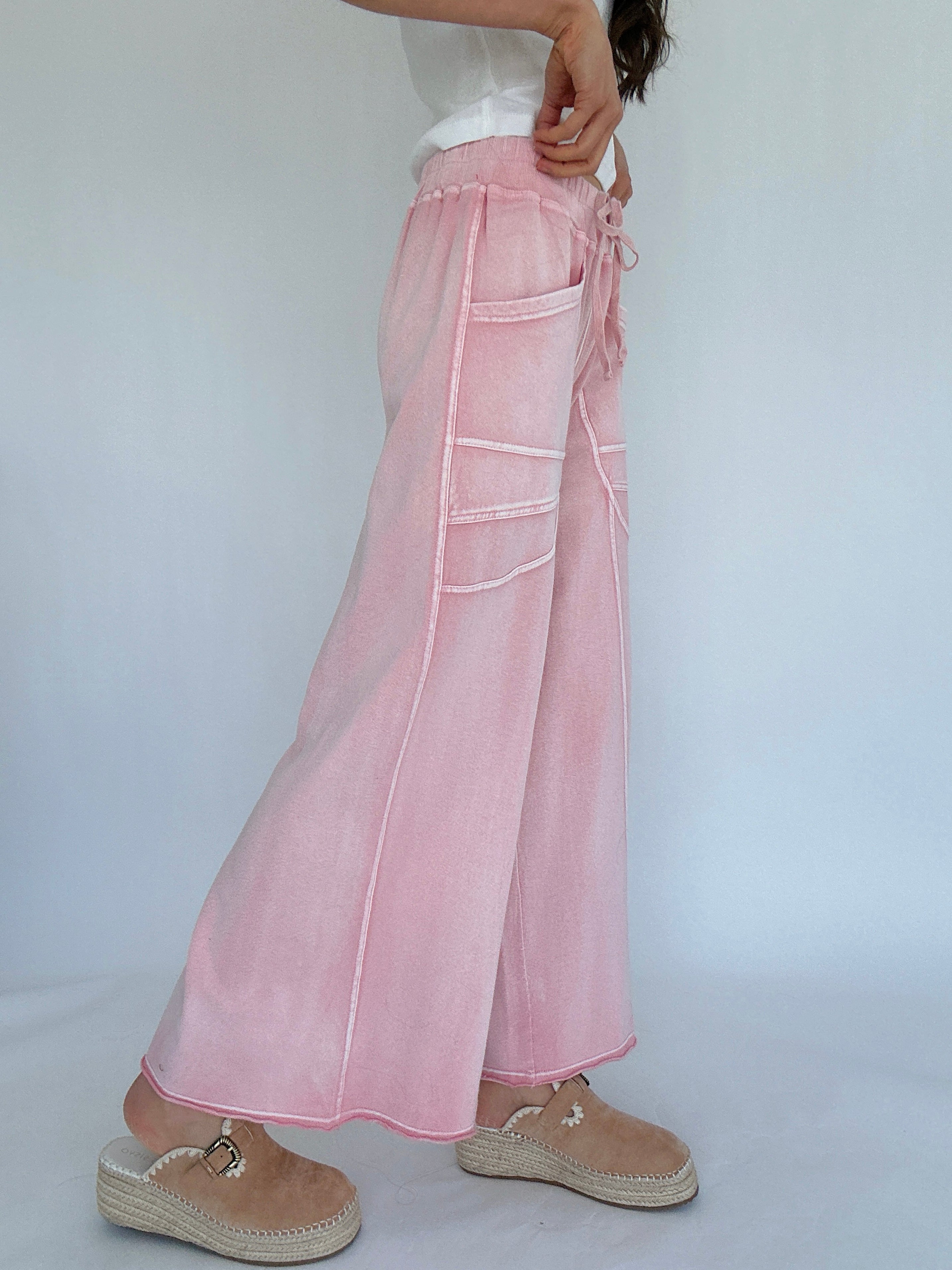 From lounging at home to styled casual days, the Dani Pants are all about comfort without sacrificing style. Designed in a relaxed wide-leg silhouette with a mineral-washed finish, these pants feature exaggerated front patch pockets and exposed contrast stitching for added interest. The elastic waistband with drawstring tie keeps them easy and wearable, especially when paired with the matching Dani Top for a cute set vibe!