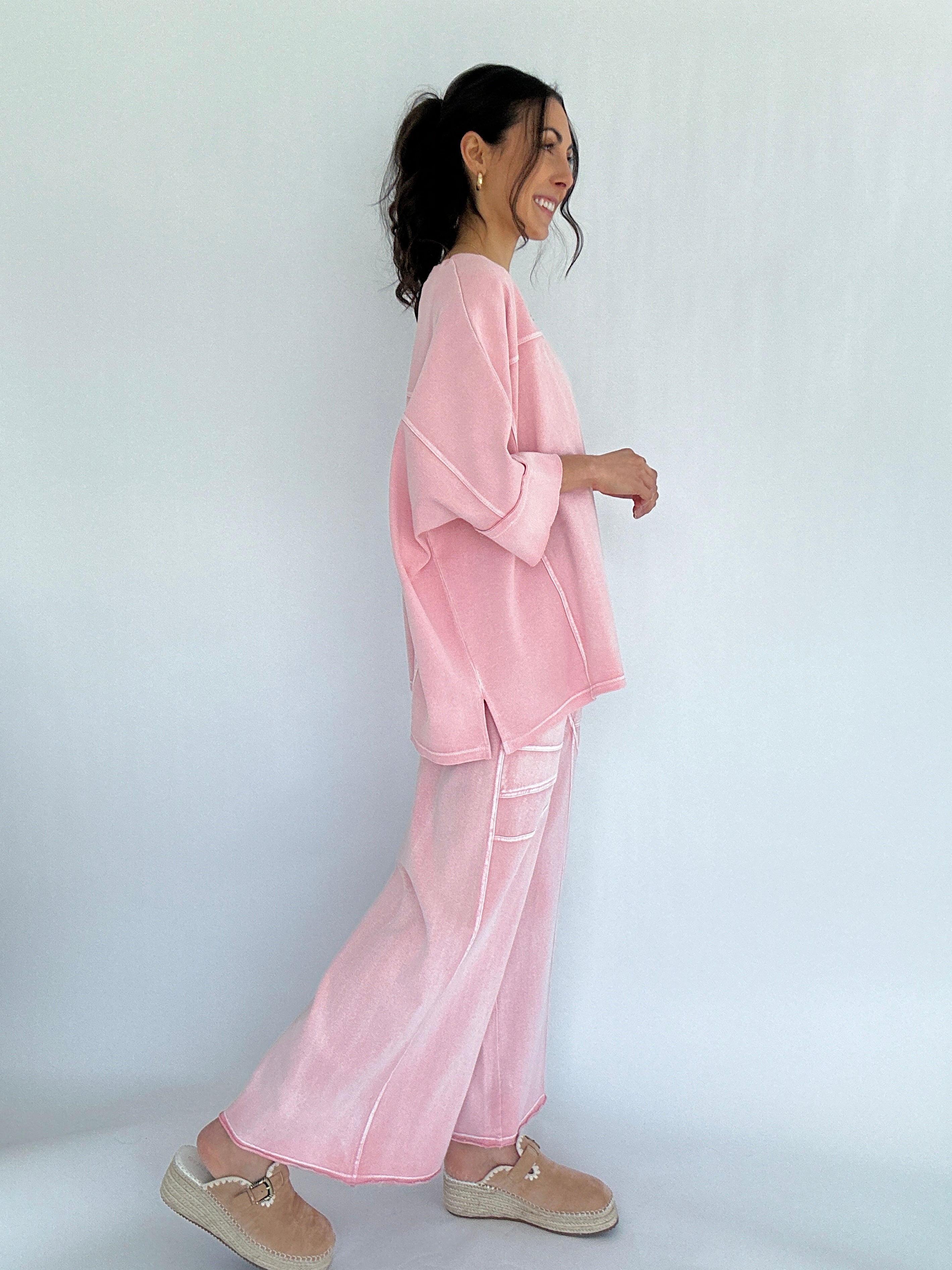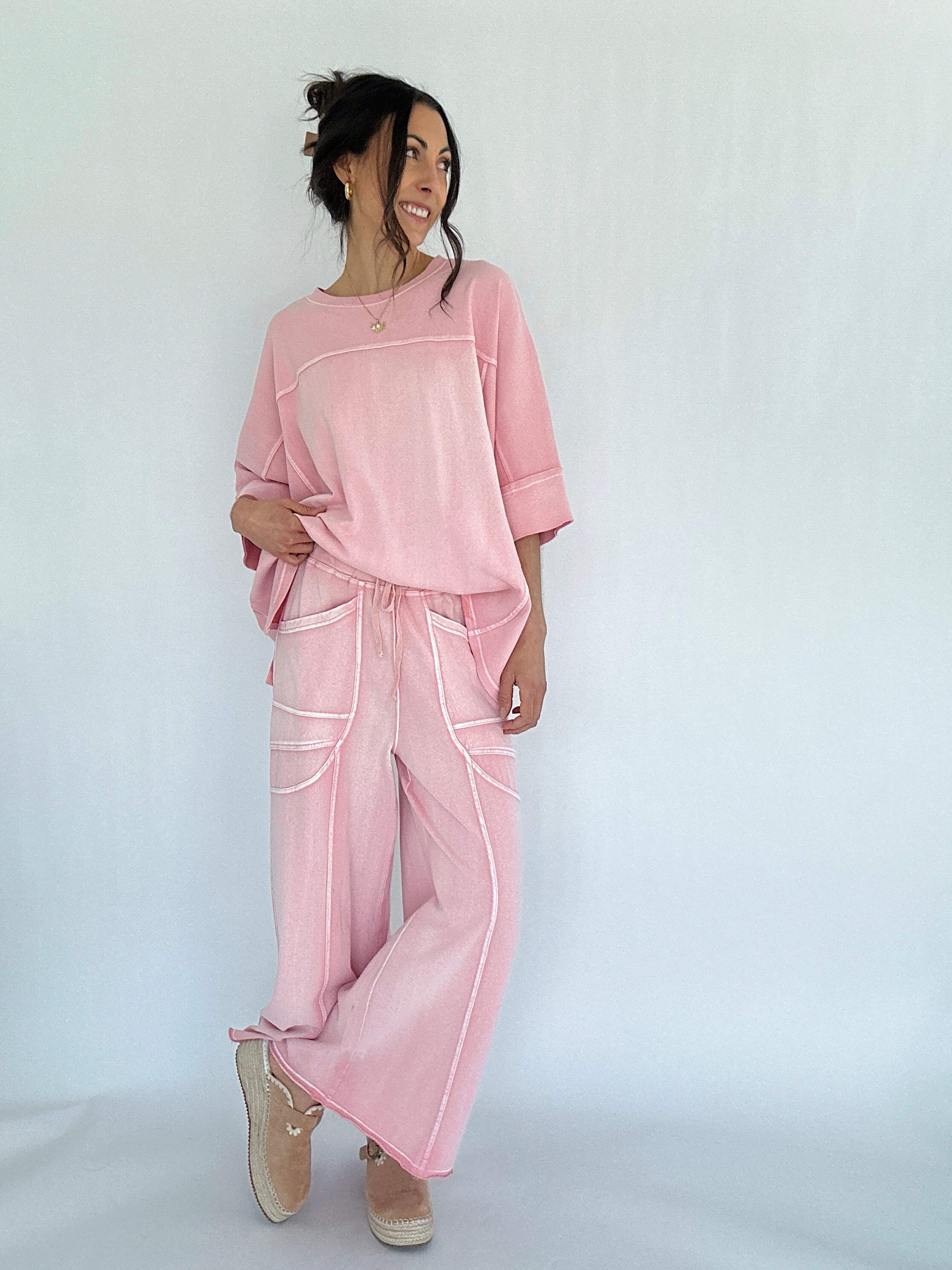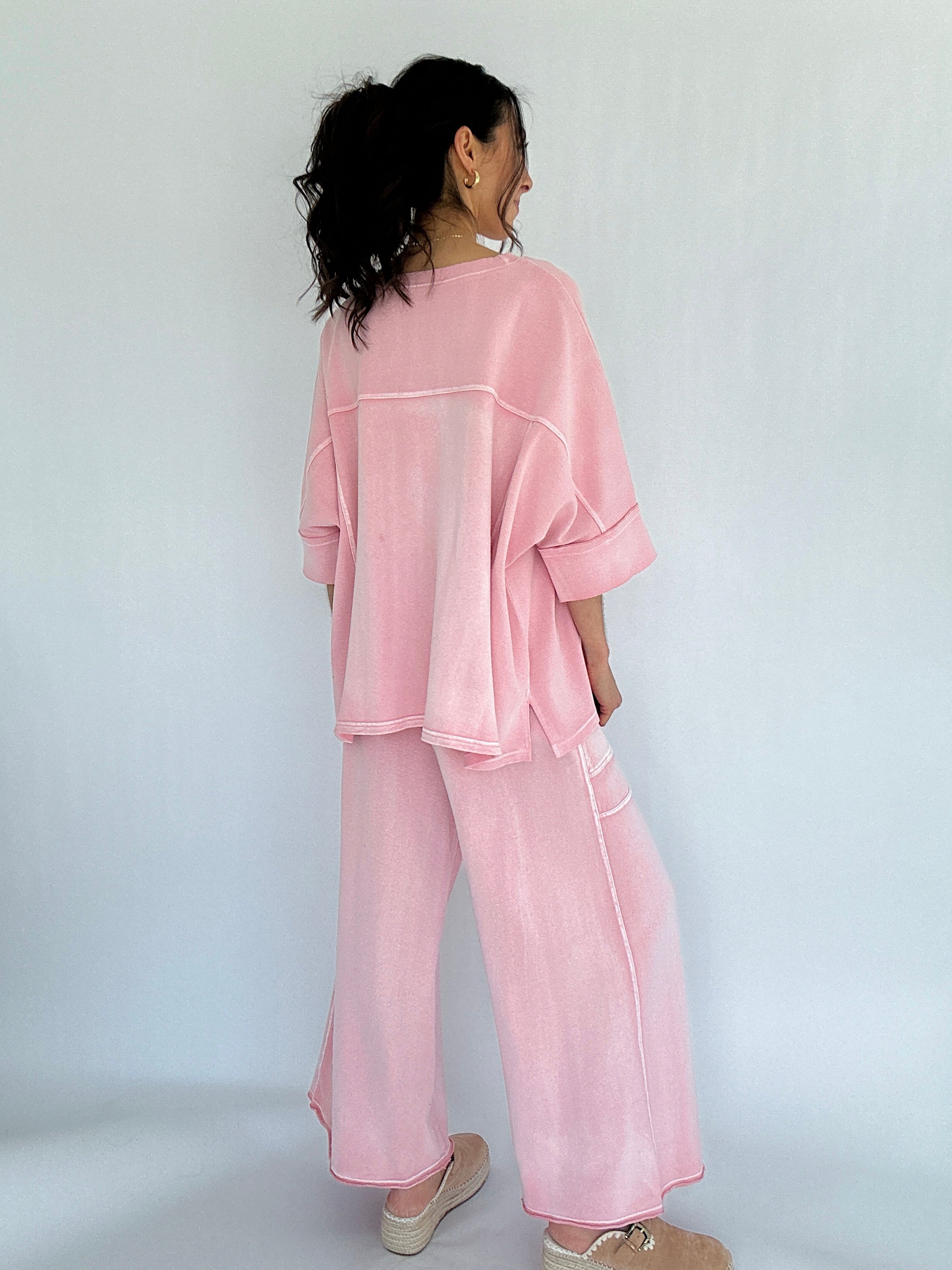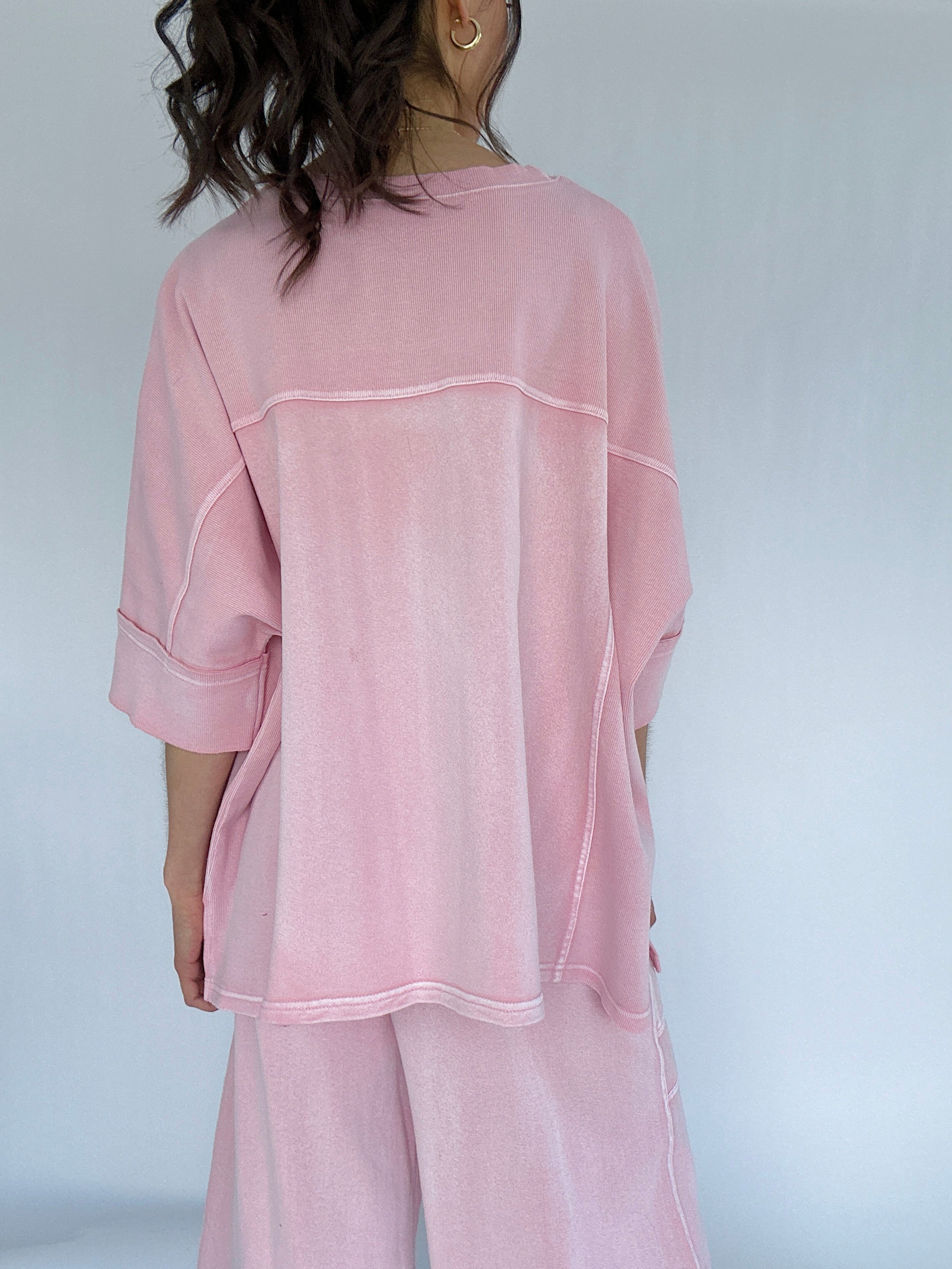 From slow mornings at home to errands and casual days out, the Dani Top is the kind of piece you’ll want to live in. Designed with an oversized, boxy silhouette and a soft mineral-washed finish, this top blends comfort with just enough detail to feel styled. Exposed seams, wide 3/4 sleeves, and side slits give it an easy, laid-back look that pairs perfectly with the matching Dani Pants—or your favorite denim.