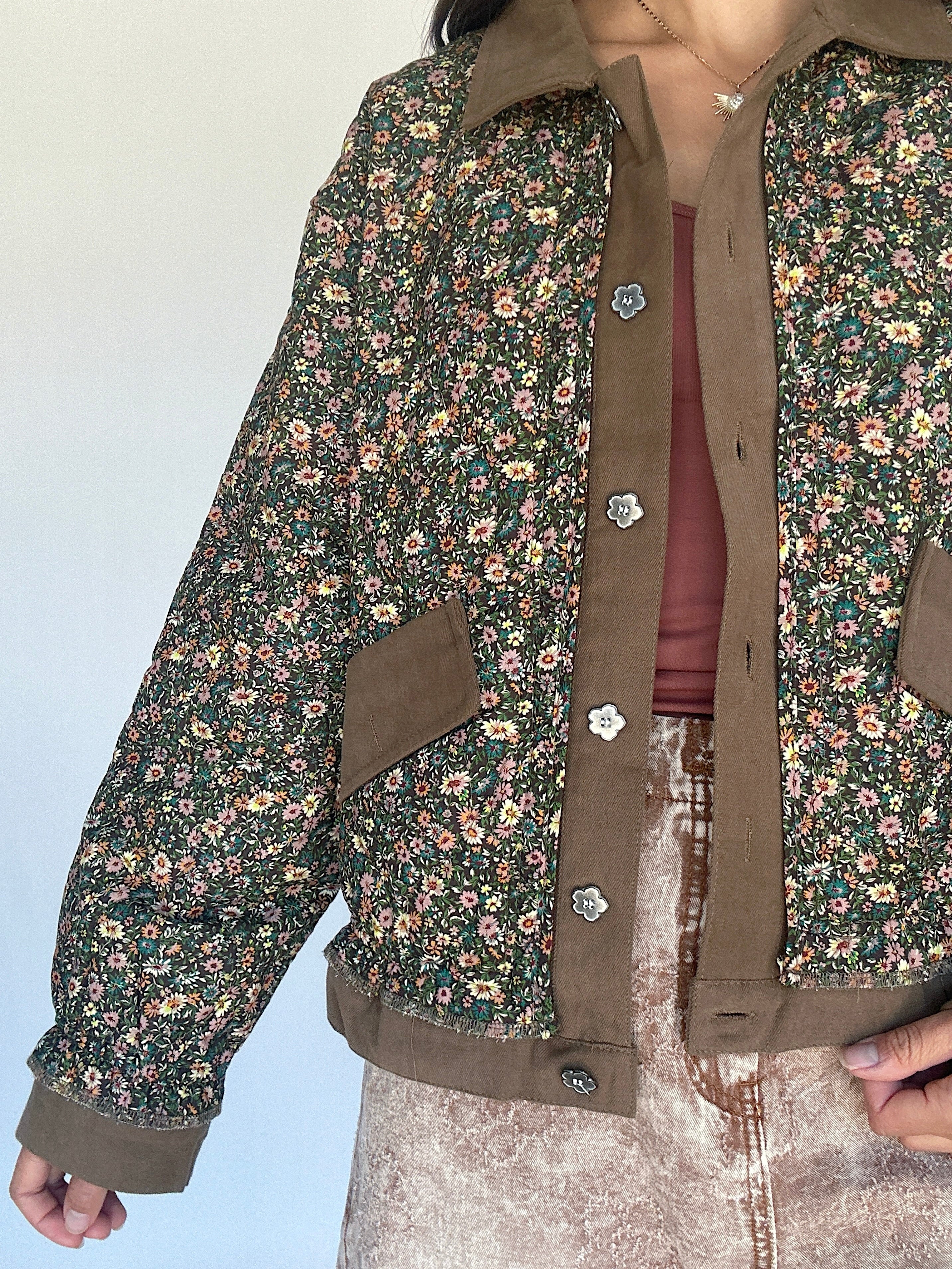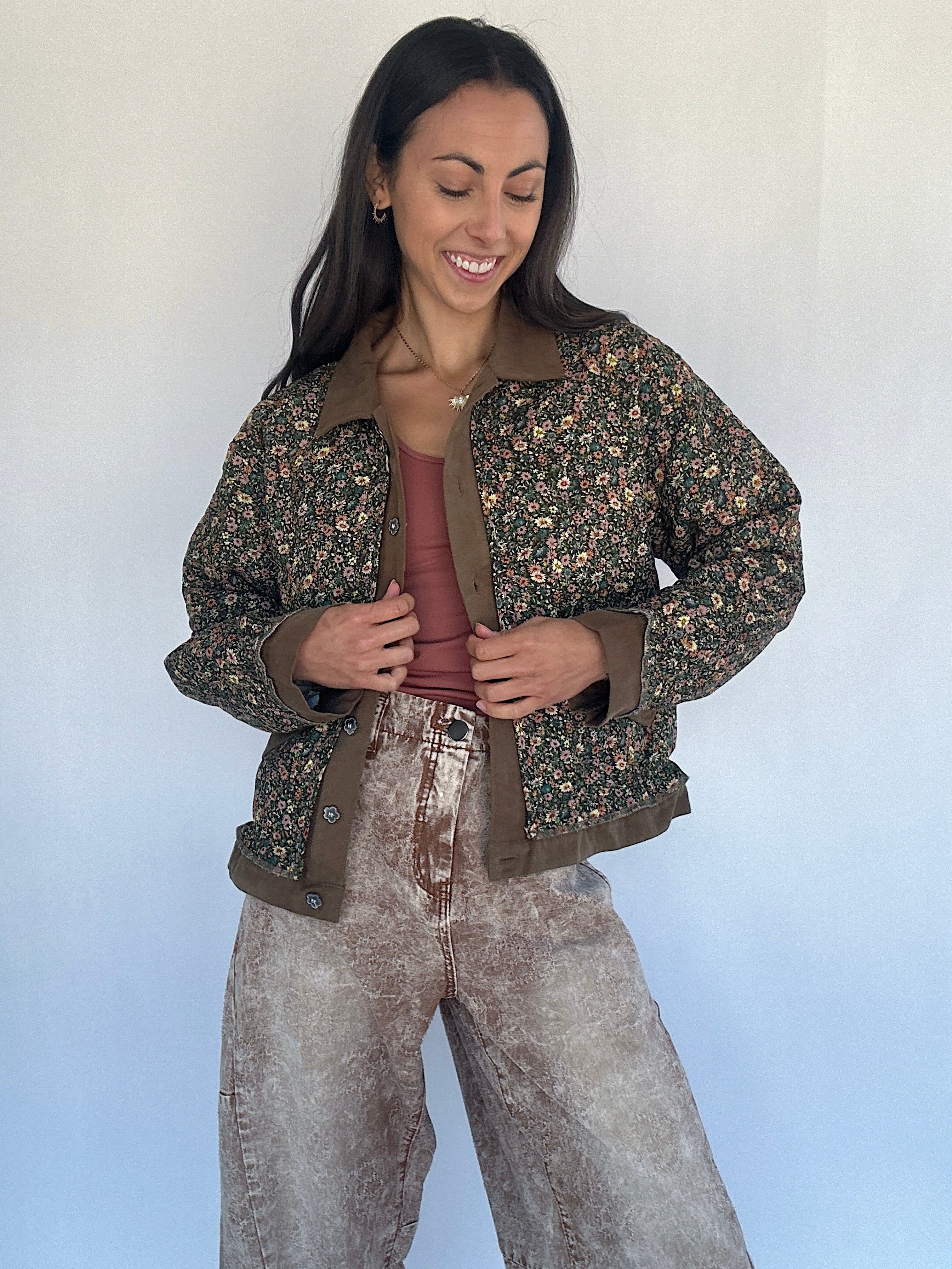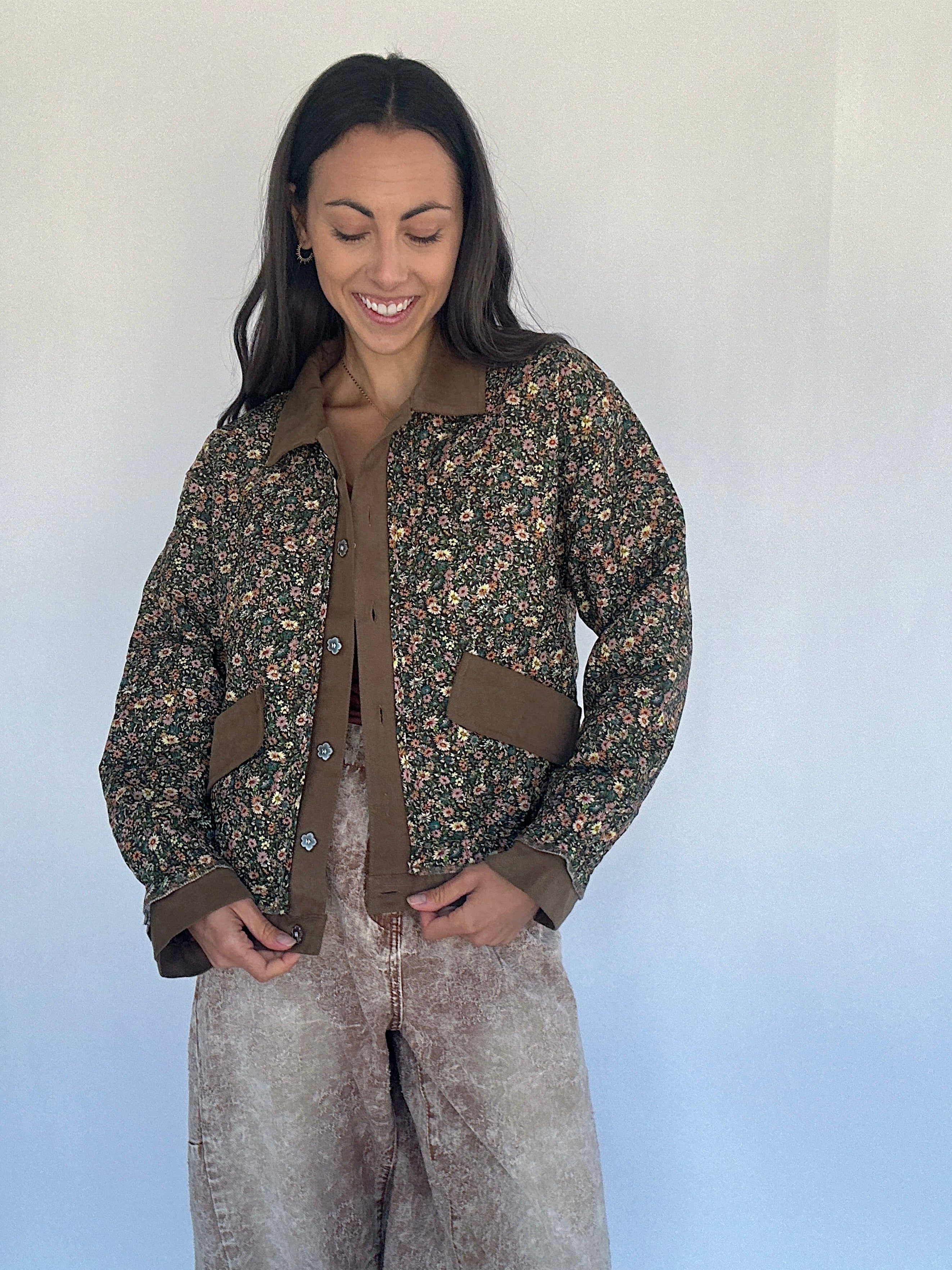 Perfect for crisp fall mornings or layering over casual weekend looks, the Dare To Dream Quilted Jacket blends classic barn-style charm with a dainty floral twist. The chocolate brown base is adorned with an all-over floral print, while the contrasting brown twill placket and collar give it a casual, structured feel. Flower-shaped metal buttons and side pockets add thoughtful details, making this quilted jacket an eye-catcher!