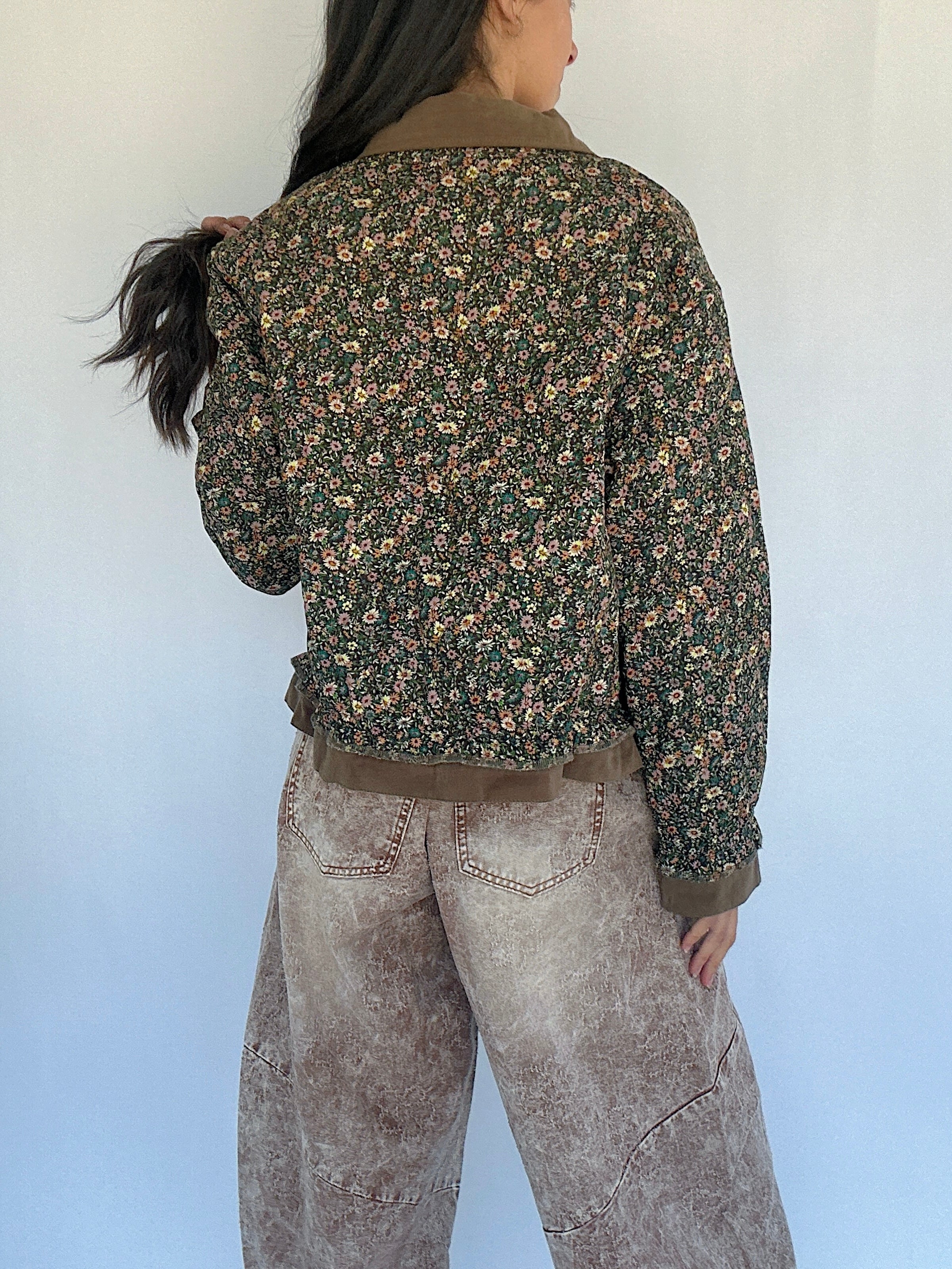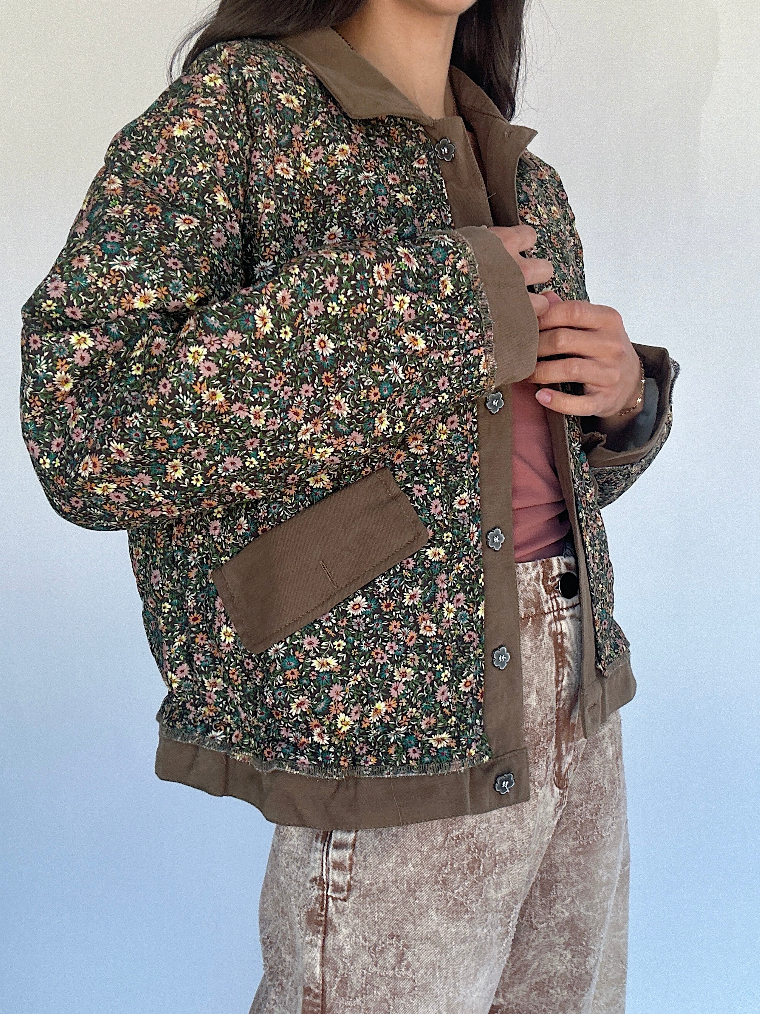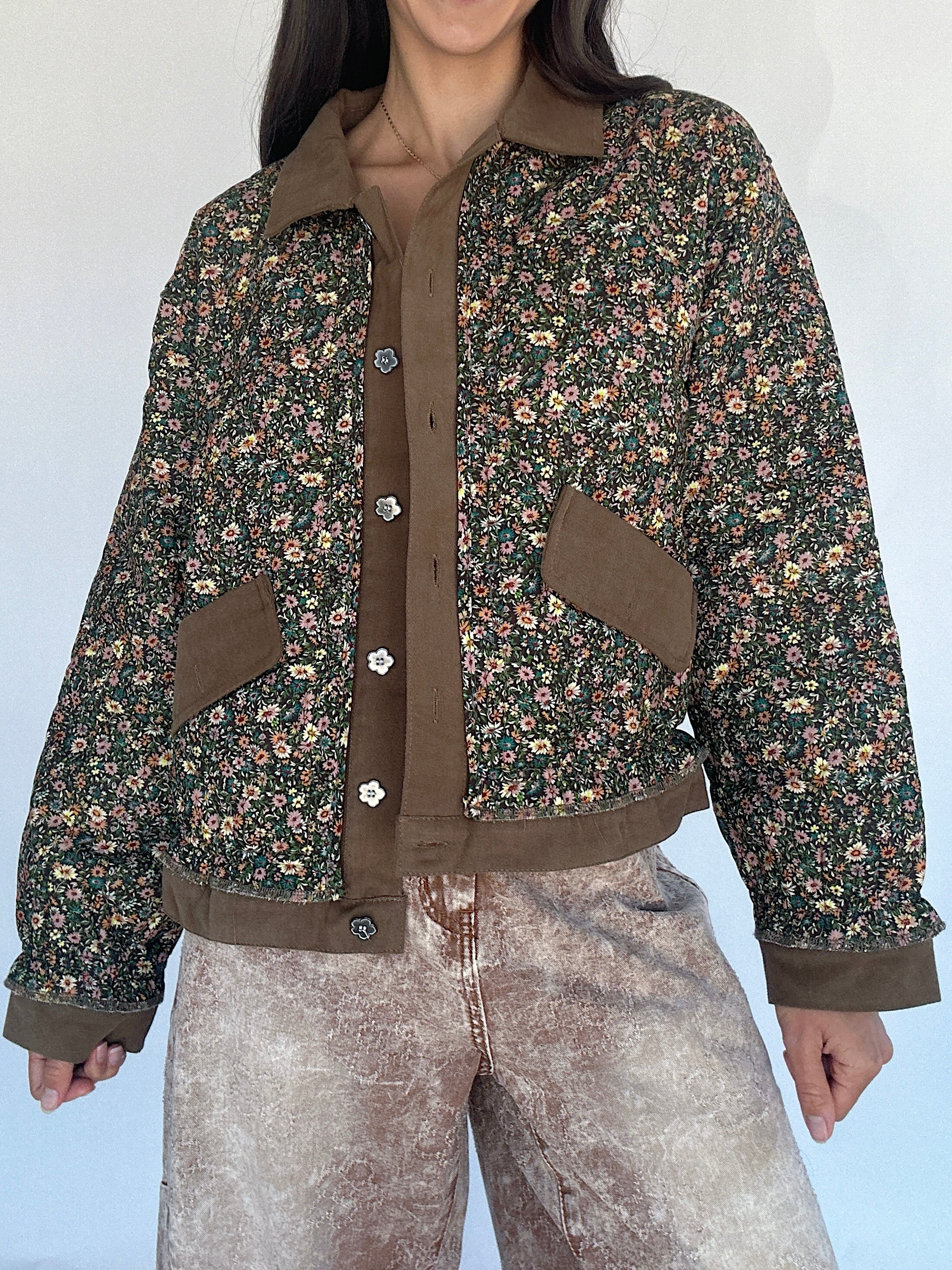 Perfect for crisp fall mornings or layering over casual weekend looks, the Dare To Dream Quilted Jacket blends classic barn-style charm with a dainty floral twist. The chocolate brown base is adorned with an all-over floral print, while the contrasting brown twill placket and collar give it a casual, structured feel. Flower-shaped metal buttons and side pockets add thoughtful details, making this quilted jacket an eye-catcher!