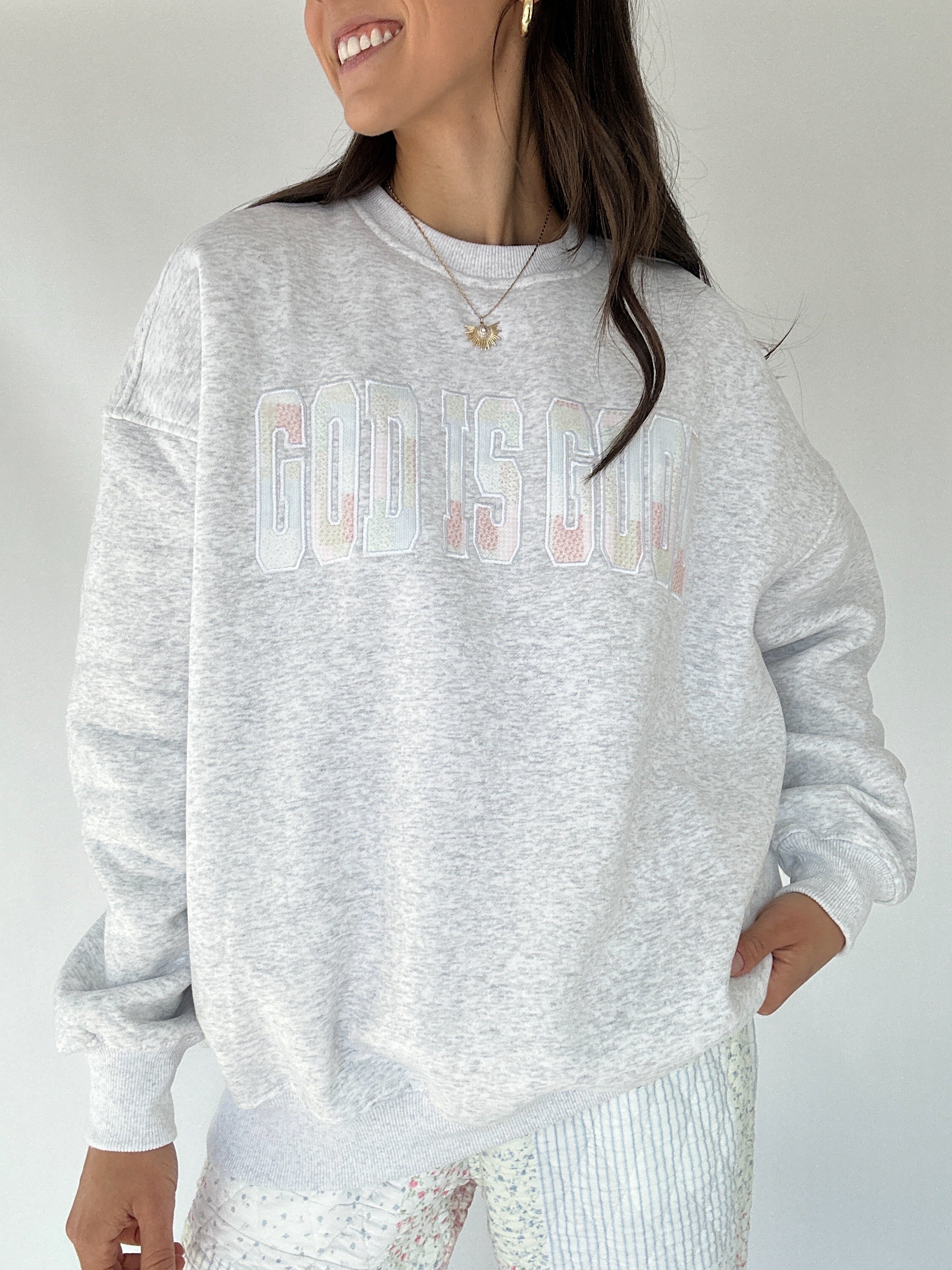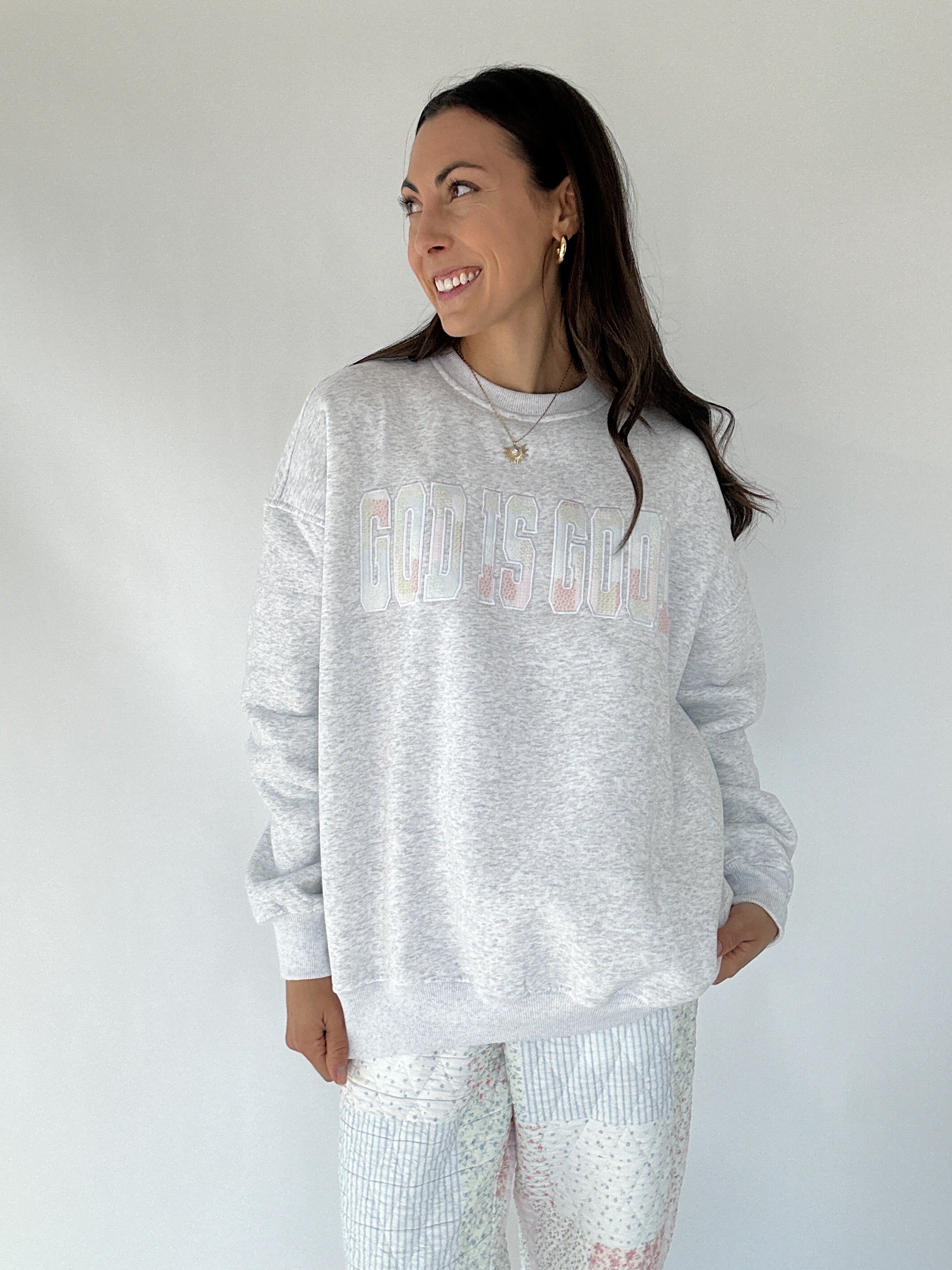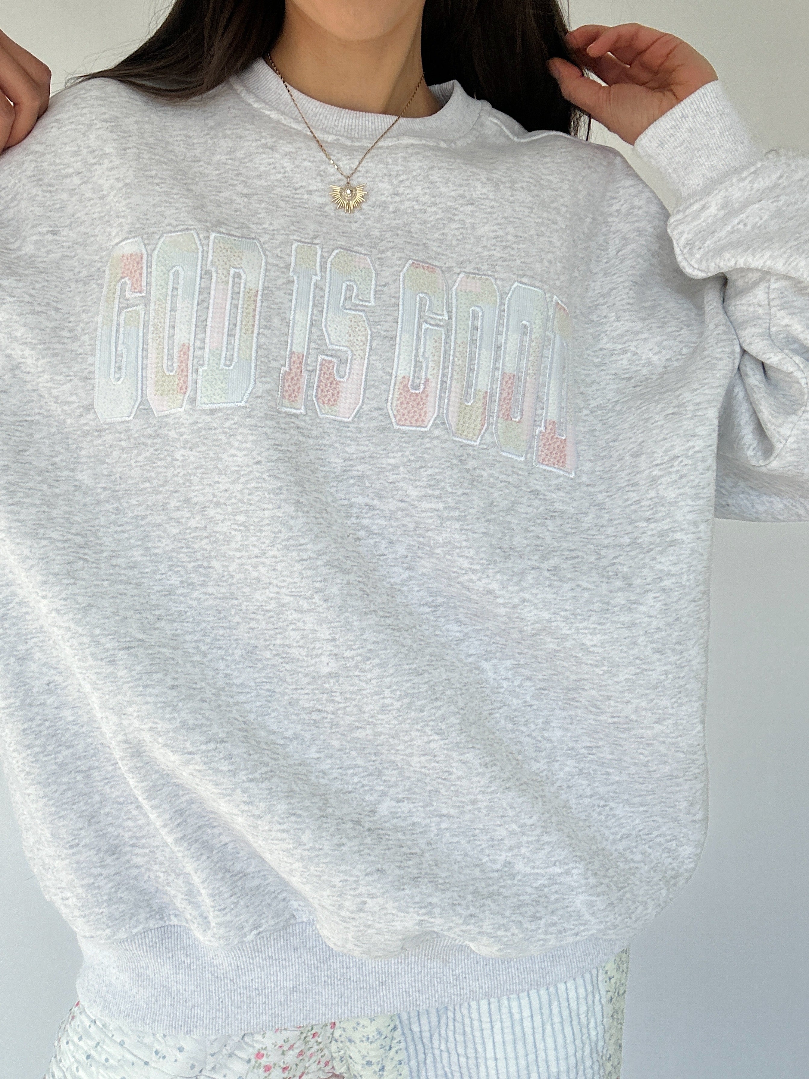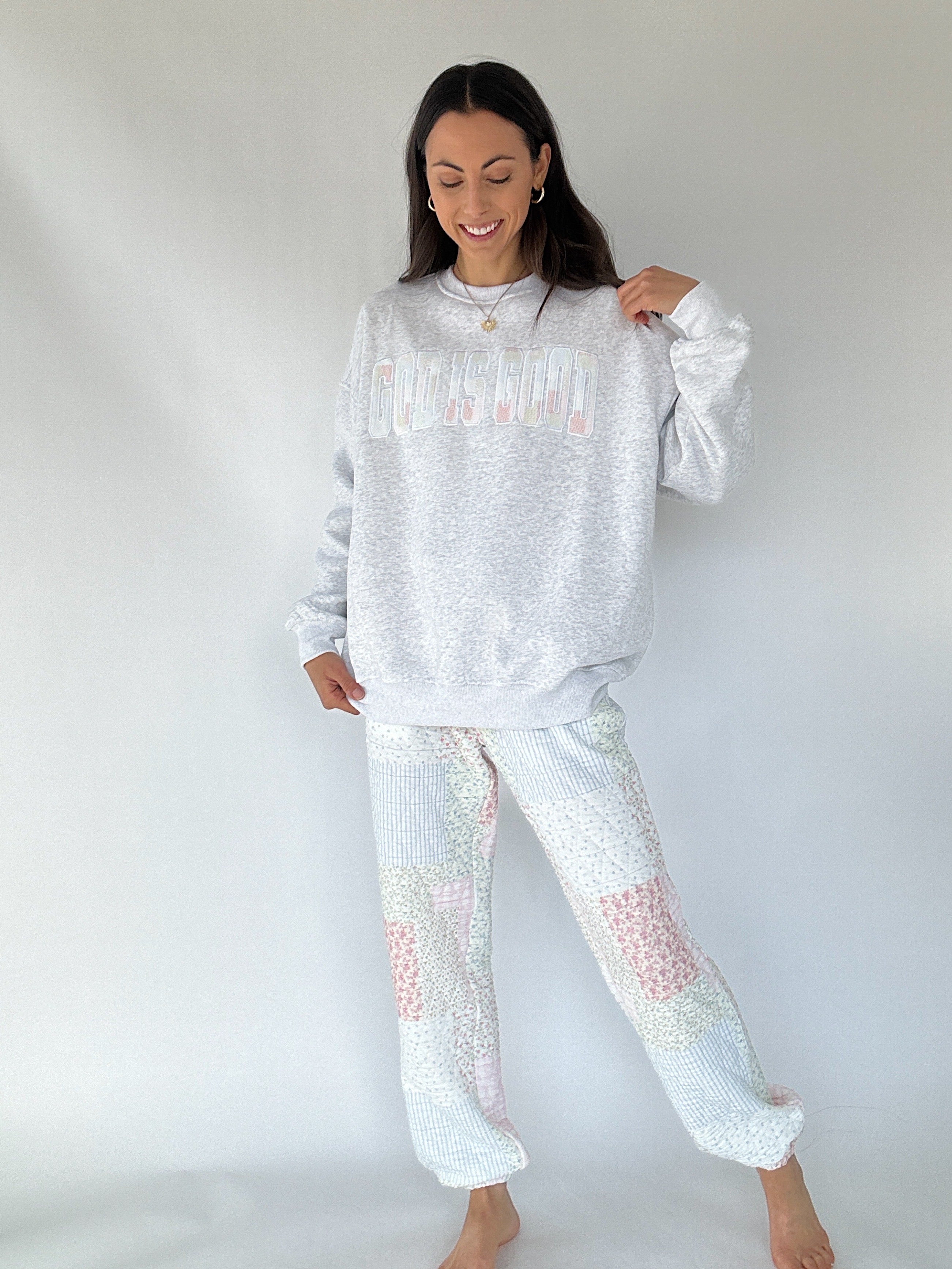 God Is Good Embroidered Sweatshirt – A cozy reminder of faith and comfort all in one. This light heather grey crewneck features “God Is Good” embroidered across the front in soft quilted fabric for a subtle yet special touch. With its relaxed, oversized fit and ultra-soft feel, it’s perfect for slow mornings, coffee runs, or layering through the seasons. Pair it with the matching Mellie Quilted Joggers or Shorts for an easy, coordinated look, or mix with your favorite leggings or jeans for everyday wear.