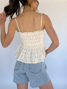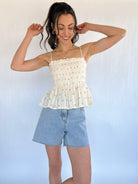 Perfect for warm days when you want something pretty but effortless, the Gracie Floral Smocked Top is all about soft details and an easy fit. Made from the same butter yellow floral fabric as the matching skirt, this top features a square neckline with ruffle trim, a fully smocked bodice, and a gentle peplum hem that adds shape. It’s just as cute worn with the matching skirt as it is with denim or linen pants.