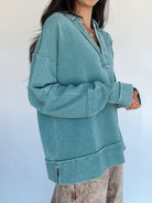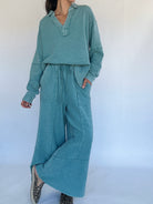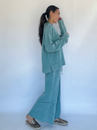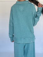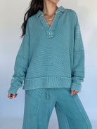 The kind of pullover you’ll want to live in. The Jennie Ribbed Pullover in faded teal is made from a soft, textured thermal with a mineral-washed finish for that perfectly broken-in feel. With its collared neckline, relaxed oversized fit, and side slits, it hits the right balance between cozy and effortlessly adorable. Wear it solo or pair it with the matching pants for a head-to-toe set that’s as comfy as it is versatile!
