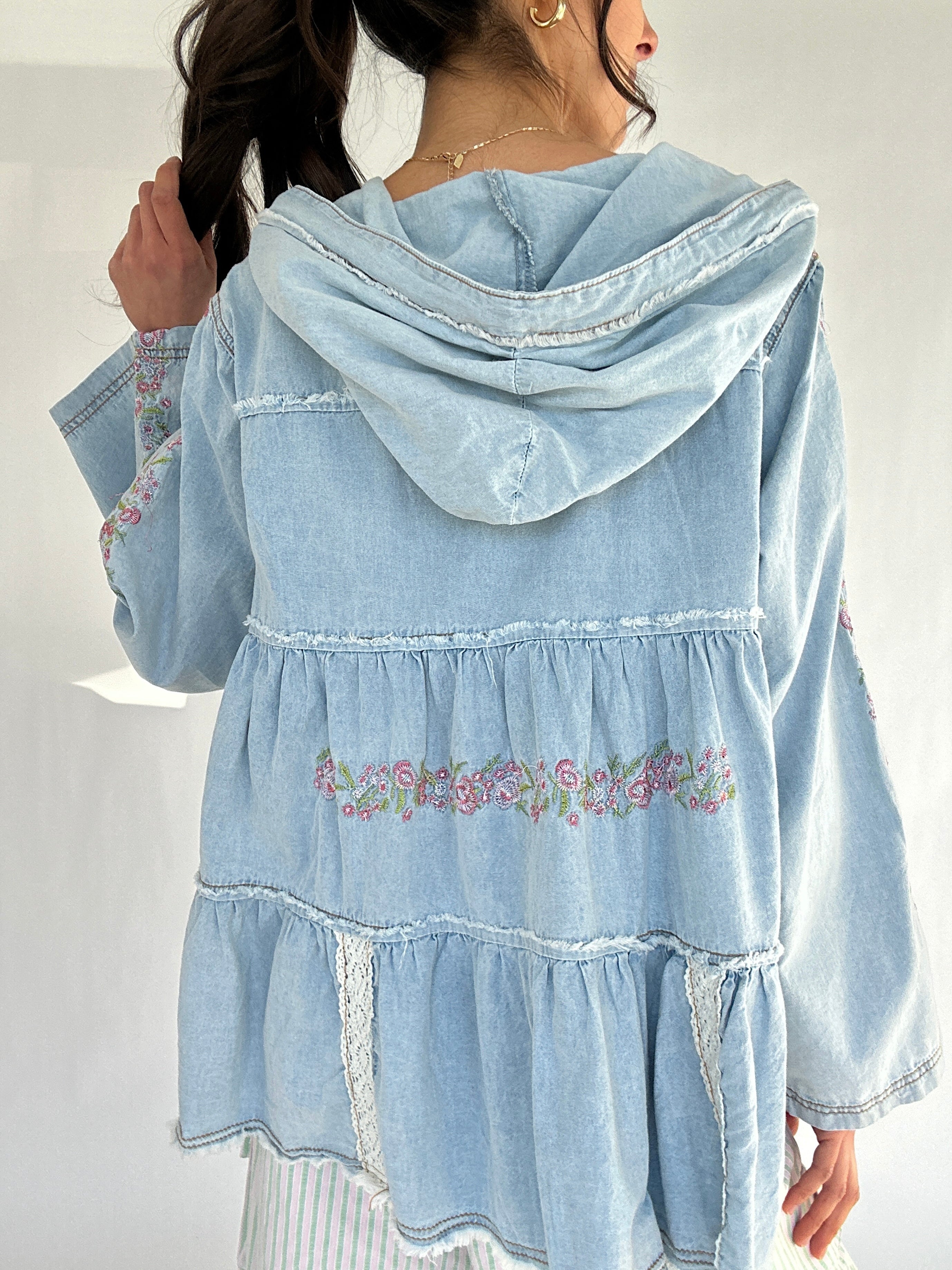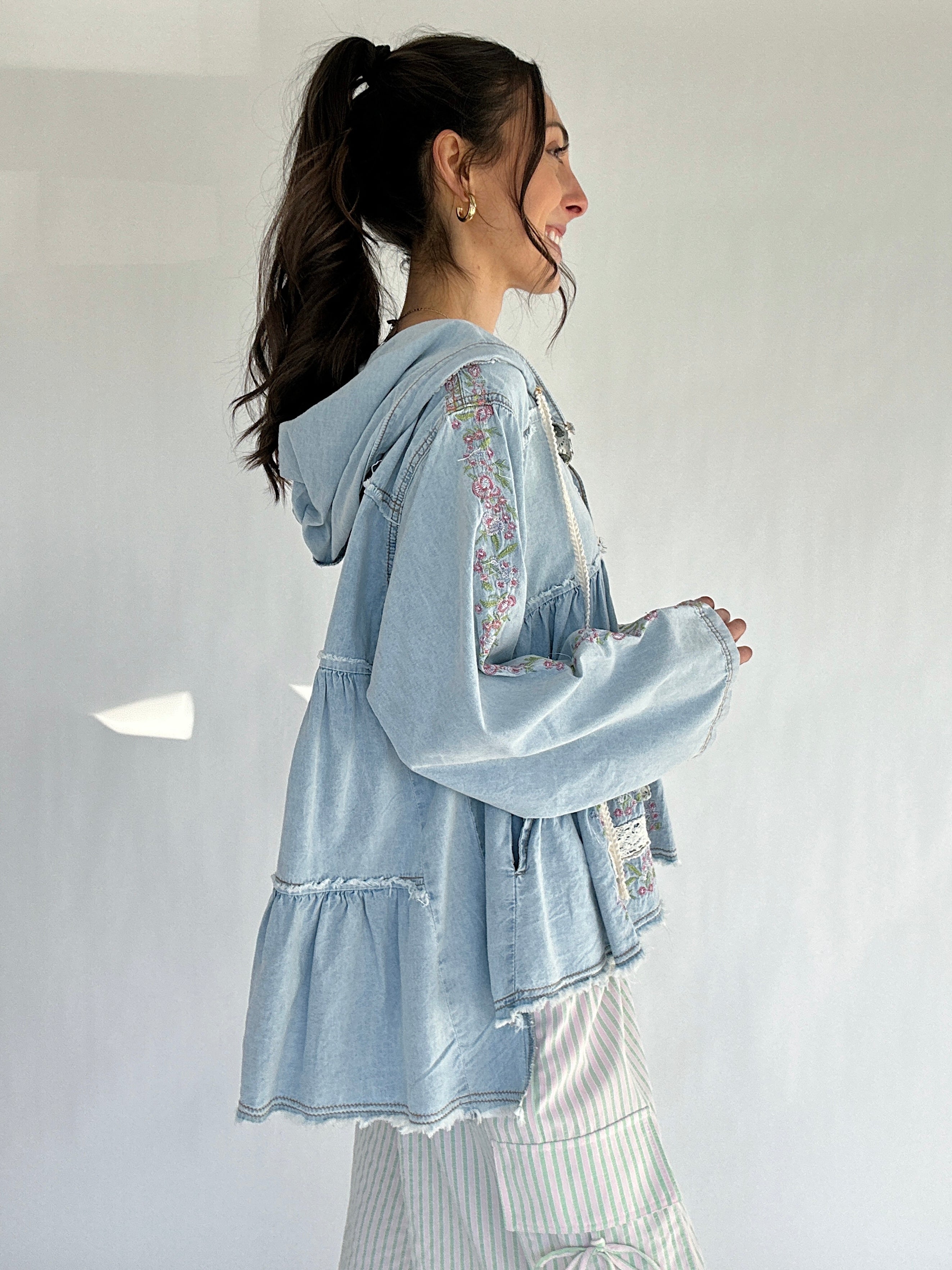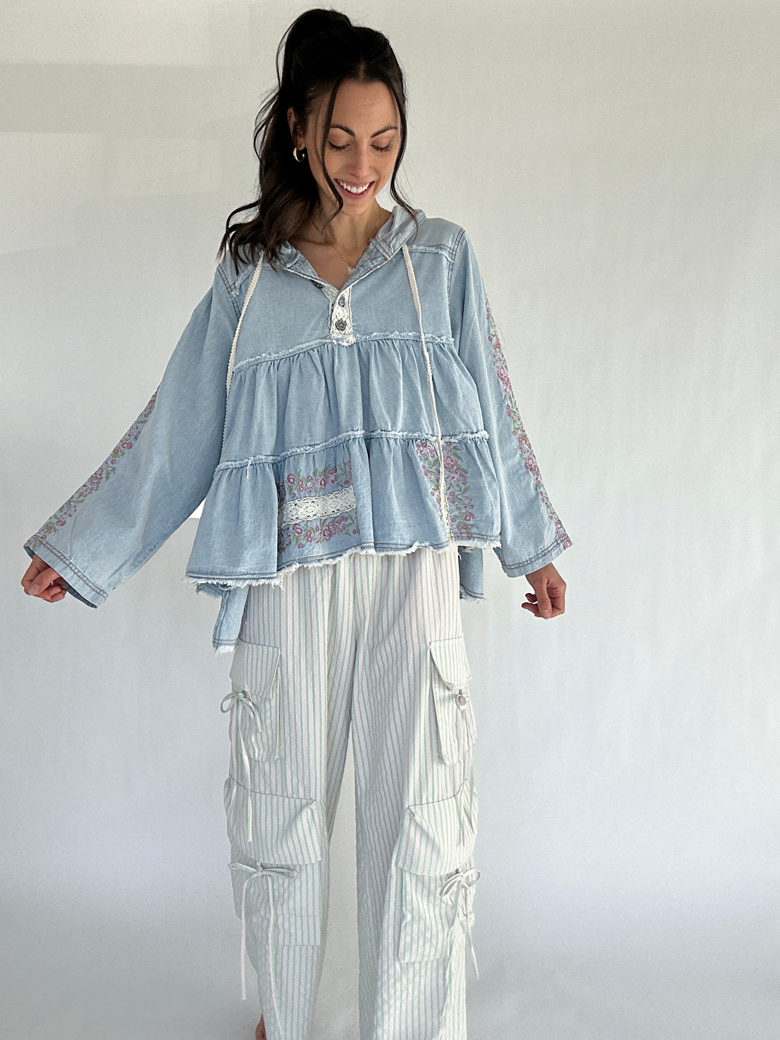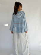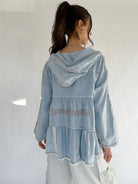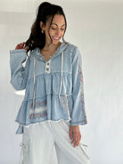 Made for casual coffee runs, laid-back weekends, and road trip adventures, the Jonas Denim Hooded Top is that easy denim piece you’ll reach for again and again. Designed in a light wash with vintage-inspired details, it features a henley style top with flower-shaped metal buttons, subtle embroidery, and raw edge finishes. The relaxed babydoll silhouette with shirring keeps it effortlessly comfy, while the hood adds a playful, practical touch.