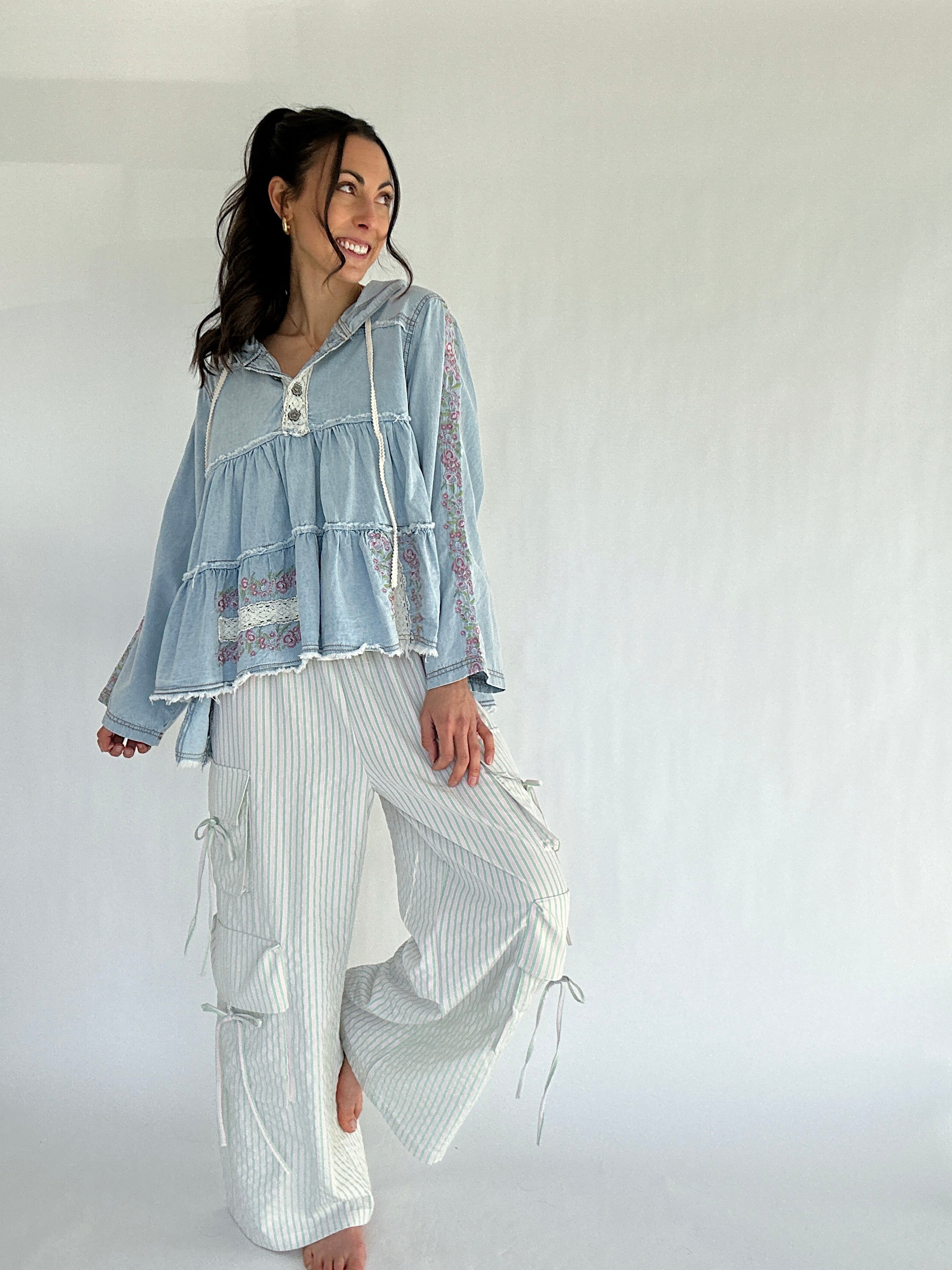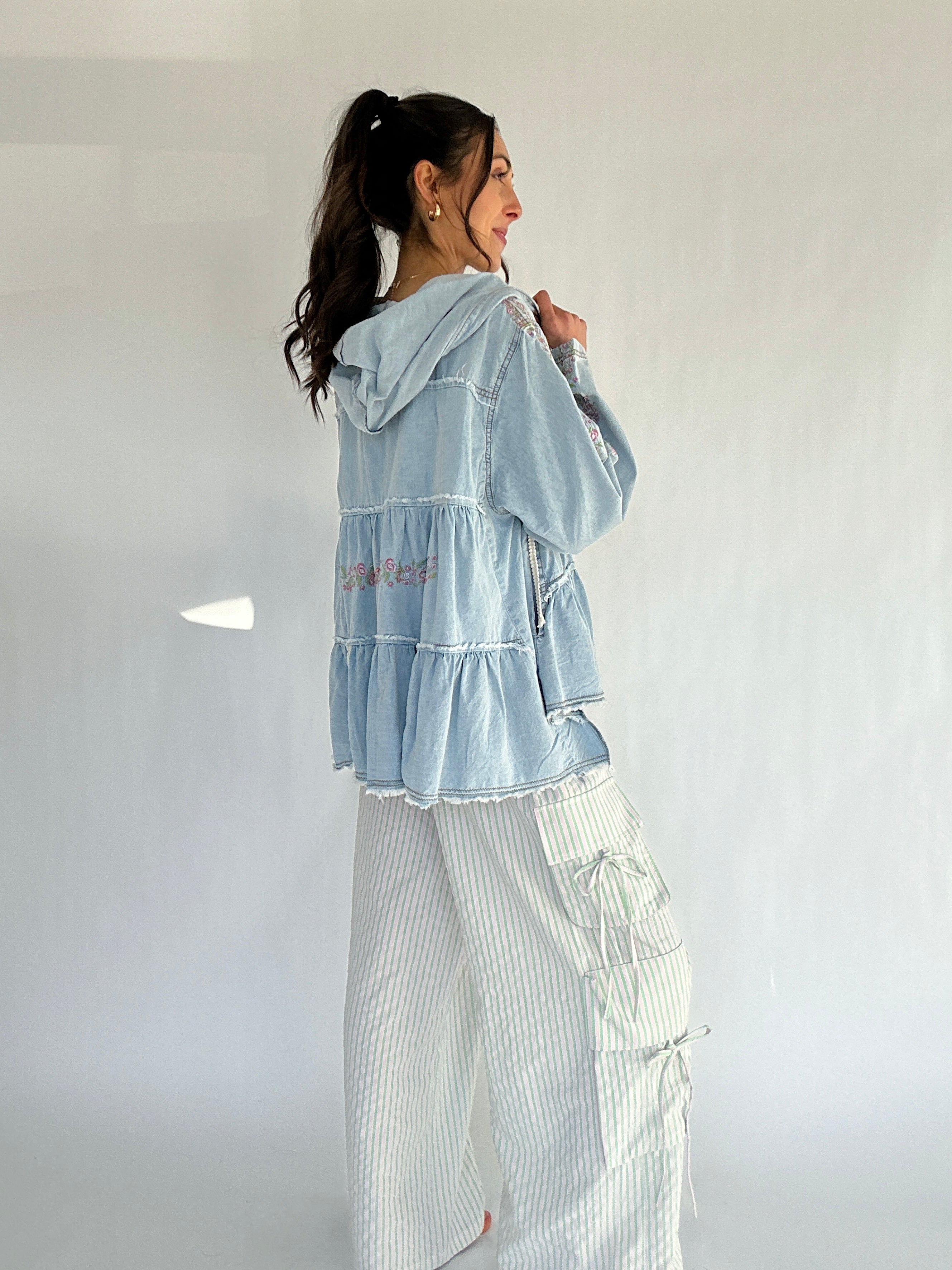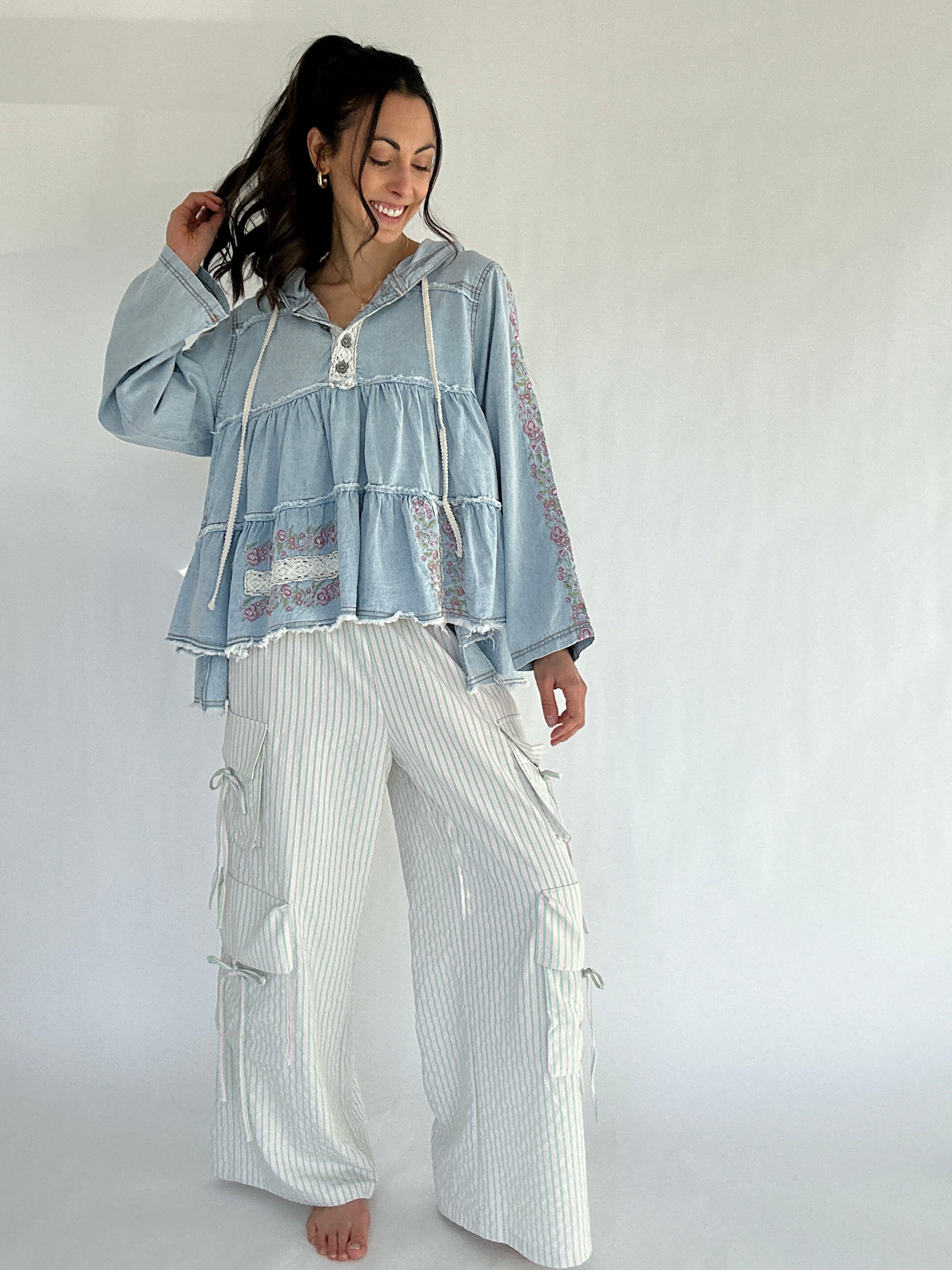 Made for casual coffee runs, laid-back weekends, and road trip adventures, the Jonas Denim Hooded Top is that easy denim piece you’ll reach for again and again. Designed in a light wash with vintage-inspired details, it features a henley style top with flower-shaped metal buttons, subtle embroidery, and raw edge finishes. The relaxed babydoll silhouette with shirring keeps it effortlessly comfy, while the hood adds a playful, practical touch.