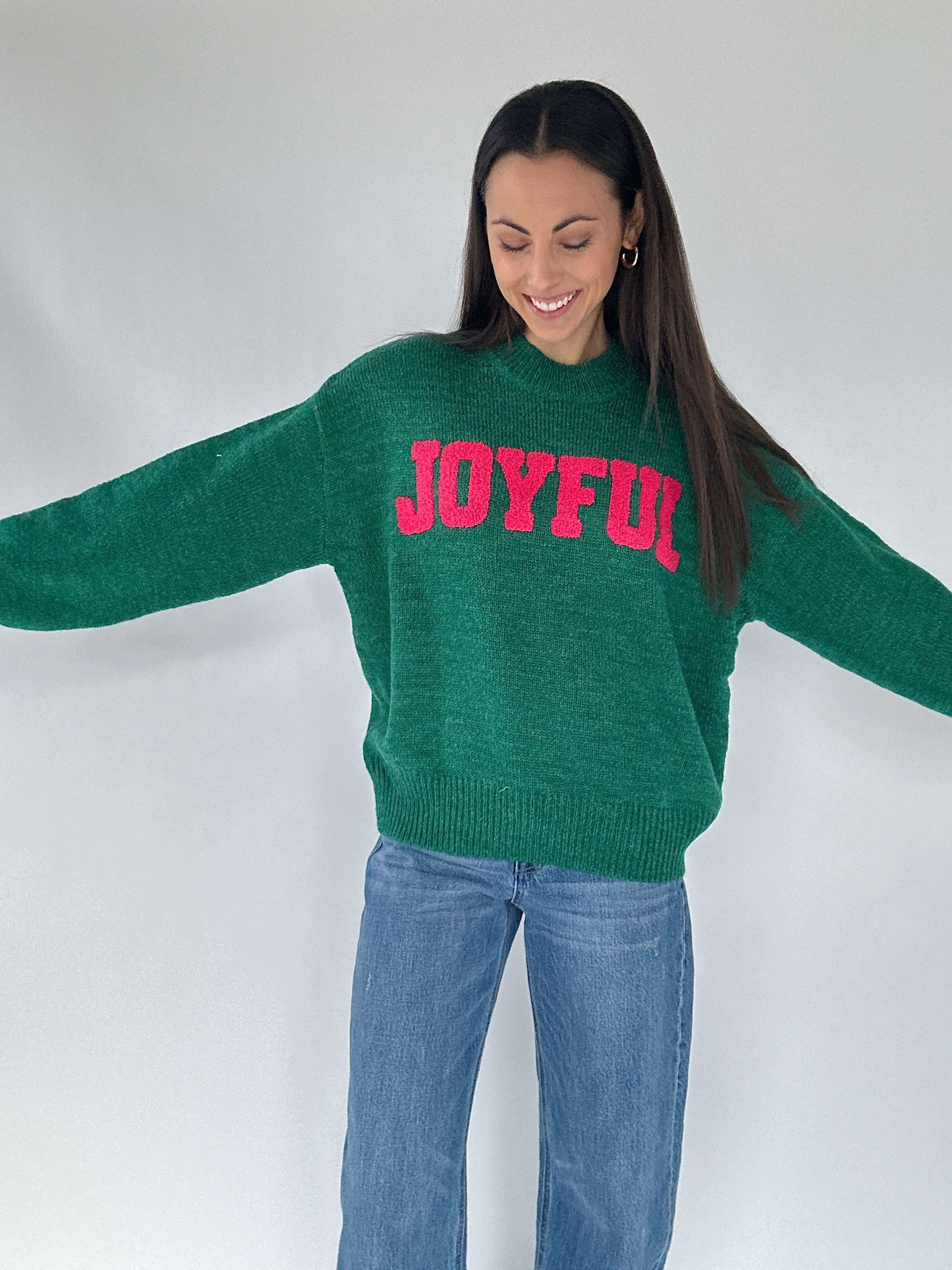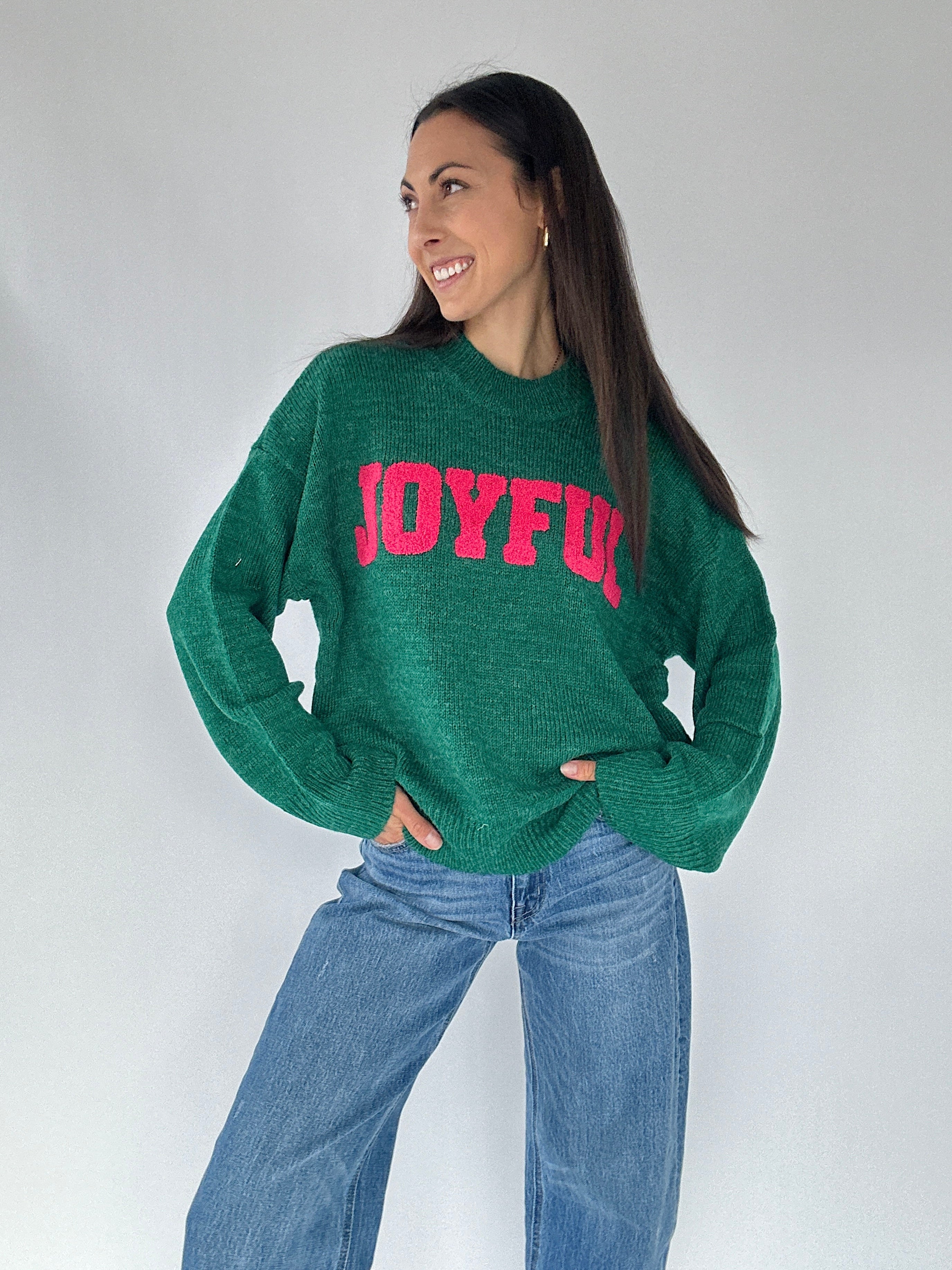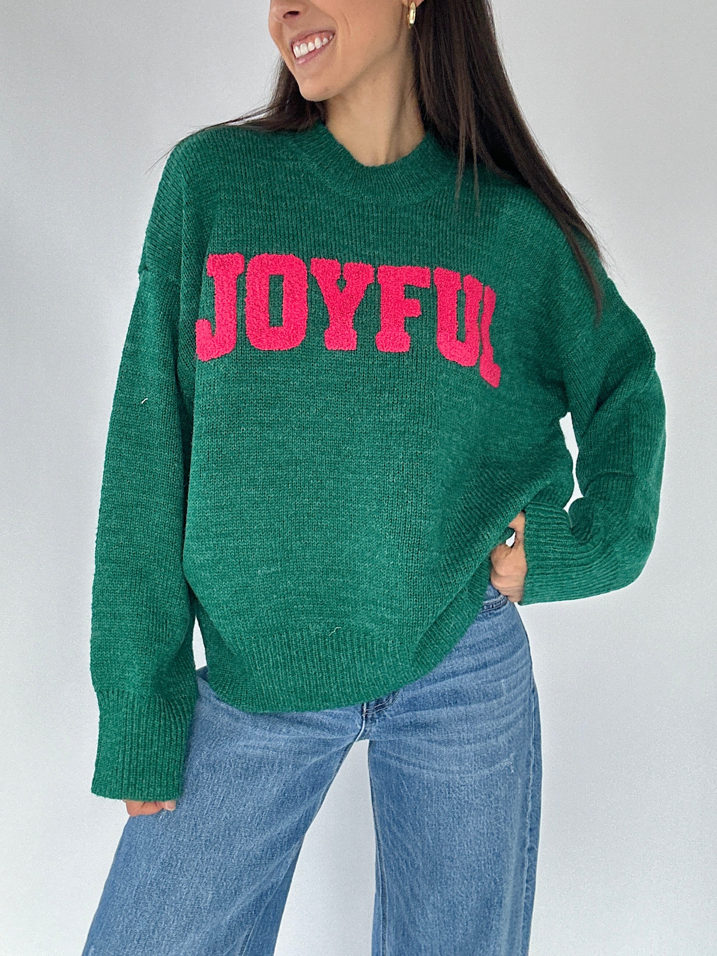 Bright, fun, and full of festive spirit, the Joyful Sweater brings a pop of color to your winter wardrobe. Made in a vibrant Kelly green and finished with playful pink letter patches across the front, this cozy knit is the perfect blend of cute and casual. The crew neckline, long sleeves, and relaxed fit make it easy to wear with jeans, leggings, or wide-leg sweats all season long.