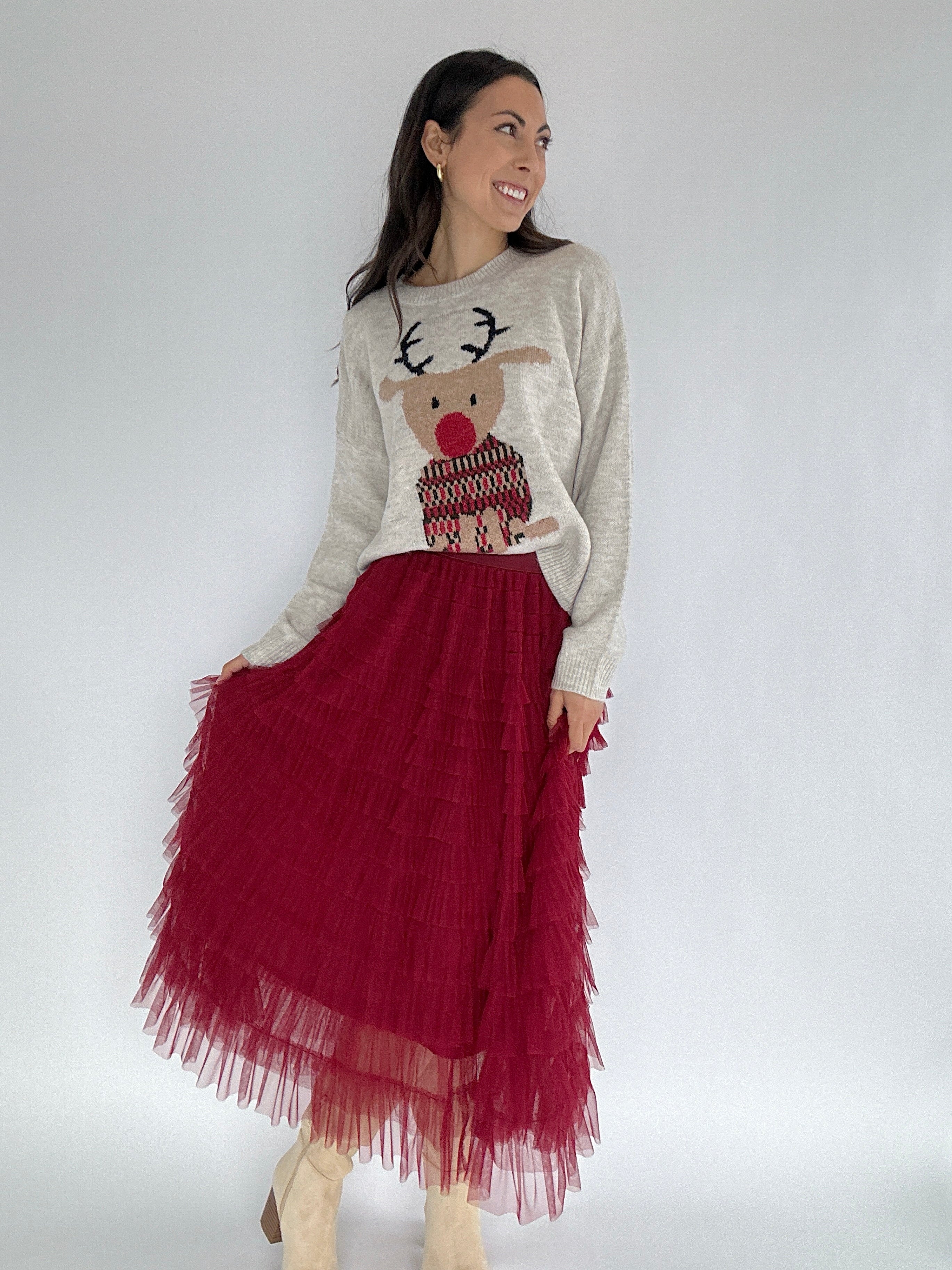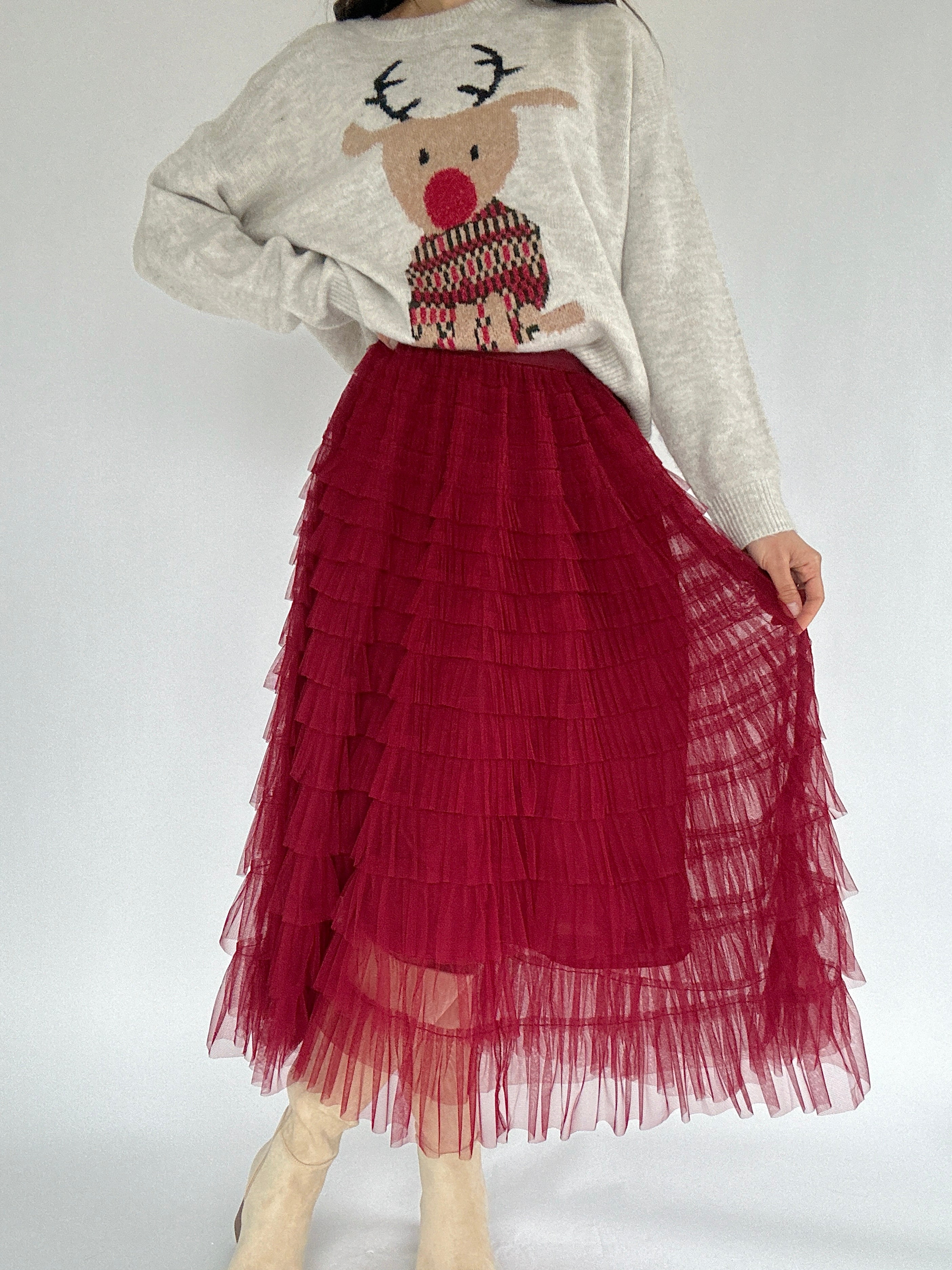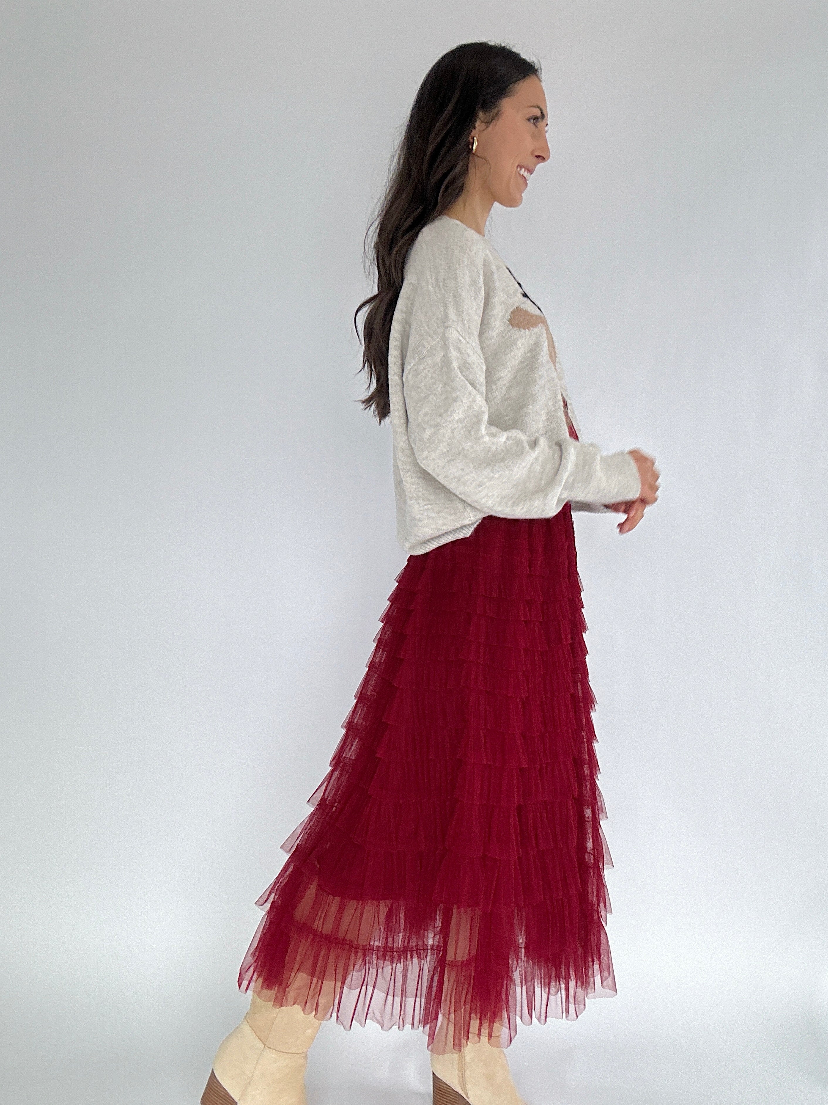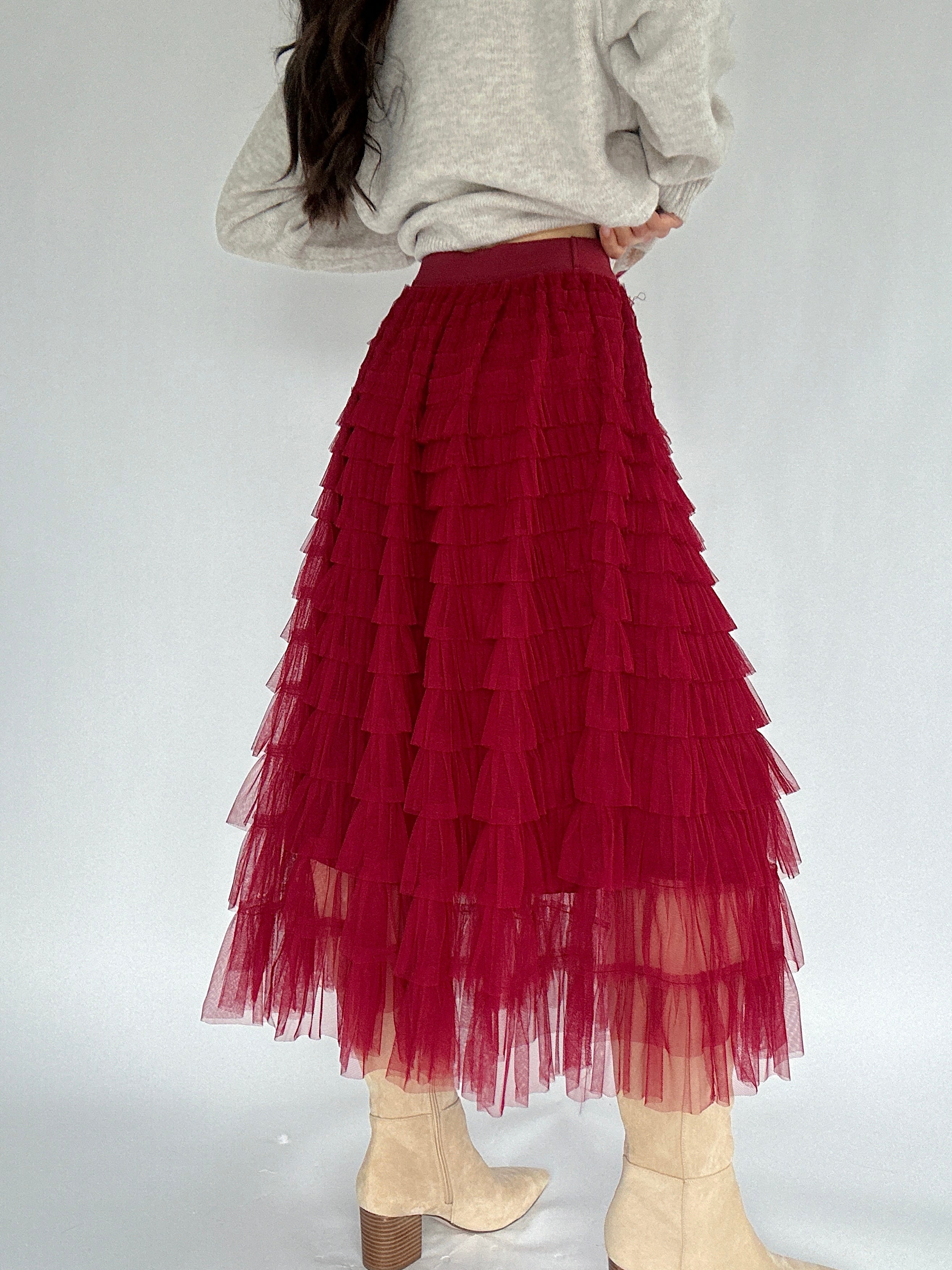 Perfect for holiday parties, festive brunches, or twirling around for no reason at all, this burgundy tiered tulle skirt brings instant cheer to any outfit. The ruffled layers create a full, playful silhouette, while the elastic waistband keeps it comfortable and easy to wear. Lined for extra coverage, this midi-length skirt is ready to pair with sweaters, blouses, or even cozy knits for a fun, festive look.