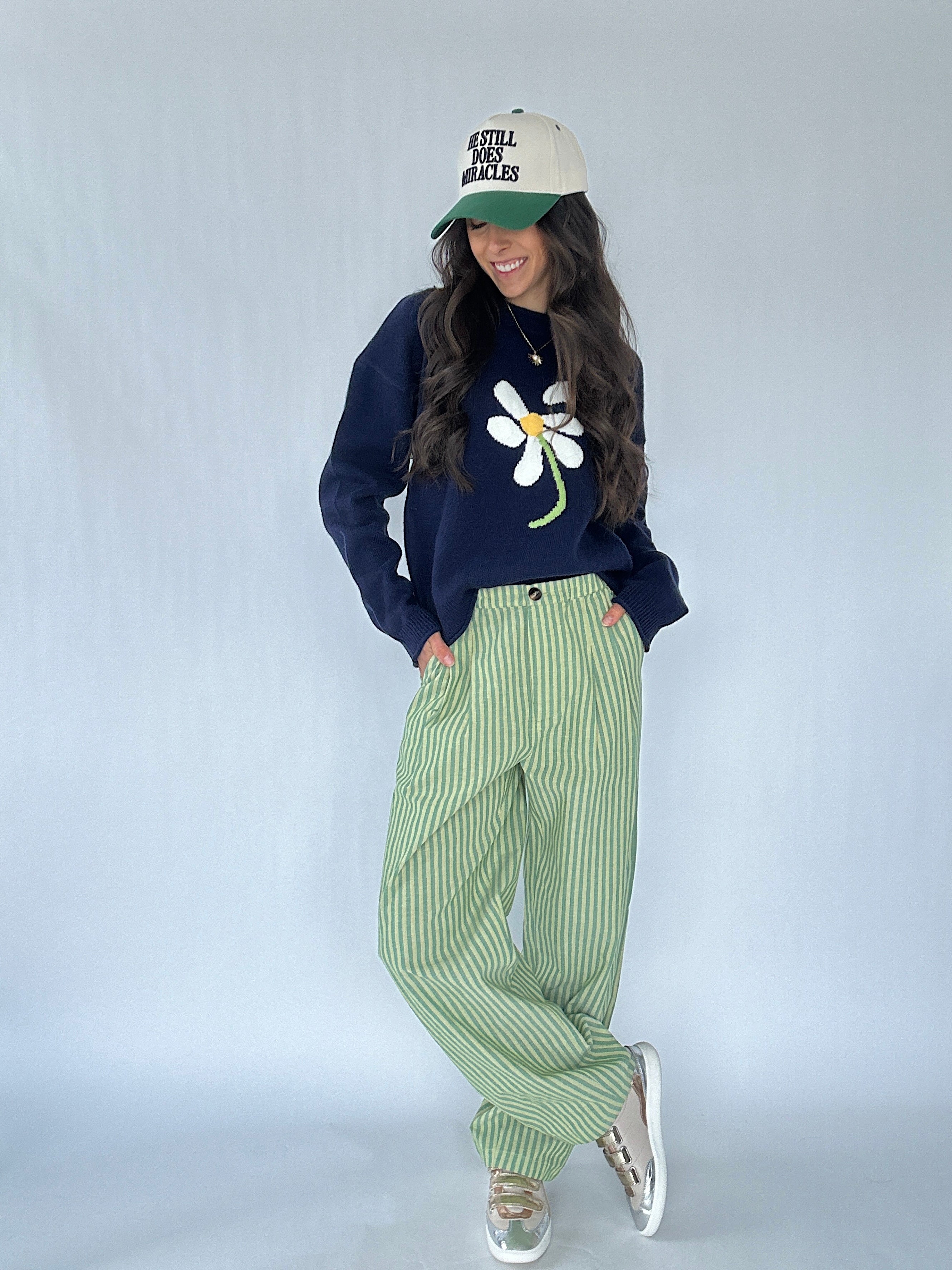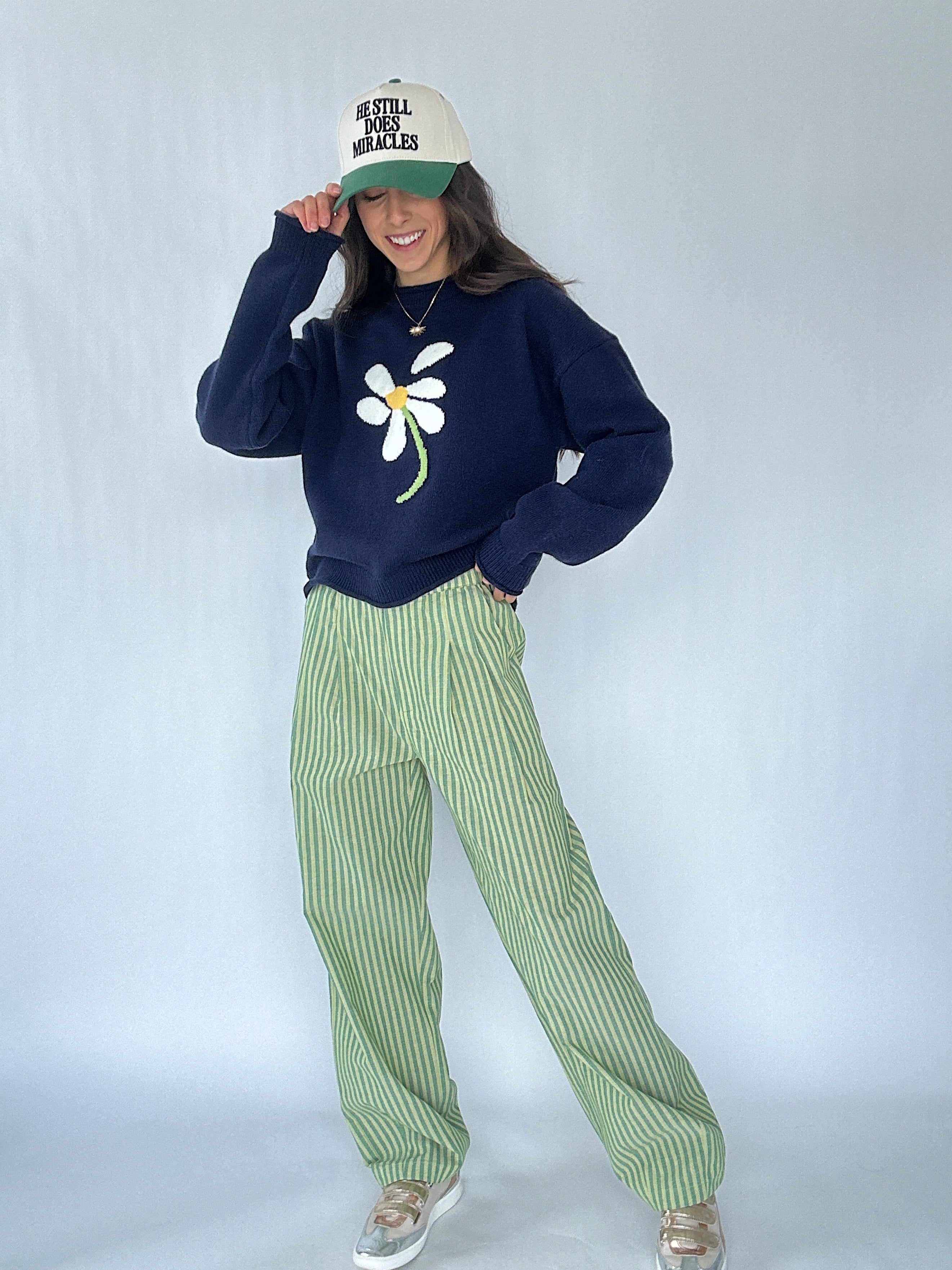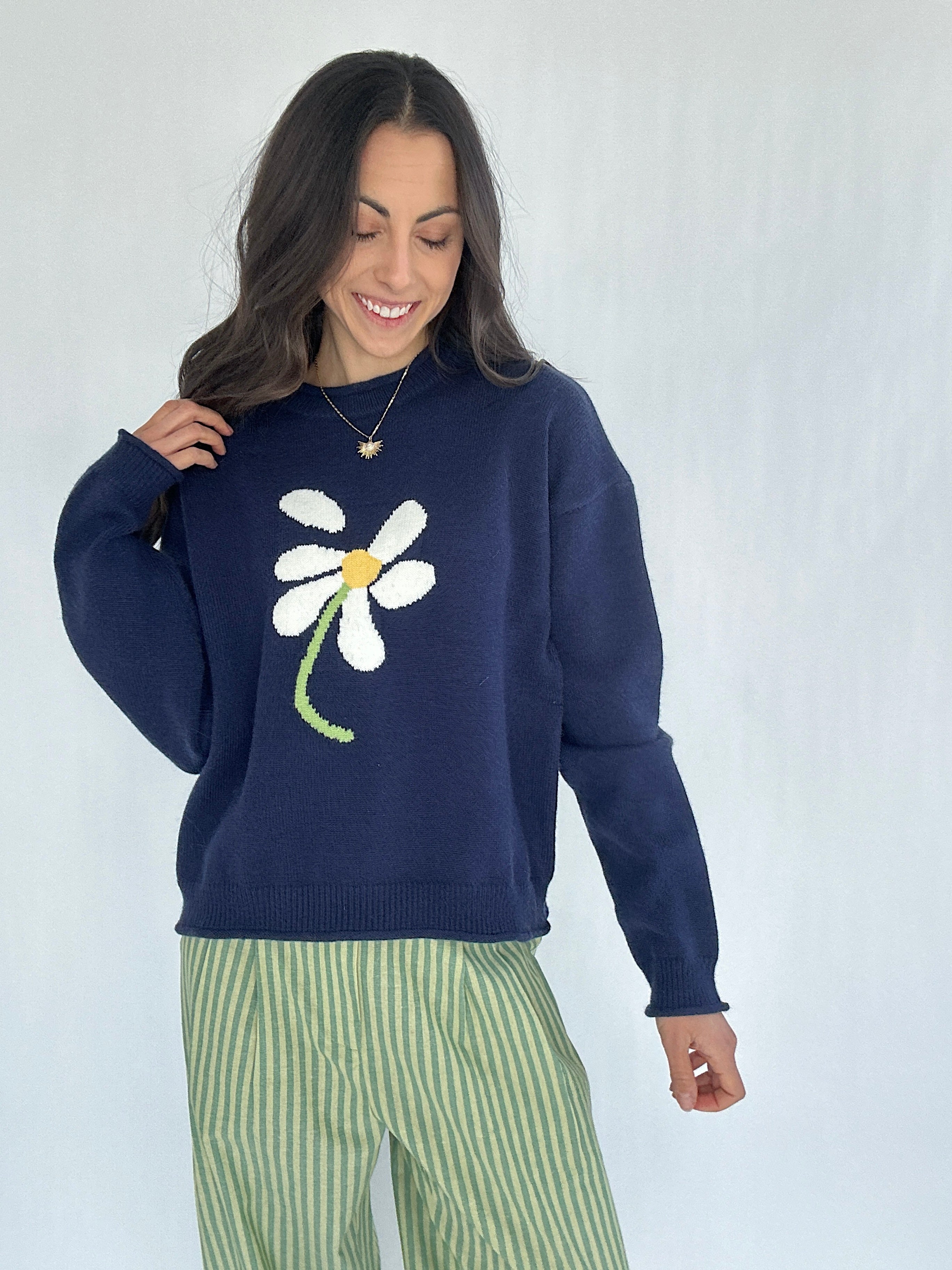 Perfect for weekend coffee runs, brunch dates, or strolling around town, the Loves Me Not Sweater adds a playful touch to your casual lineup. This navy blue medium-weight knit features a daisy graphic with a single petal falling off, giving it a little “he loves me, he loves me not” attitude. The relaxed fit makes it easy to wear with jeans, skirts, or even with your favorite wide leg sweatpants..