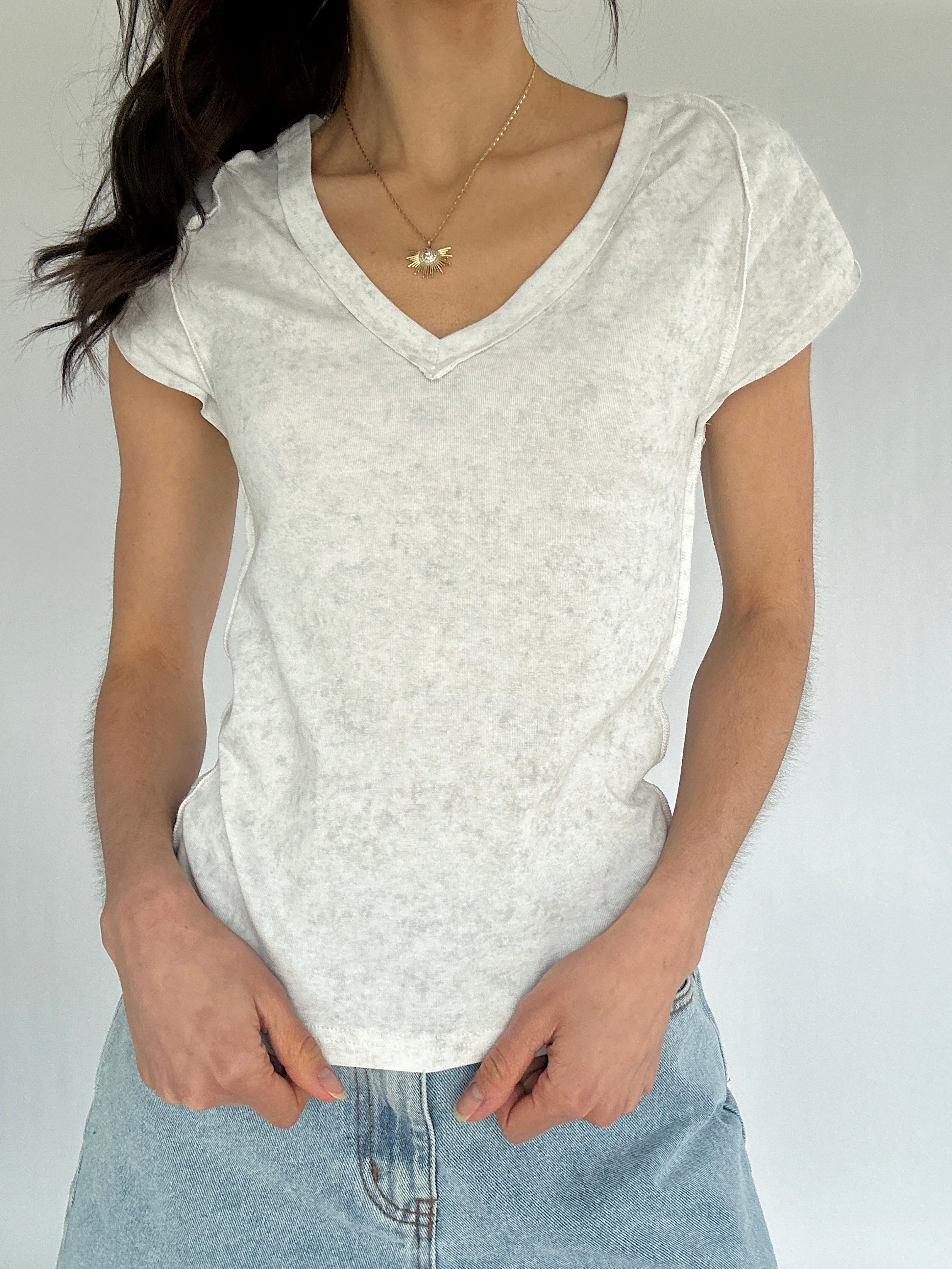 From everyday layering to casual weekends and easy off-duty days, the Malone Tee is a wardrobe staple with a soft, lived-in feel. Made from cotton jersey with a slight stretch, this slim-fit V-neck tee features raglan short sleeves and exposed outseams for subtle detail. Vintage washing gives it a soft, worn-in vibe, making it perfect for pairing with overalls, denim, or jogger pants.