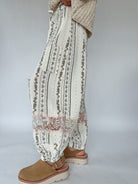 The Meadowlight Patchwork Pants are crafted from soft, breathable double gauze cotton with a striped floral patchwork design that feels relaxed and easy. The jogger-style silhouette features a gentle balloon shape, elastic drawstring waistband, and elasticized ankle cuffs for that comfortable but flattering fit. A sheer lace panel near the hem adds a subtle feminine detail that makes them feel just a little extra special.