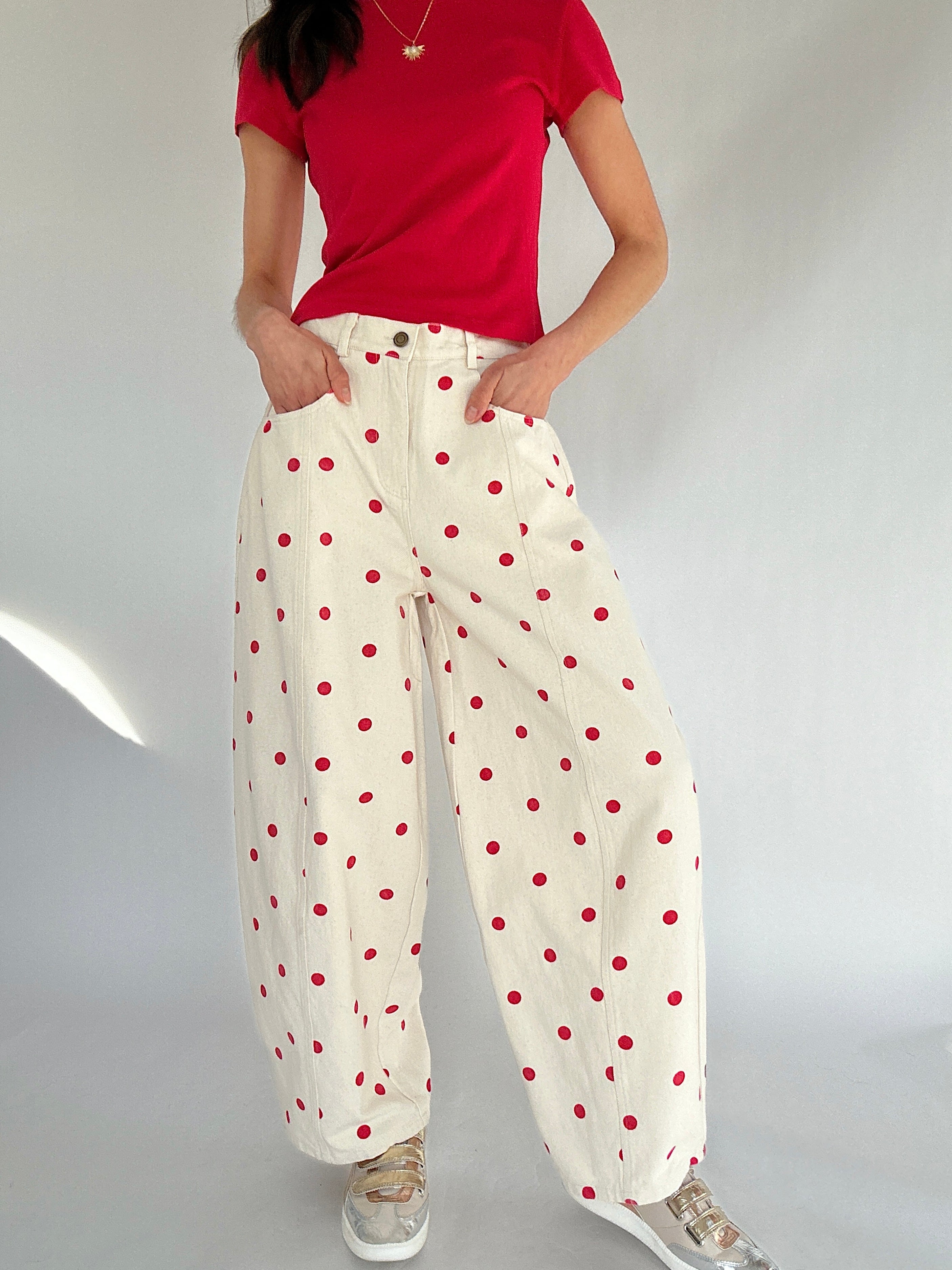 Polka Dot Barrel Pants - Red – Sweet, fun, and SO cute, these cream pants with red polka dots bring a playful twist to your everyday looks. The flattering barrel-leg silhouette gives them a modern edge, while the soft yet structured cotton fabric keeps them looking effortlessly put-together. Perfect for coffee dates, weekend brunches, or casual workdays that could use a little extra personality!
