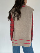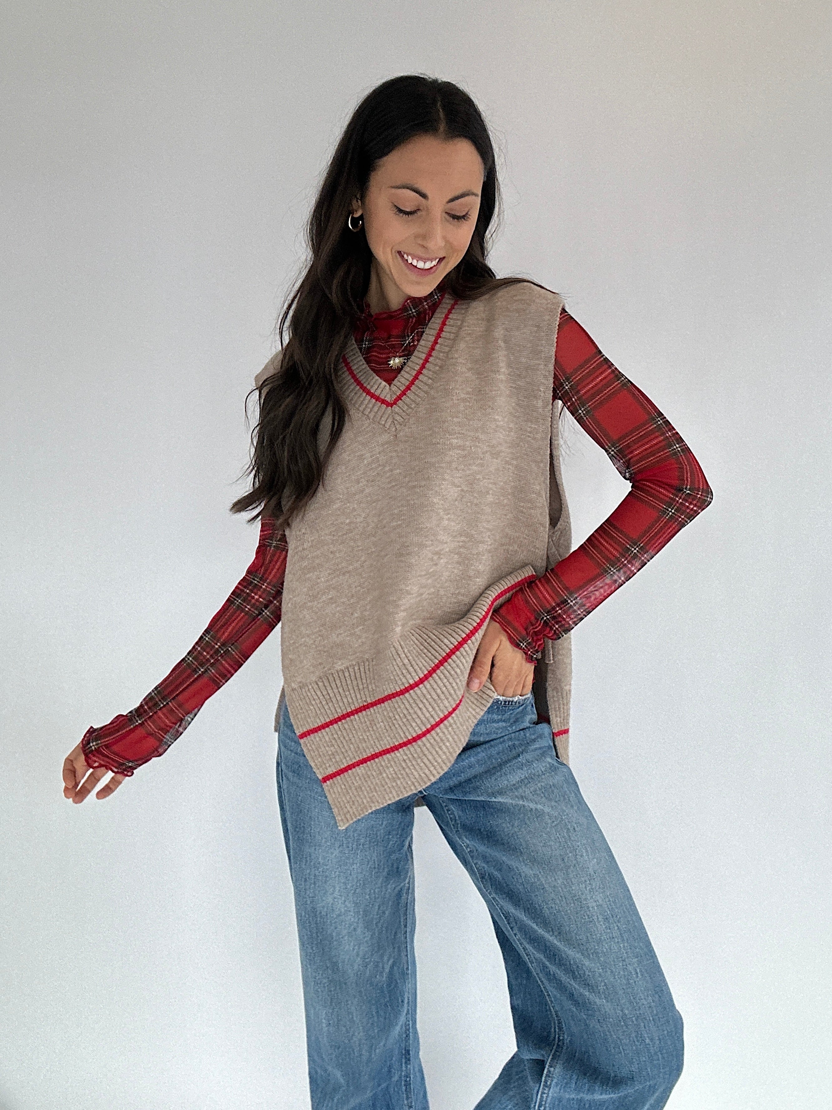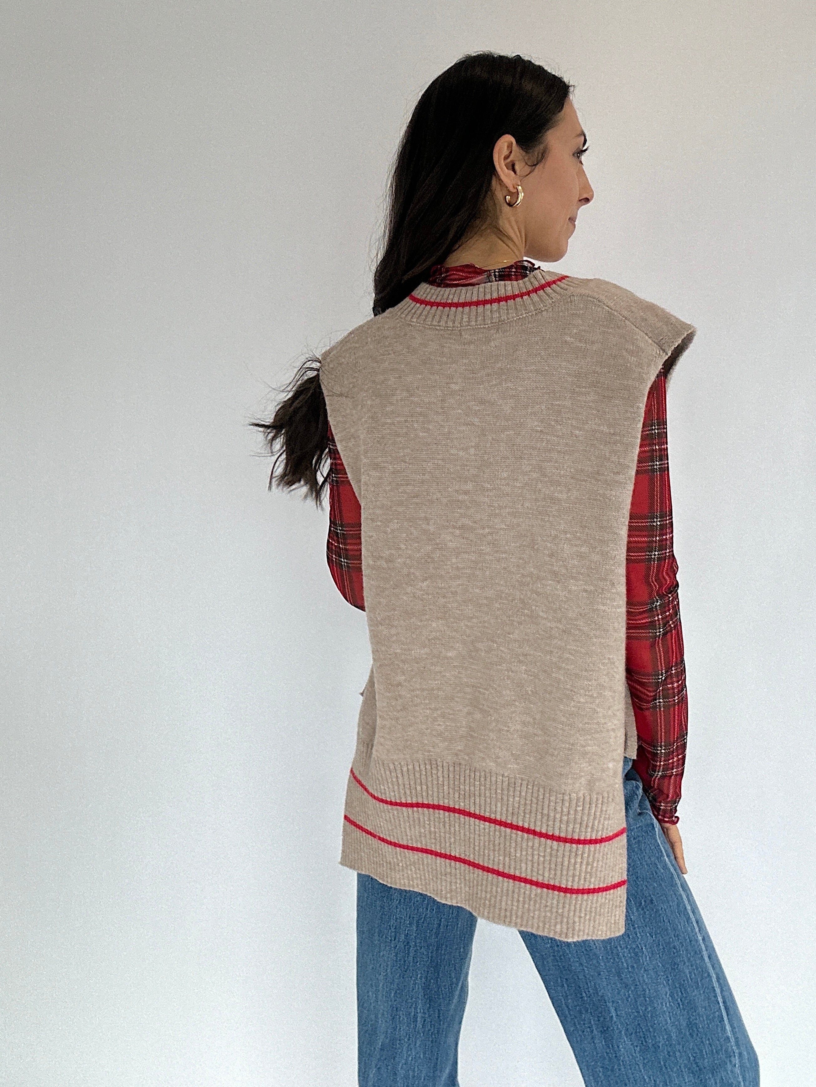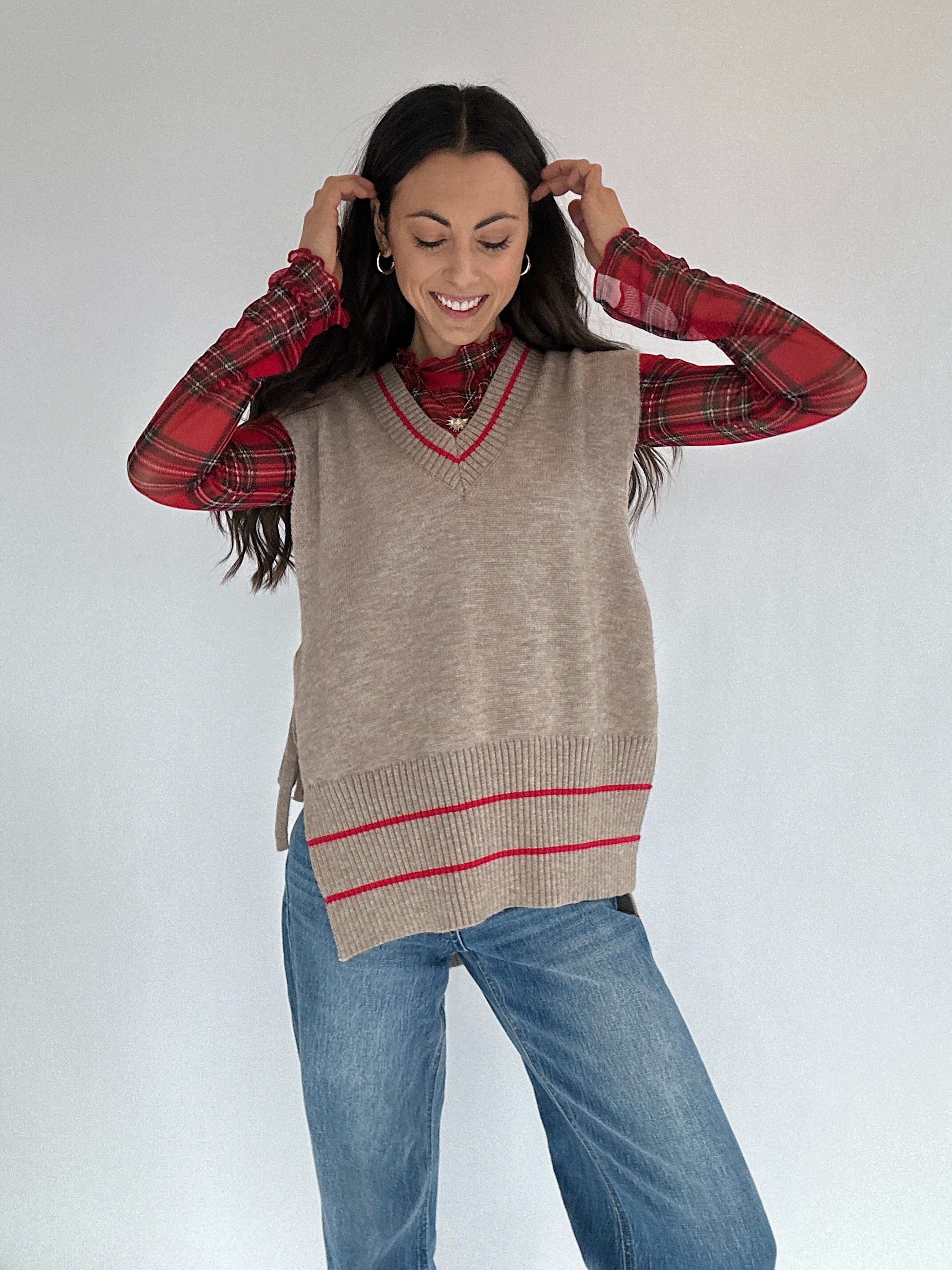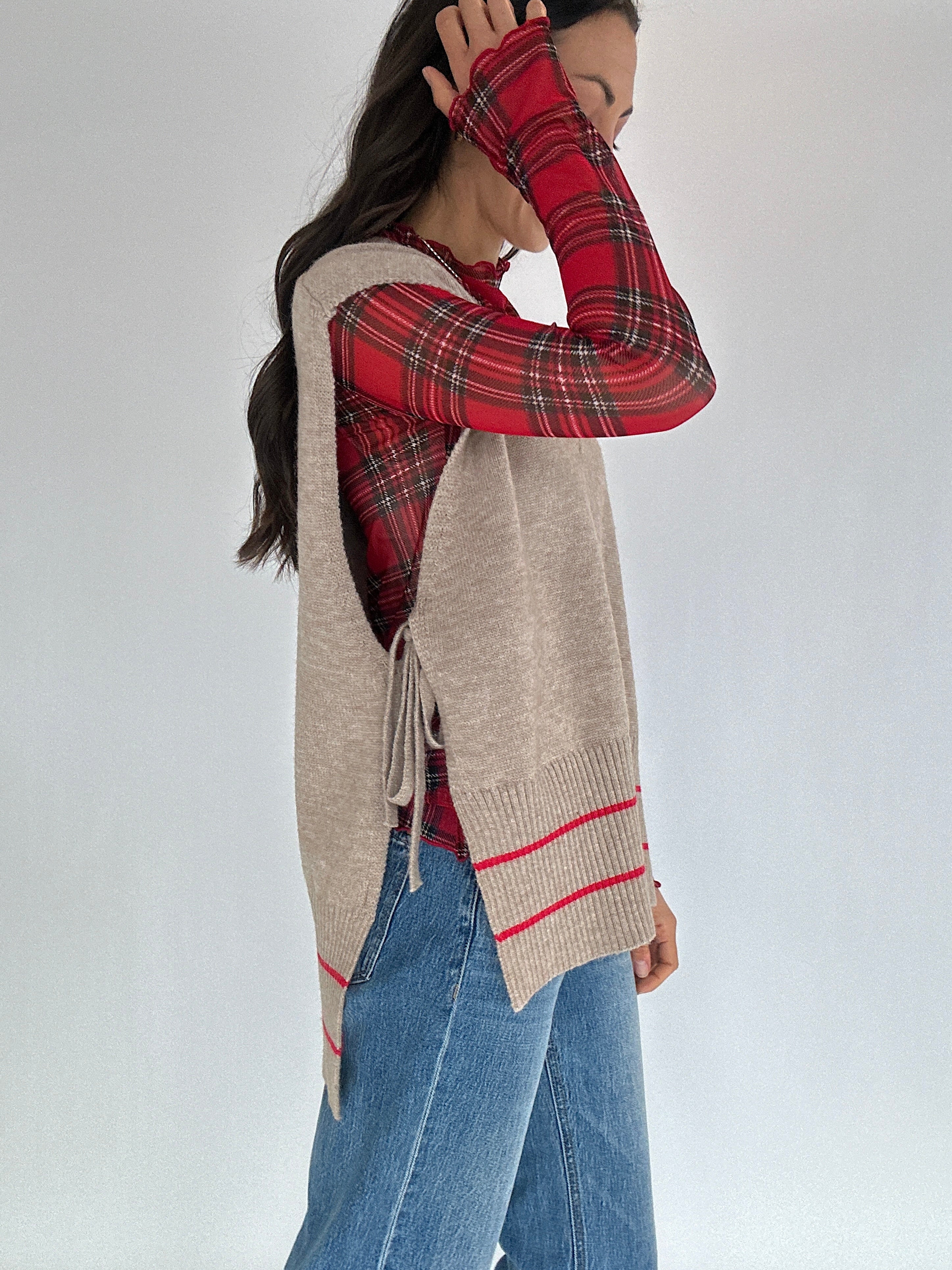 This taupe sweater vest top has a v-neckline with contrasting red stripes and ribbed hems but it's the open sides with tie accents that really make this extra cute! Layer over a tank or ling sleeve and pair with jeans or wide leg pants for a trendy outfit!
