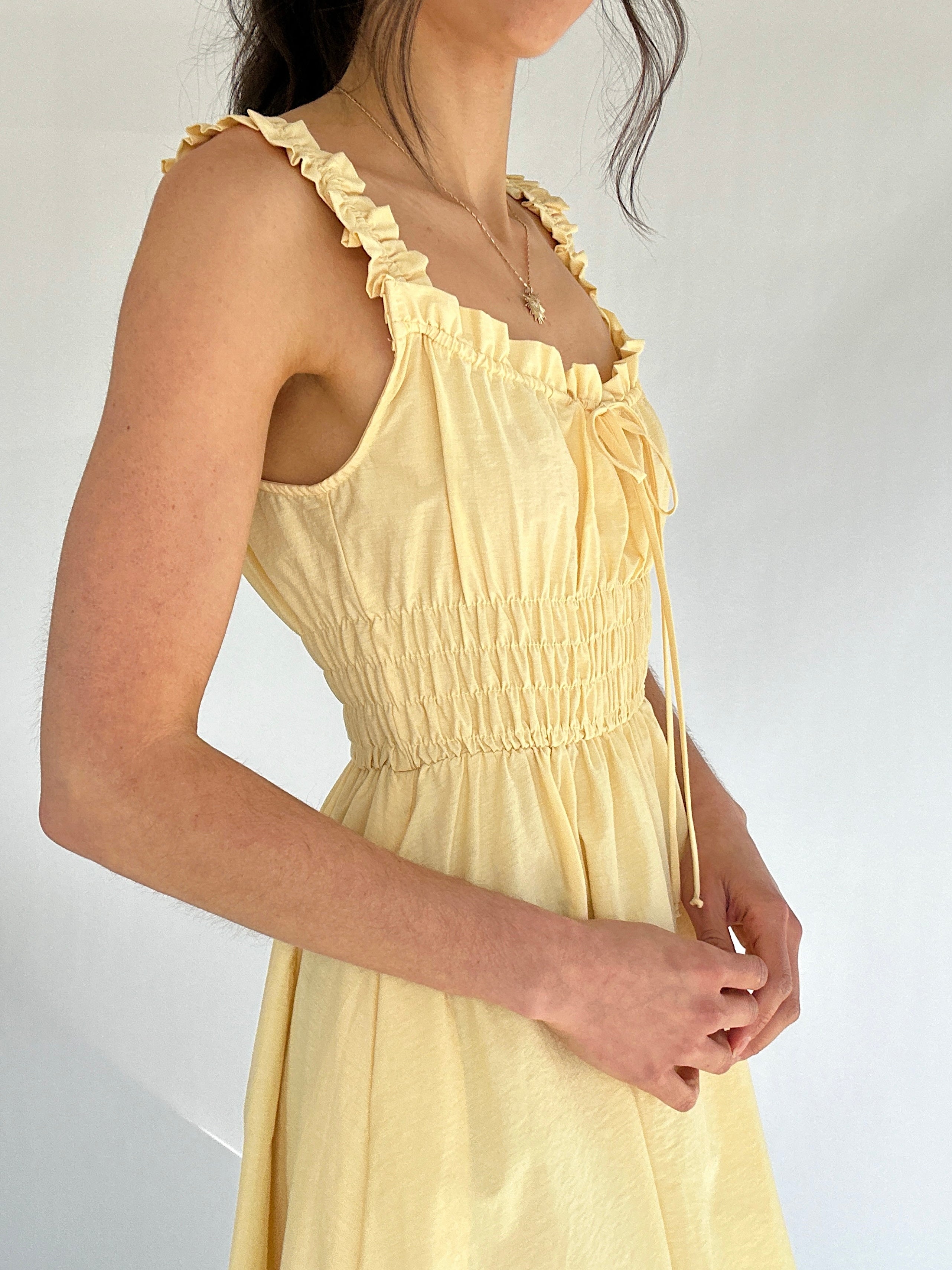 Picture this: a slow Saturday morning that turns into farmers market wandering, iced coffee in hand, maybe spontaneous brunch plans. This is the Sunny Side Midi Dress that makes all of it feel a little more intentional, a little more you. The butter yellow is doing the heavy lifting—it's giving main character energy without any effort on your part.