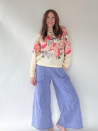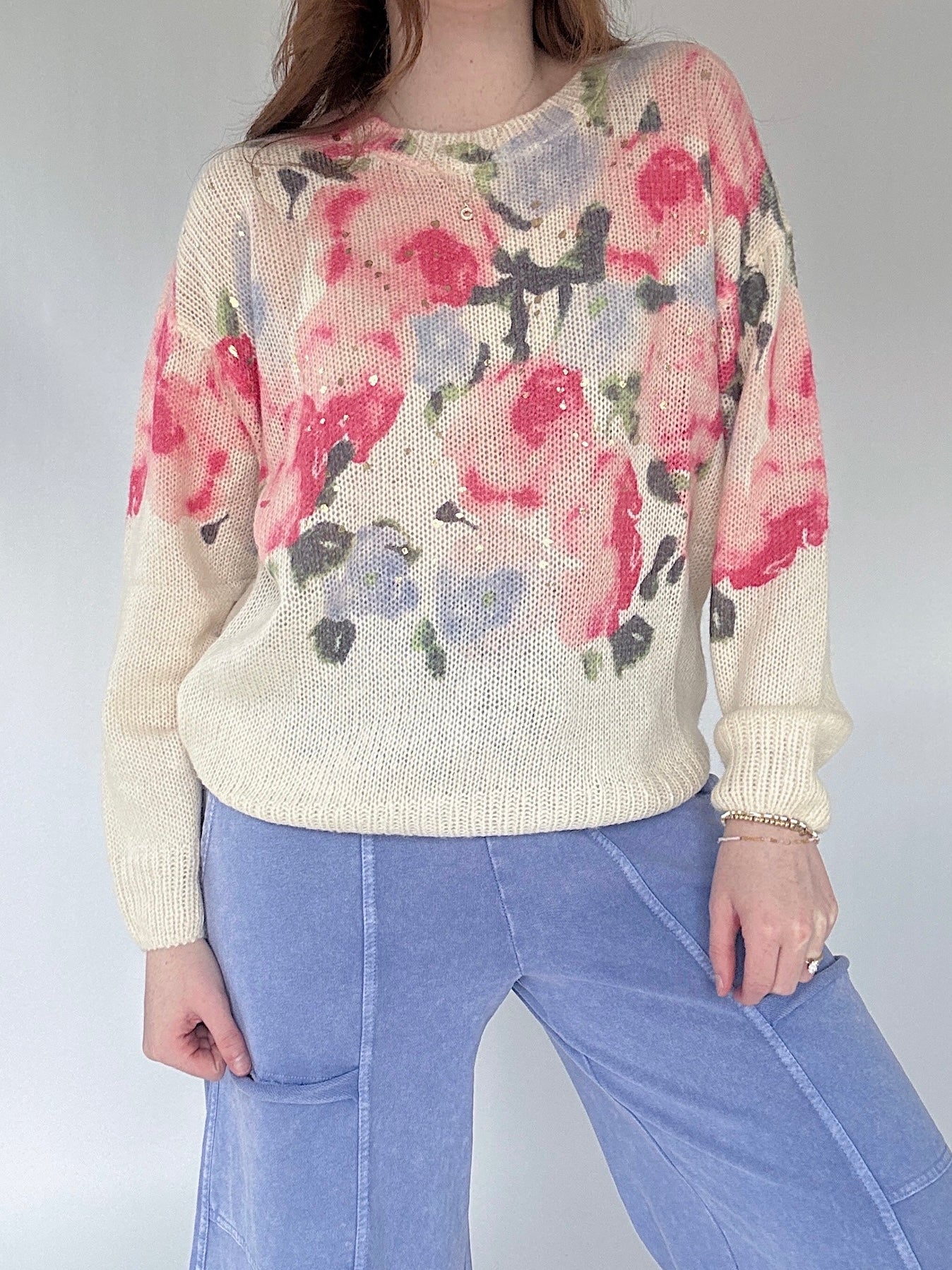 A dreamy, romantic knit with soft watercolor florals and a touch of gold speckles—perfect for bringing a little whimsy to your everyday wardrobe. The lightweight fuzzy knit feels cloud-soft, while the relaxed, slightly slouchy silhouette hits at the hip for effortless style.