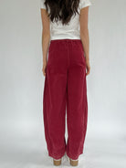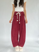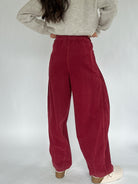 Warm, rich, and ready to cozy up your wardrobe—the Whinnie Corduroy Barrel Pants in Burgundy are a modern twist on a classic staple. The high-rise fit and pleated barrel-leg silhouette create a flattering, relaxed look, while the elastic waistband with contrast drawstring adds comfort and easy style. Finished with pockets featuring subtle pleating detail, these pants are equal parts cozy and on-trend.