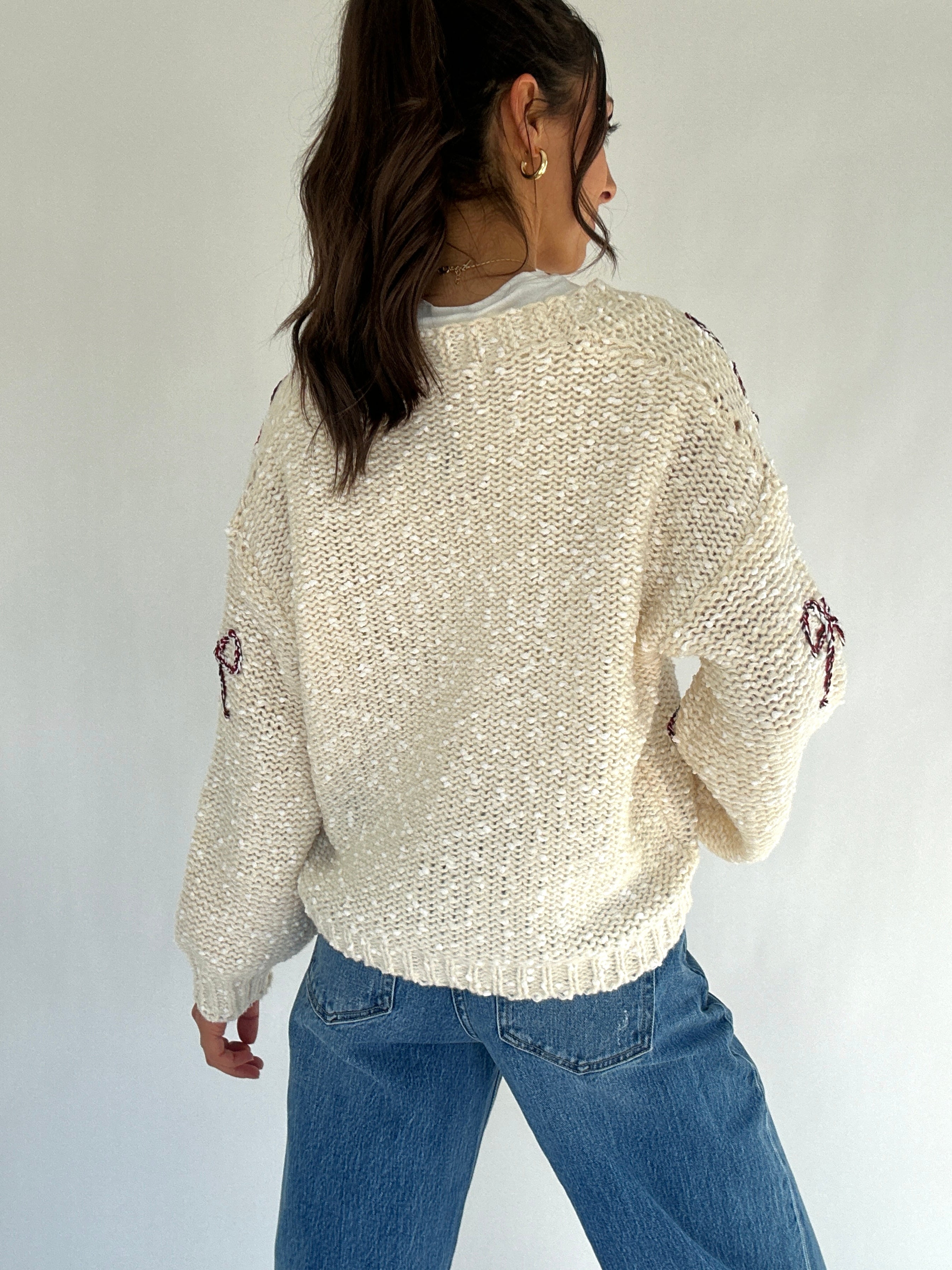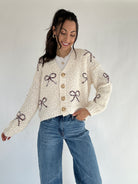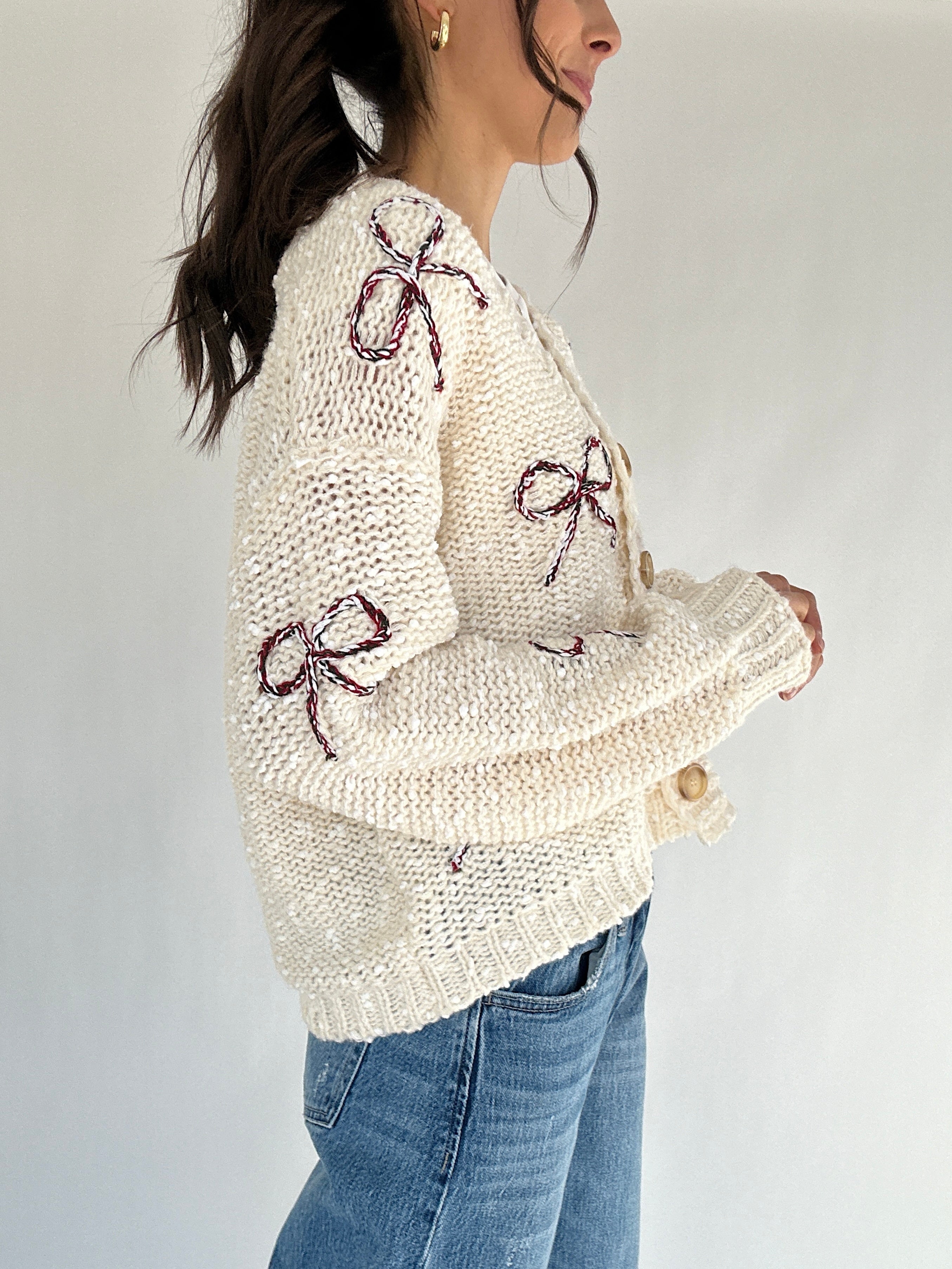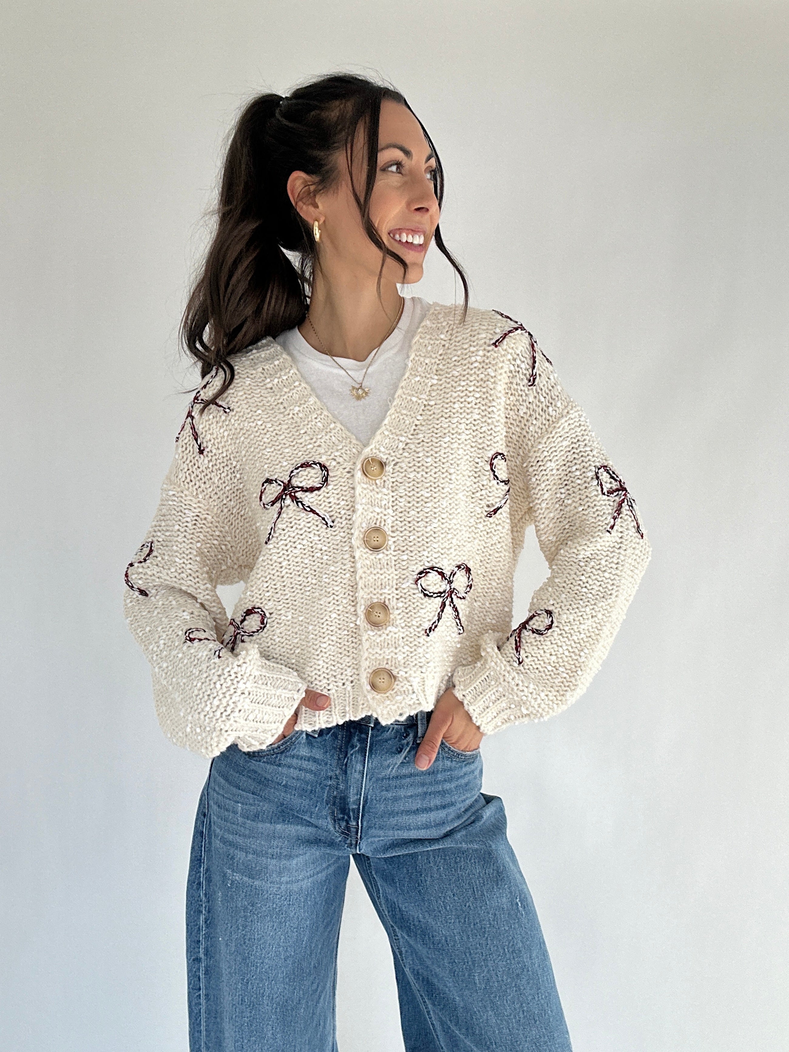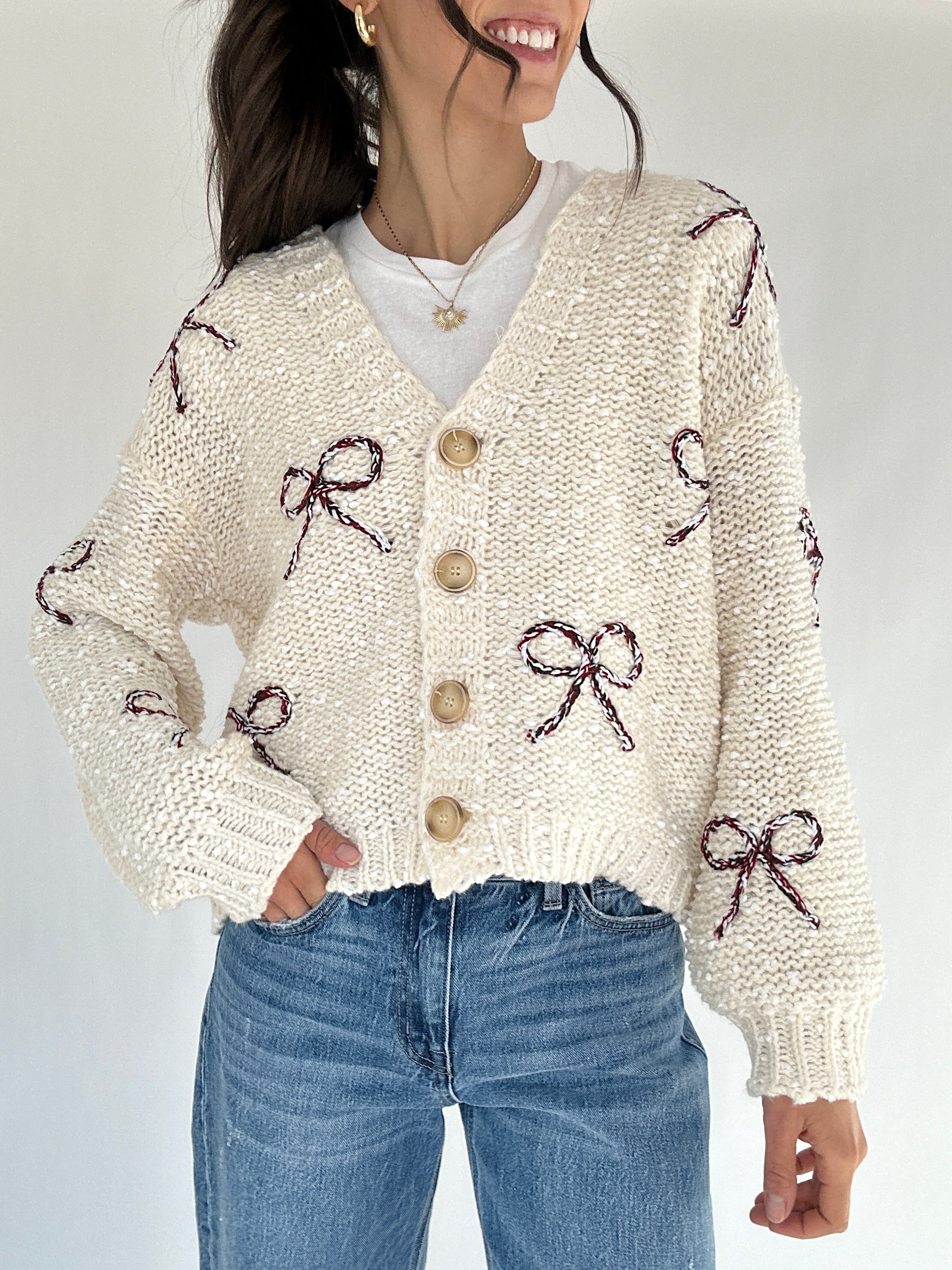 Everyday cute with a hint of holiday charm—the Bow Babe Popcorn Cardigan is one you’ll be reaching for on repeat. The soft ivory popcorn knit and slouchy, relaxed fit make it feel perfectly cozy, while the embroidered red-and-white thread bows sprinkled across the front and sleeves add a sweet, subtle festive touch. With a v-neckline and button-front design, it’s easy to layer over everything from dresses to your favorite tee.