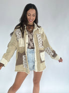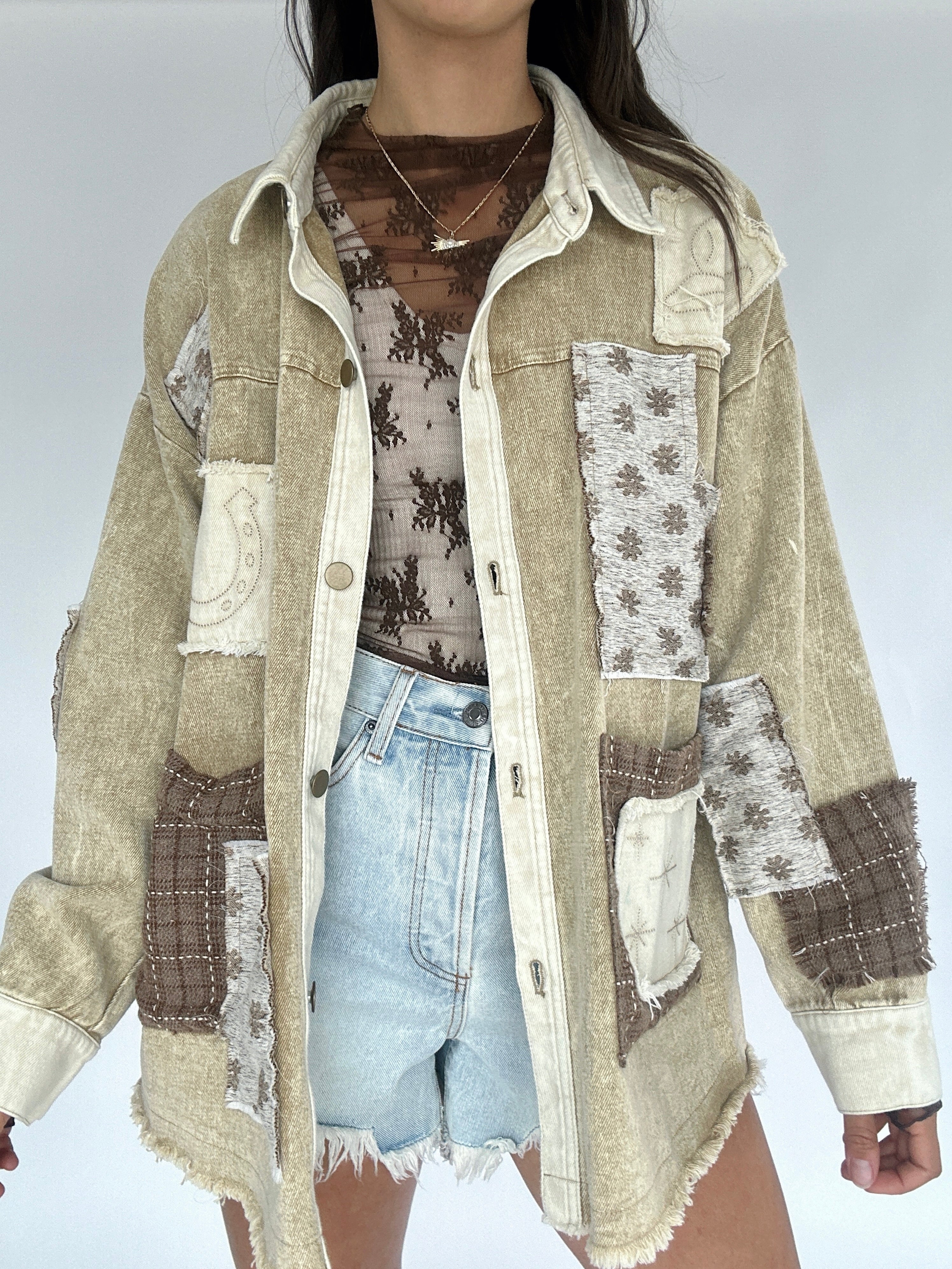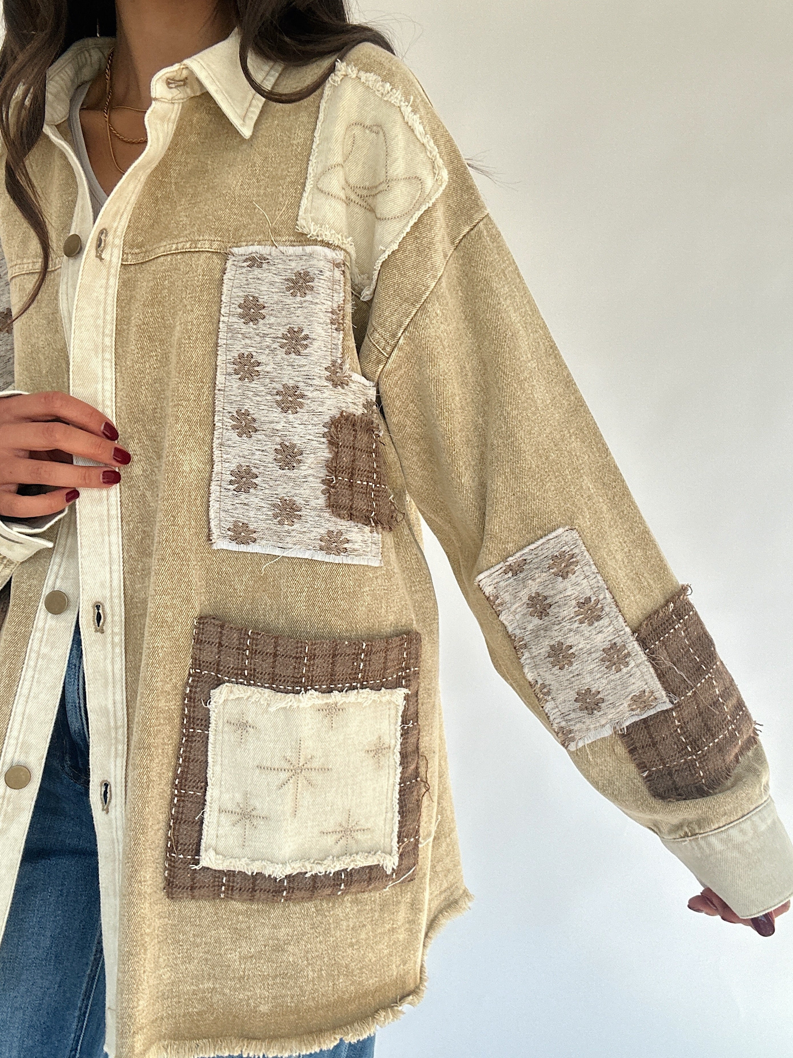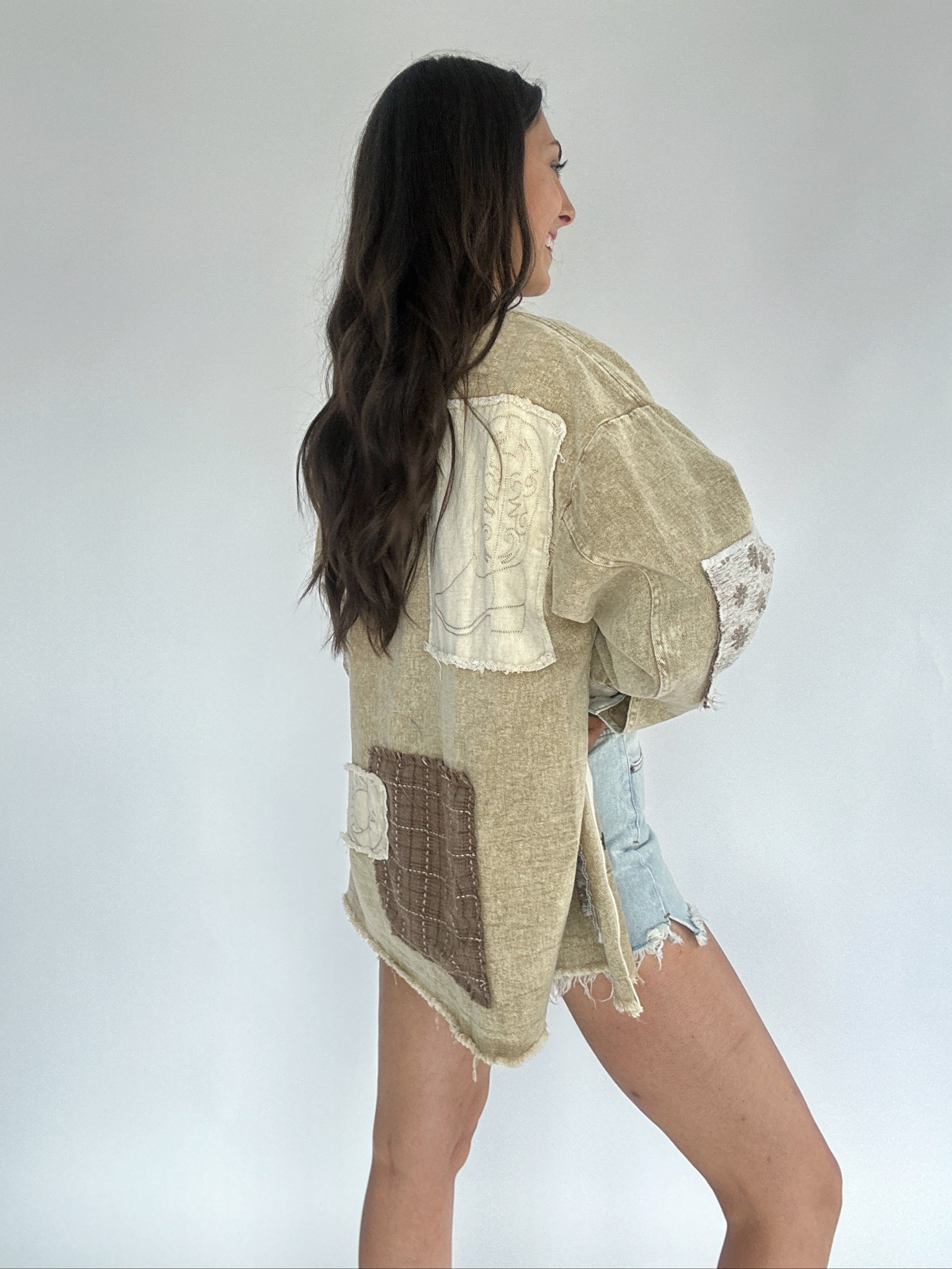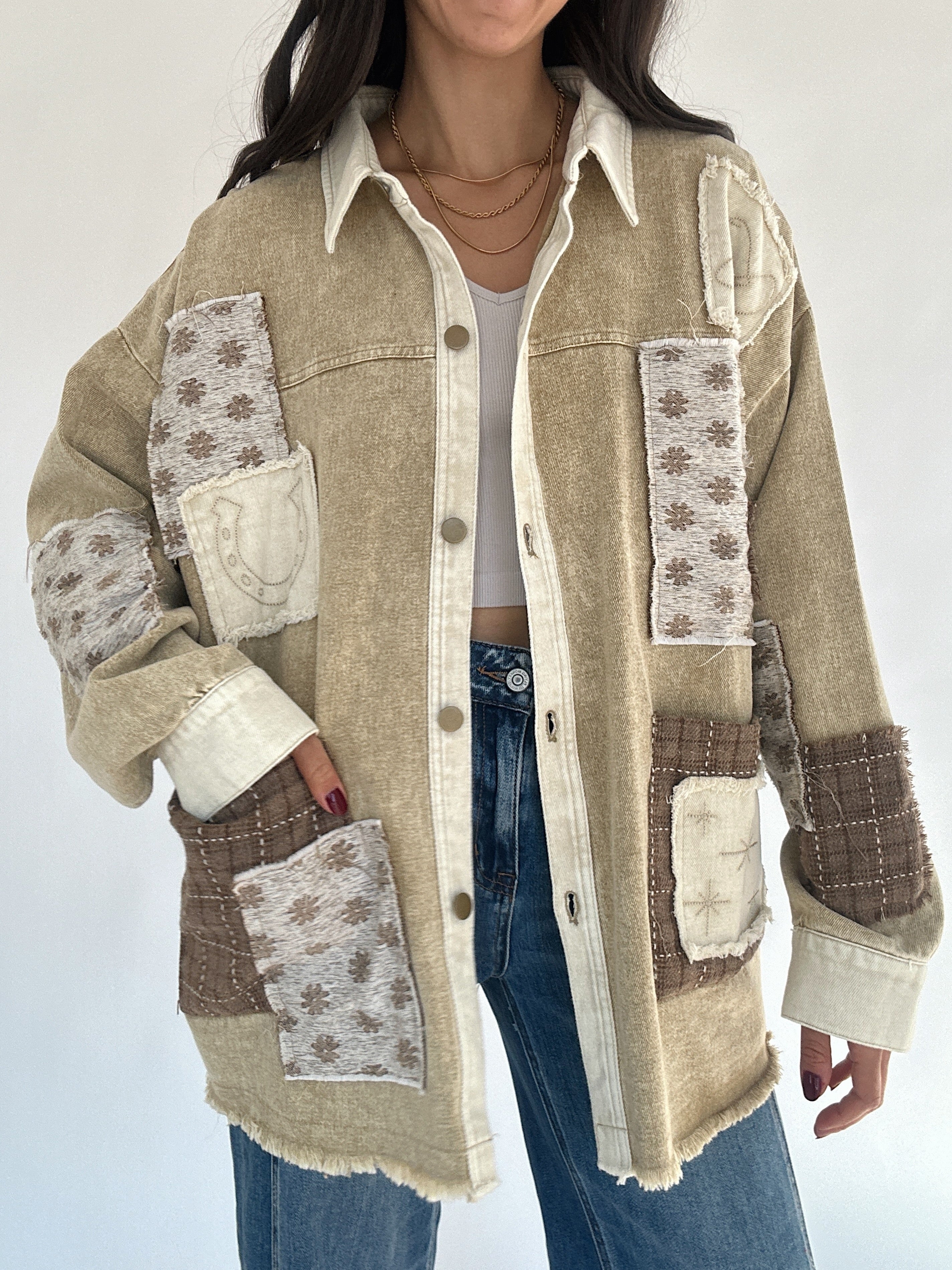 For the cowgirl at heart, this taupe shirt jacket has contrasting patchwork with embroidered western graphics: a cowboy boot and sun/moon patch on the back and horseshoe and cowboy hat on the front. It features a button front with patch pockets and an oversized fit. A fall season must have!