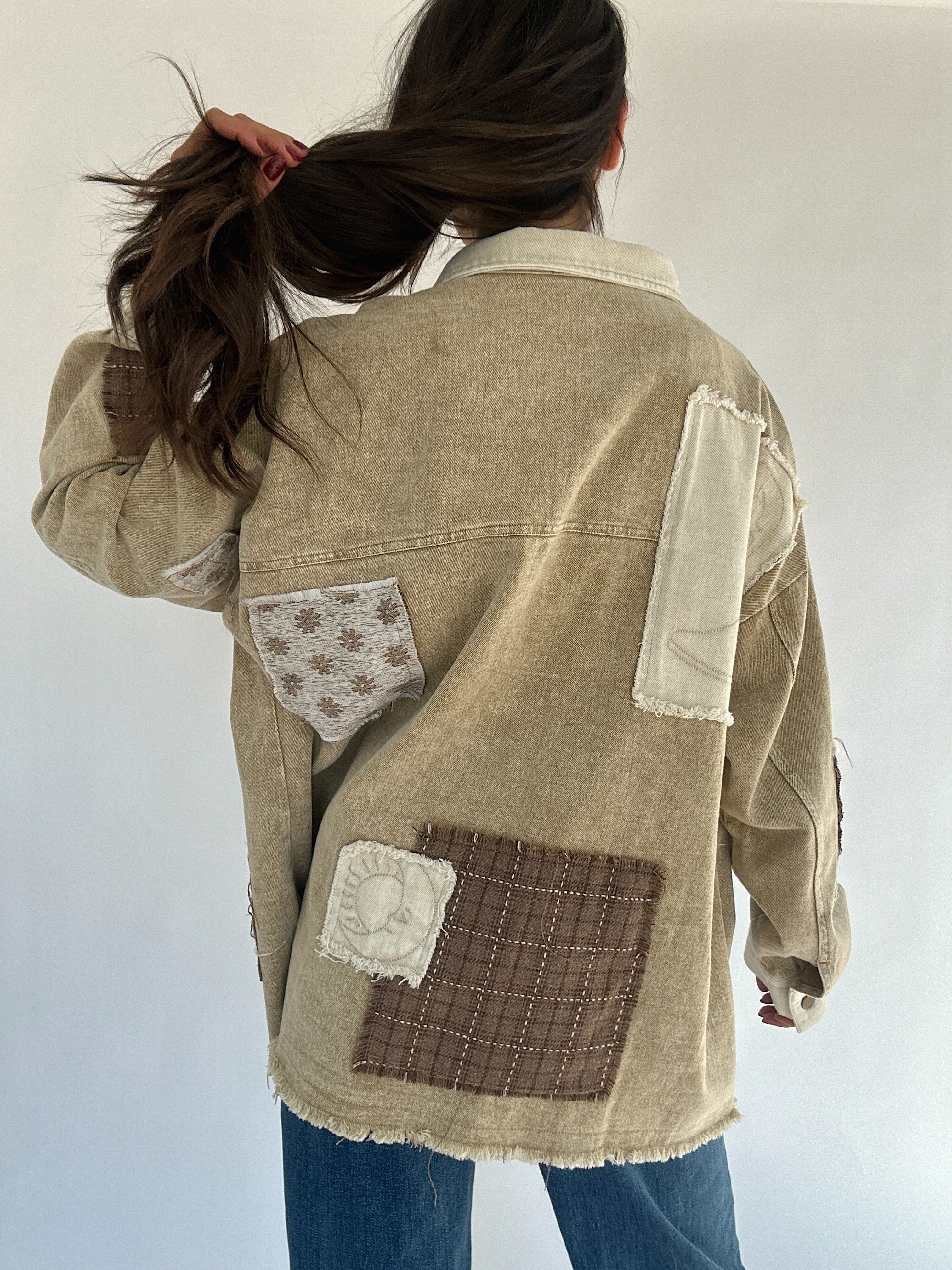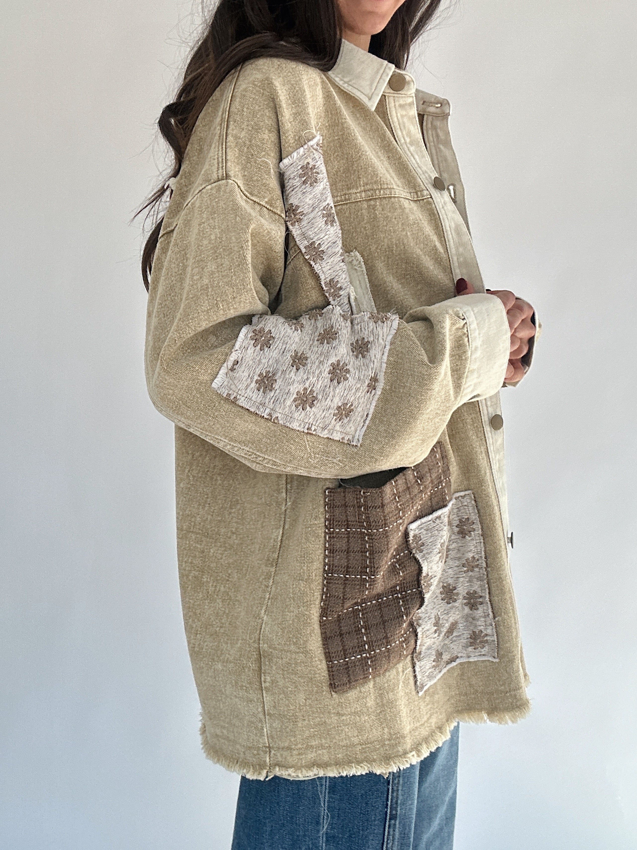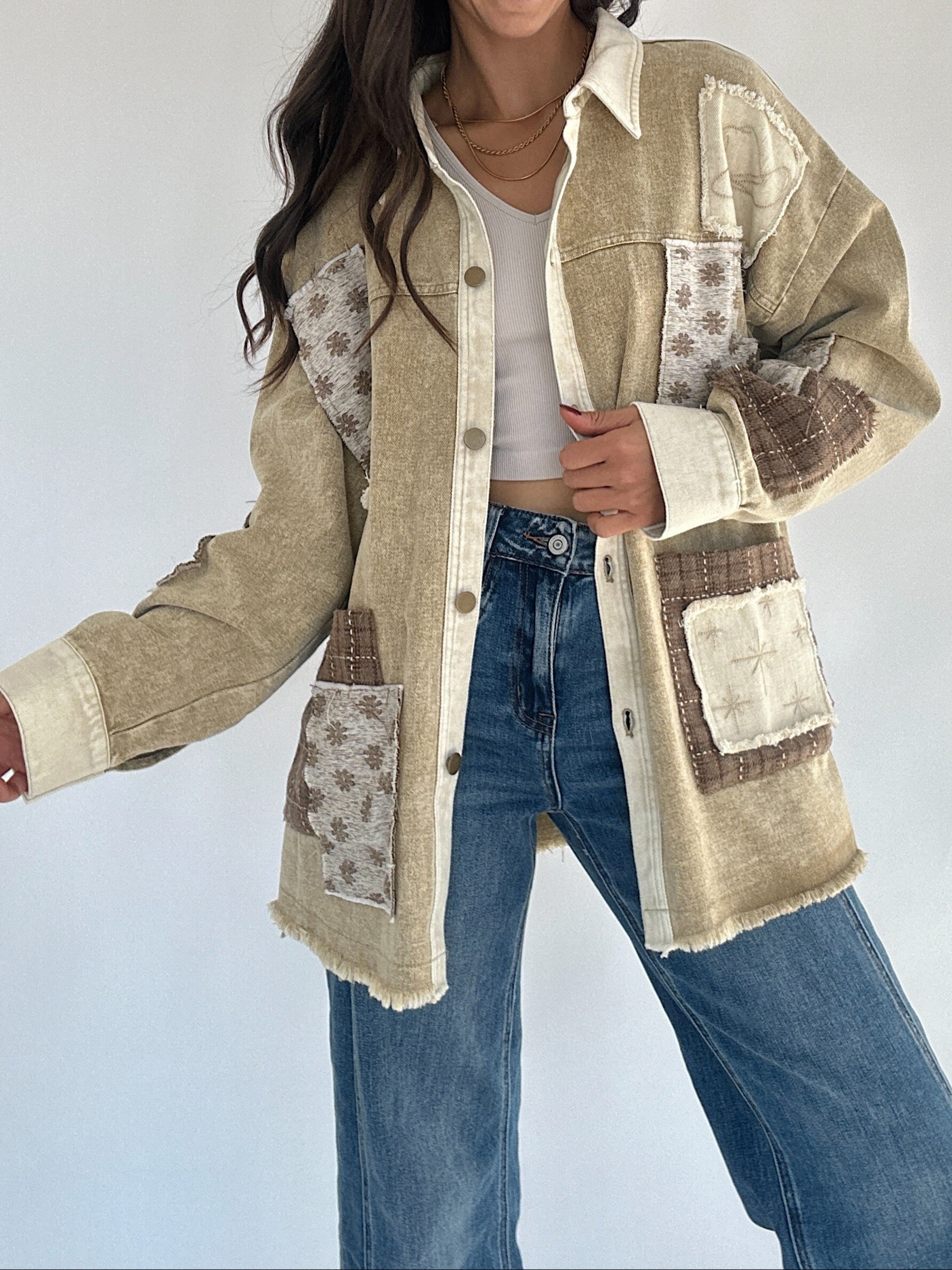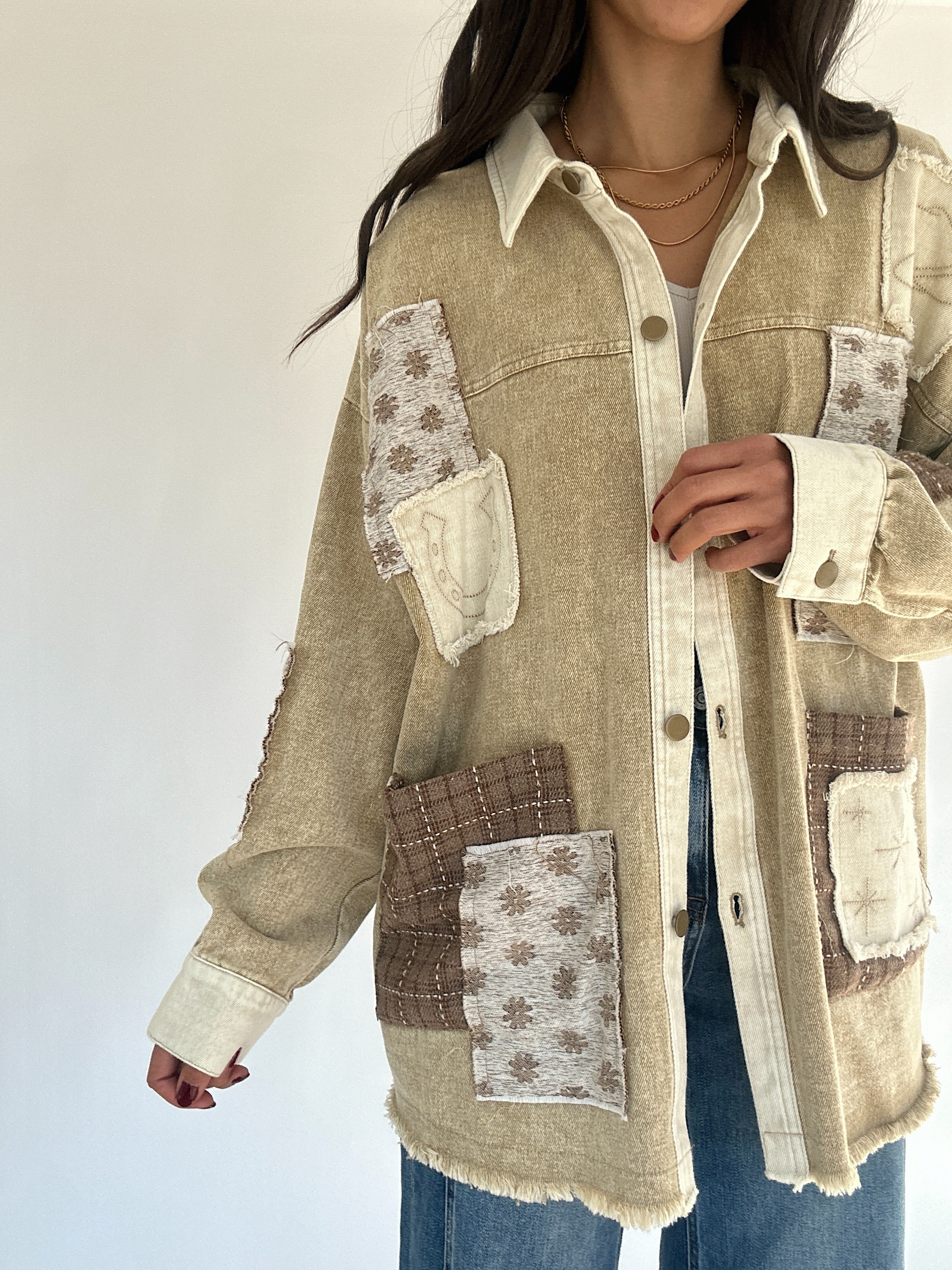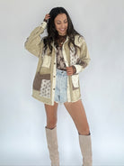 For the cowgirl at heart, this taupe shirt jacket has contrasting patchwork with embroidered western graphics: a cowboy boot and sun/moon patch on the back and horseshoe and cowboy hat on the front. It features a button front with patch pockets and an oversized fit. A fall season must have!