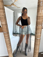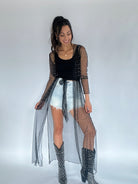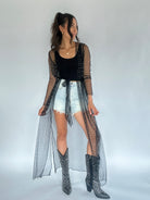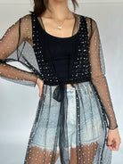 This black mesh duster embellished with rhinestones and pearls will make you feel like you're the main character of your own movie! It has a long silhouette, open front and sash tie. Throw over a tank and shorts for a concert or over a classic dress for your next event!