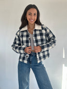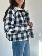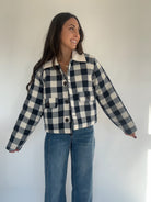 We are obsessed with this cutesy navy blue and ivory gingham plaid jacket! It has a slightly cropped and boxy fit with a contrasting corduroy collar and button front.