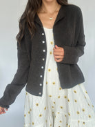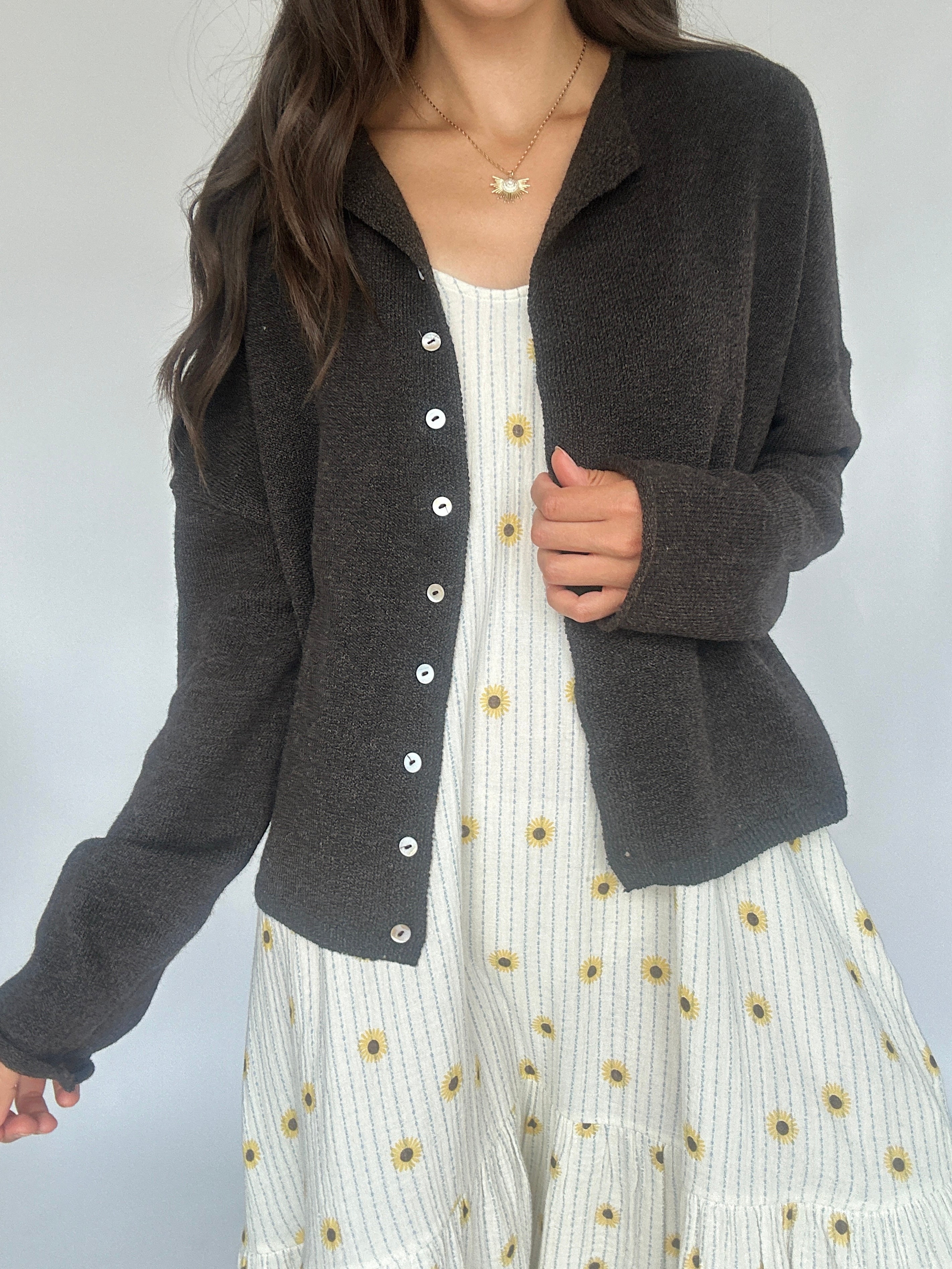 This chocolate brown cardigan is soft and light weight with a full button front and is the perfect layering piece. Or wear it alone with some jeans or wide leg pants!